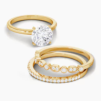 Collection of six luxurious gold lab-grown diamond rings displayed on a soft, neutral background with delicate feather-like accents. Each ring features a unique design: from double bands of pavé-set diamonds, to solitaire settings with oval, round, and emerald-cut center stones. The intricate gold bands are adorned with various styles of side stones, creating a cohesive yet diverse bridal or fashion ring set that sparkles under natural lighting.