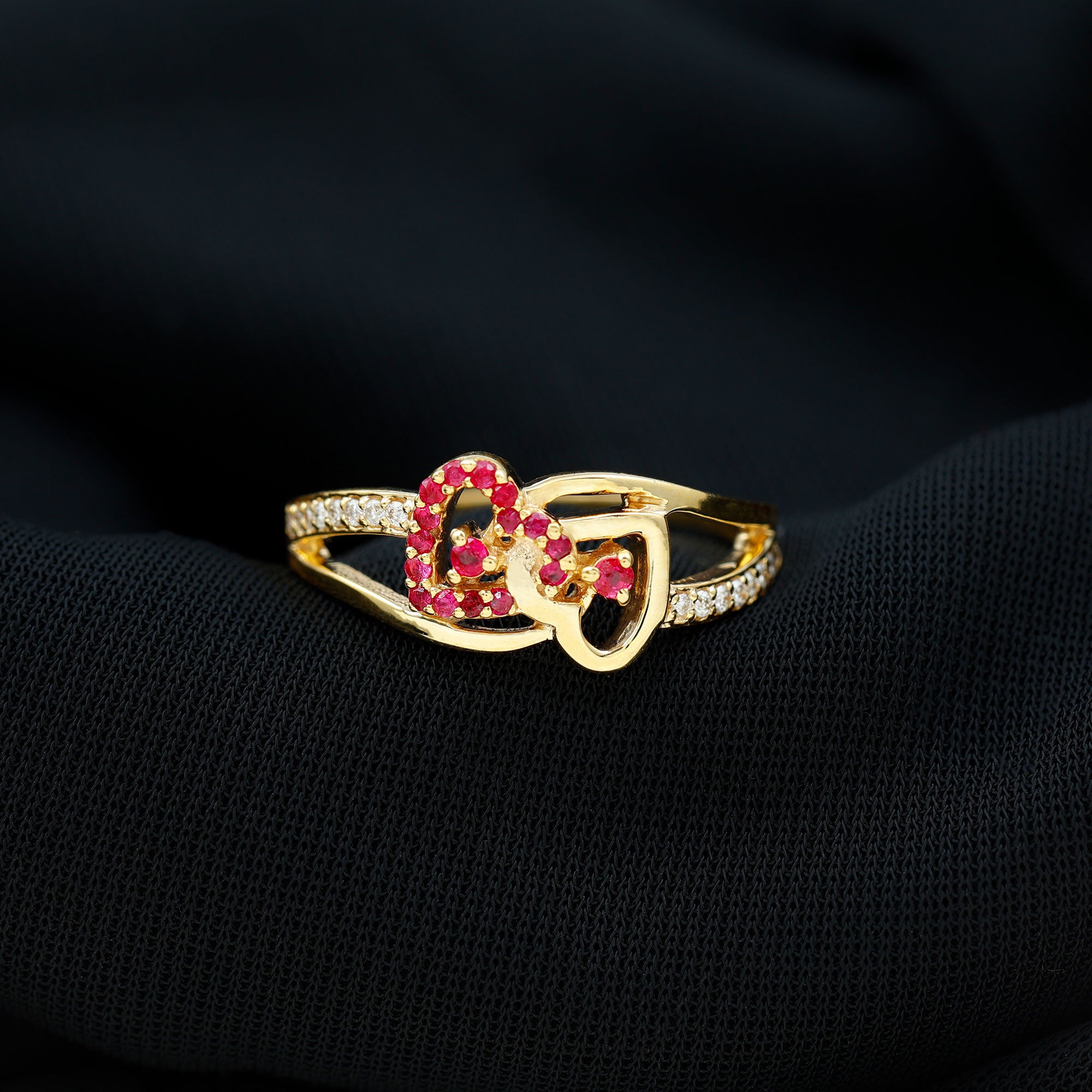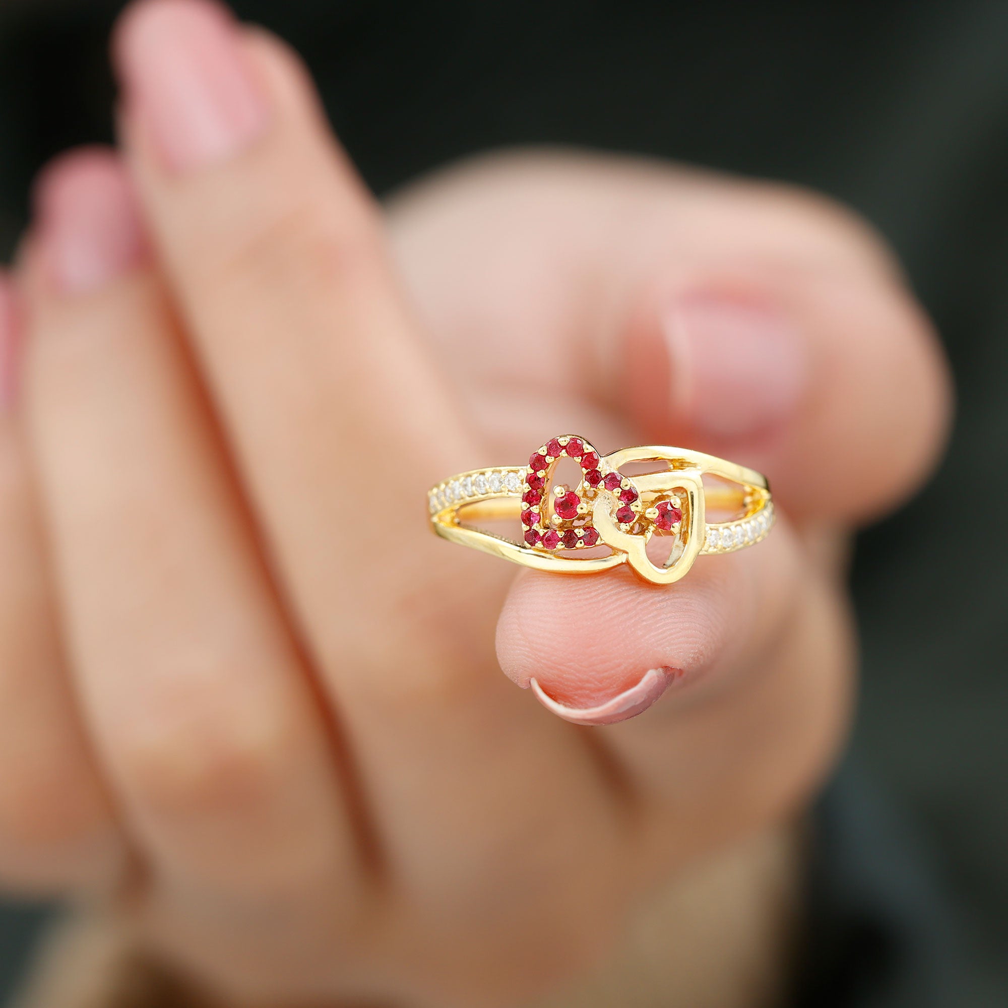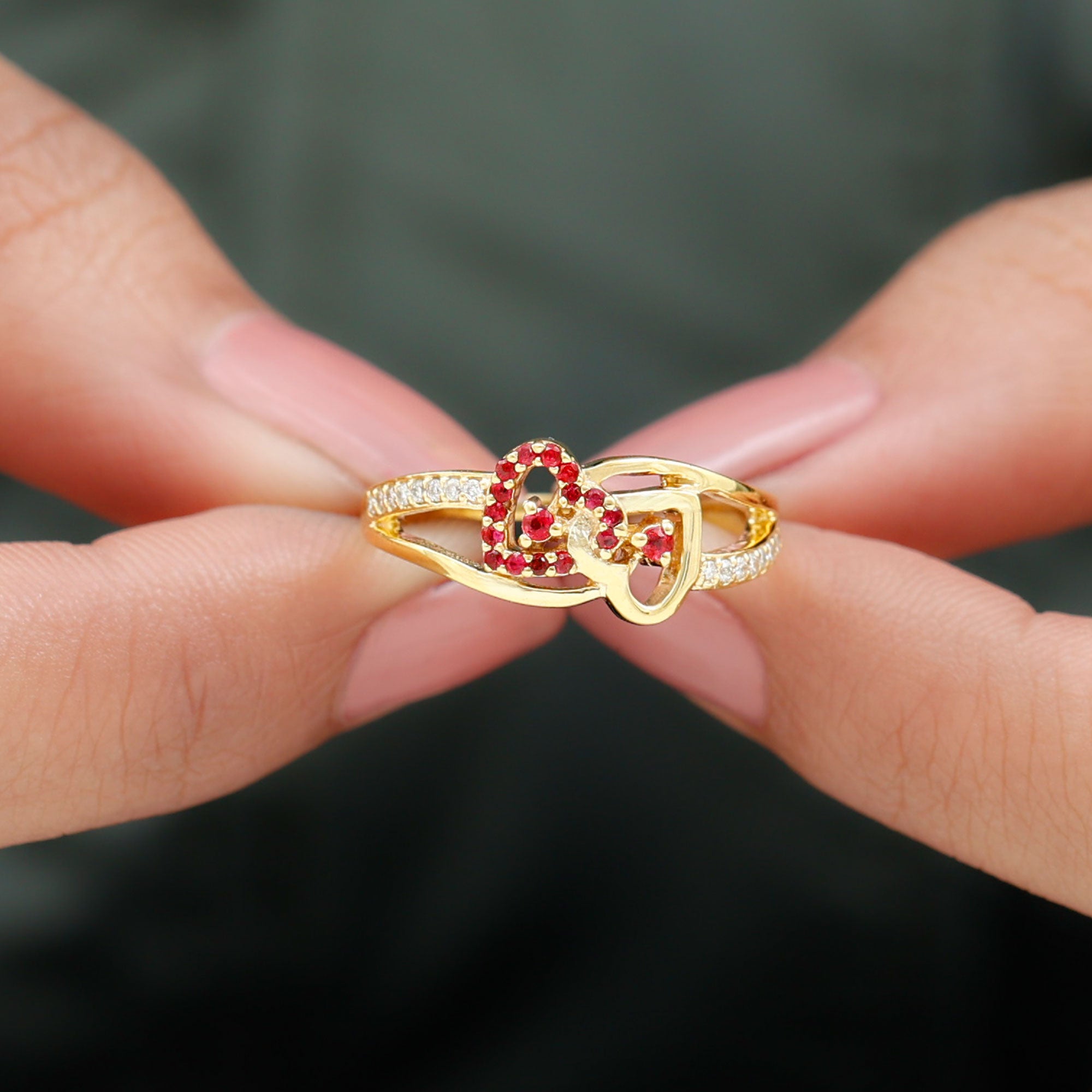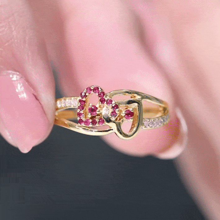 This Double Heart Ring is crafted with two hearts set with sparkling round-shaped ruby gemstones in a prong setting. The split shank band is adorned with precious round-shaped moissanite stones. The ruby-interlocked heart design is mounted on a shining solid gold metal band.