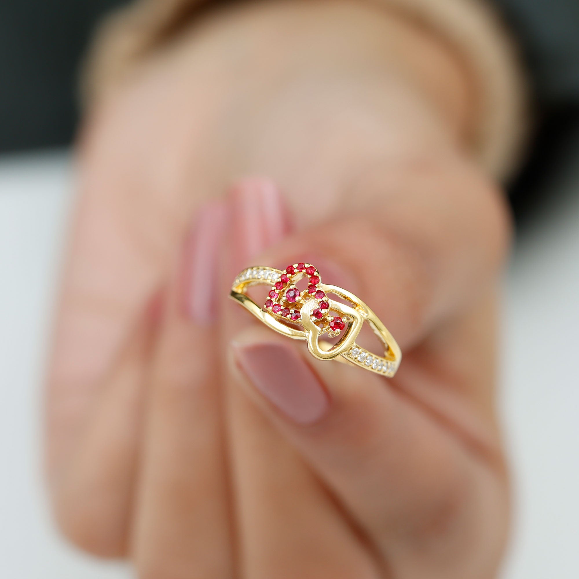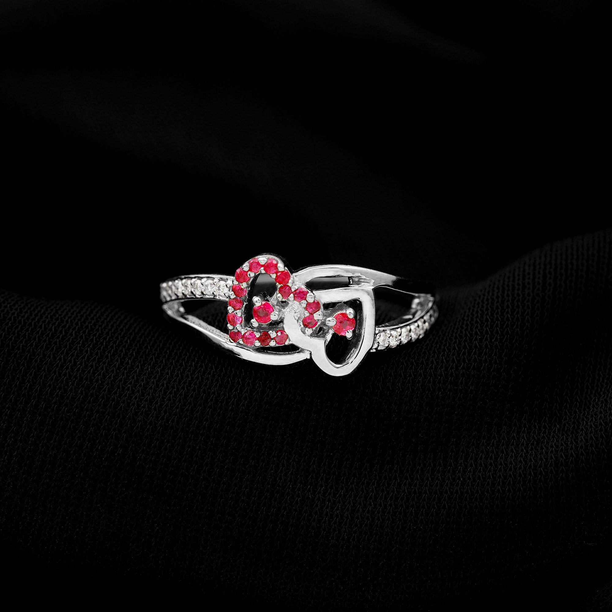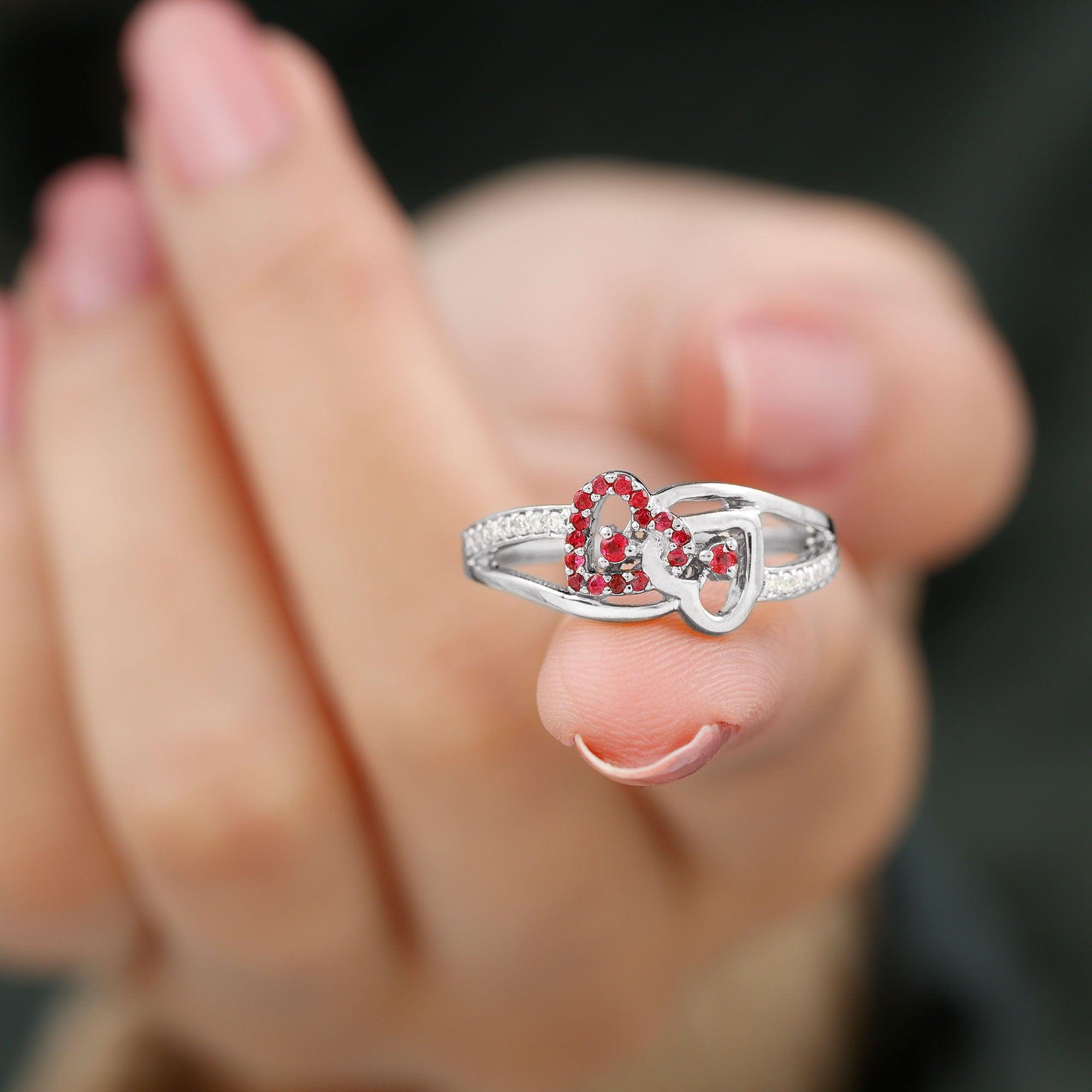 This Double Heart Ring is crafted with two hearts set with sparkling round-shaped ruby gemstones in a prong setting. The split shank band is adorned with precious round-shaped moissanite stones. The ruby-interlocked heart design is mounted on a shining solid gold metal band.
