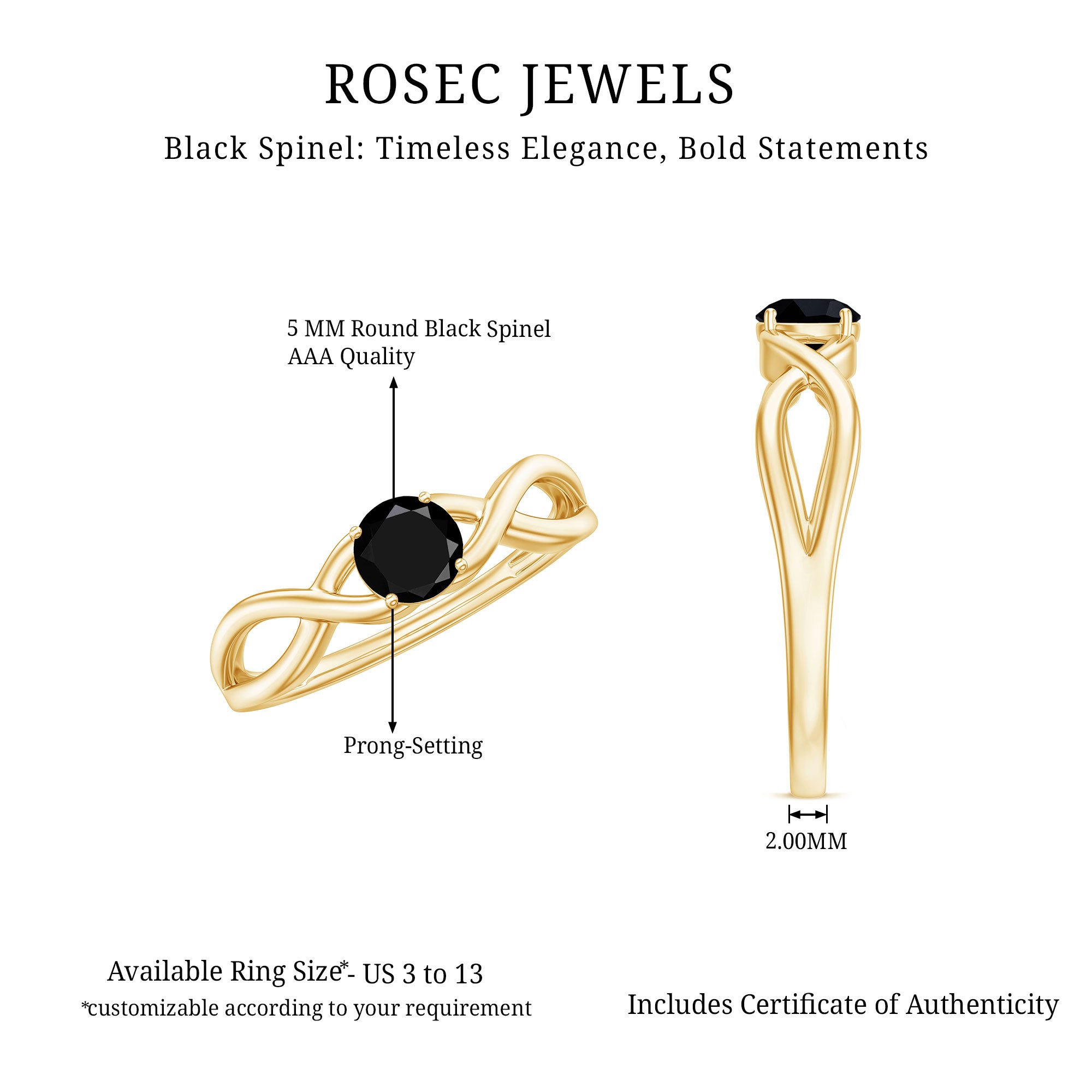 Adorned with a Round Cut Black Spinel creating a solitaire design, this Classic Ring makes for a magnificent choice to mark the big day of your life. Black Spinel in the center of crossover shank give a charming appeal to this Black Spinel Ring, crafted in gold.