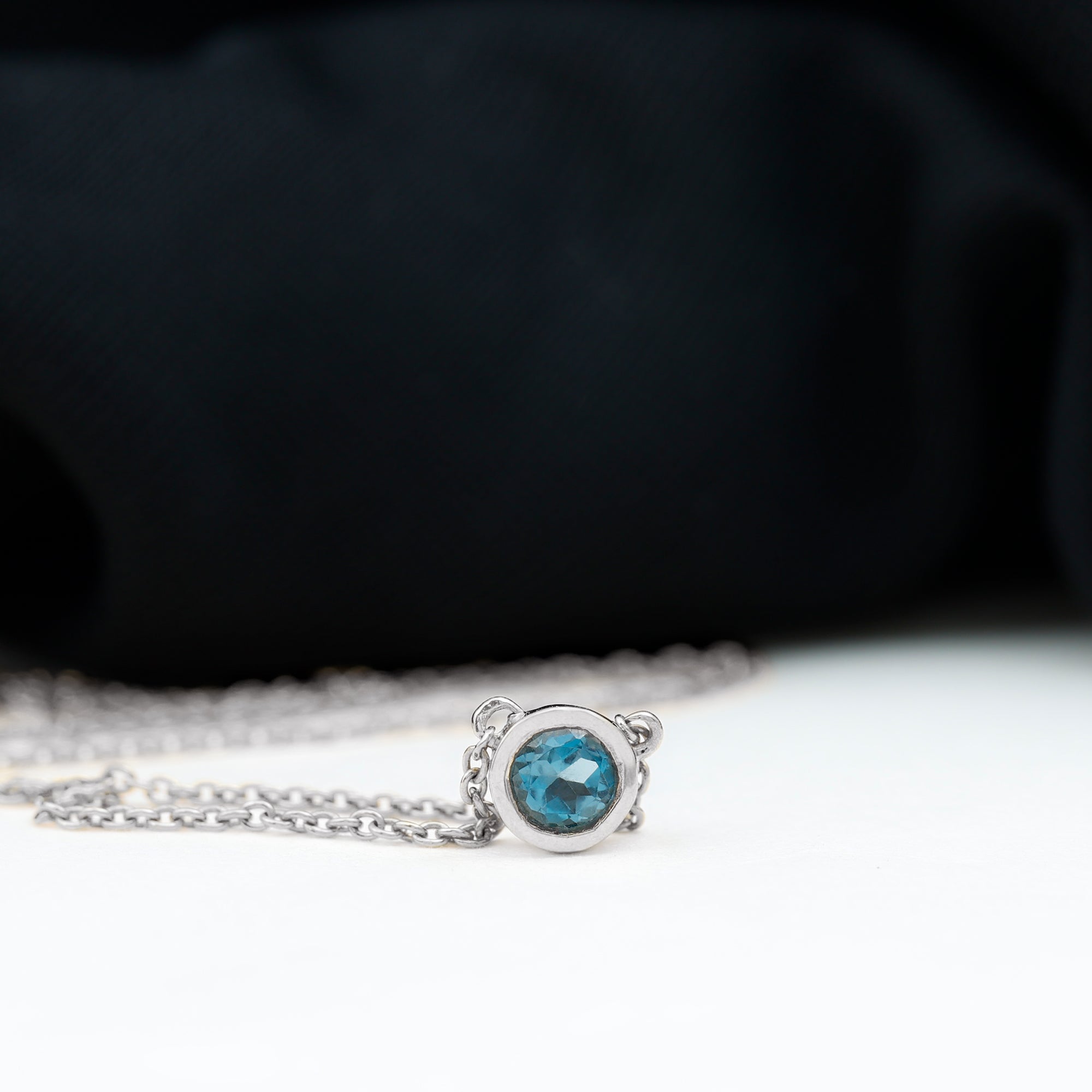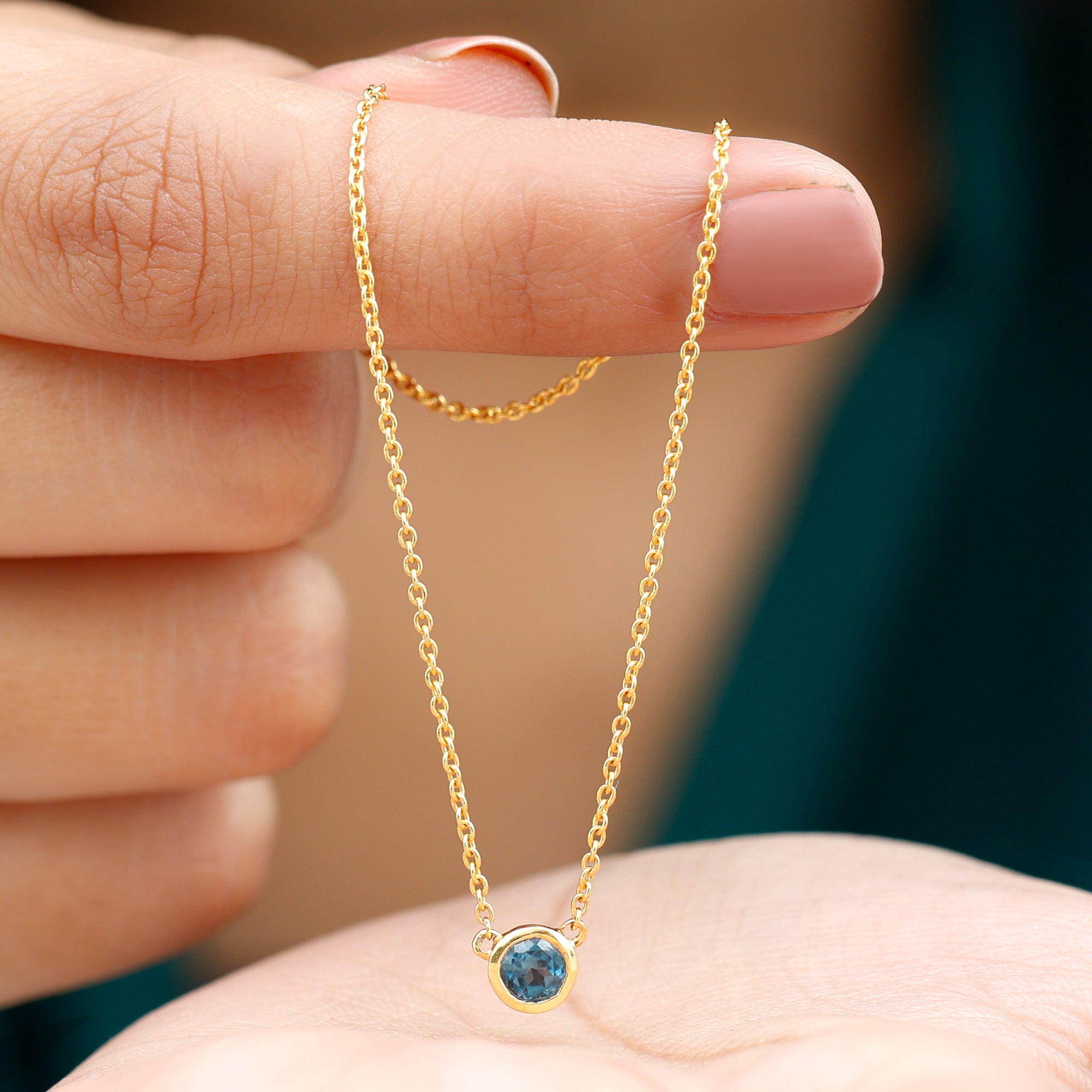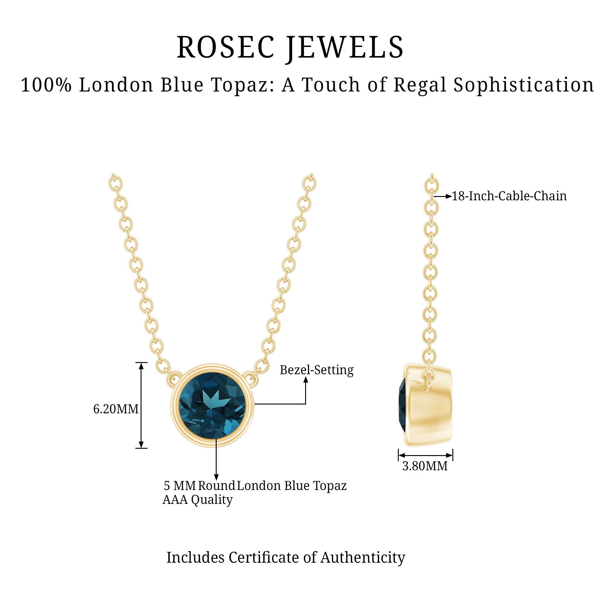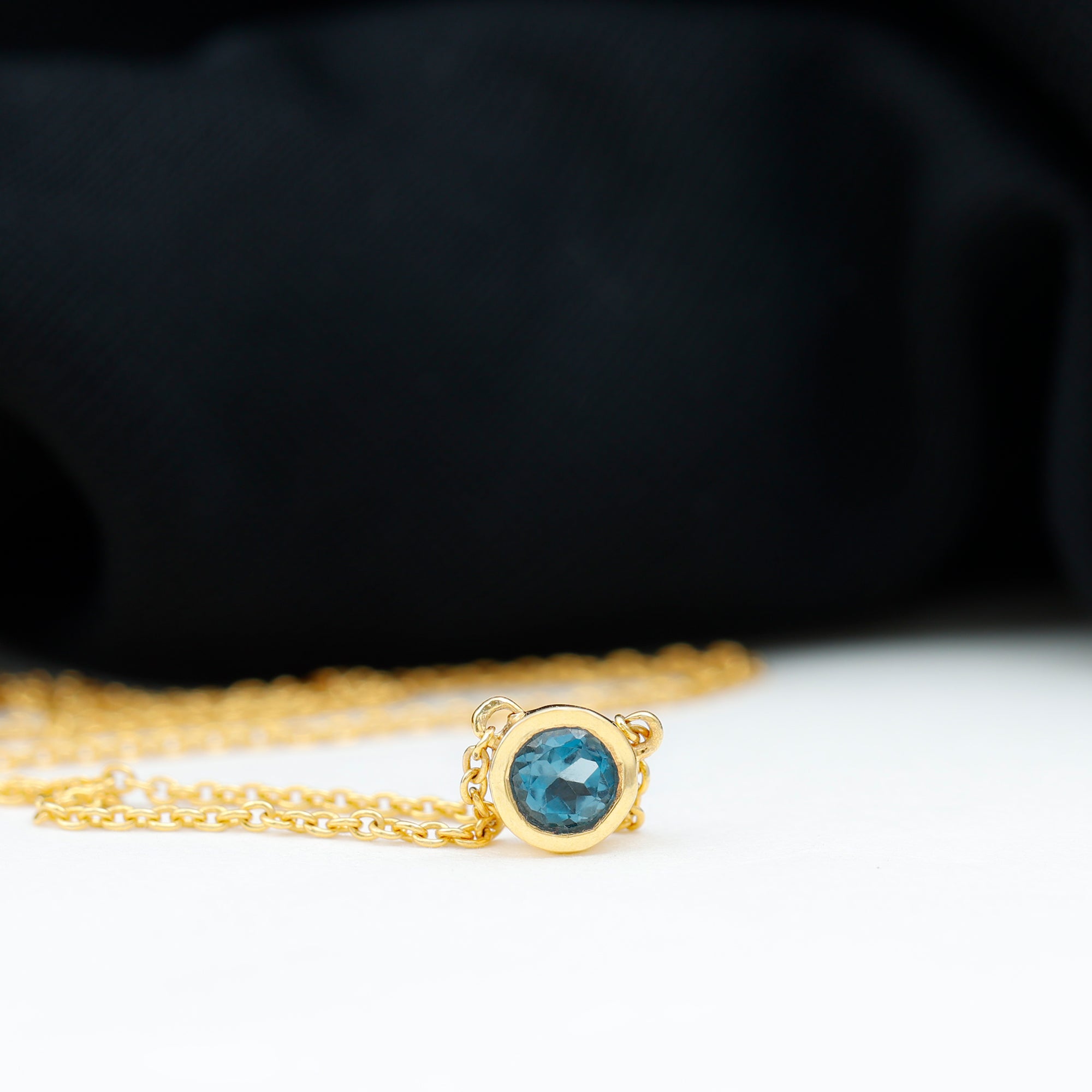 Enhance your style with the captivating Gold Pendant Necklace embellished with a Round Cut London Blue Topaz elegantly showcased in a Bezel Setting. This exquisite 5 MM London Blue Topaz Solitaire Necklace is a unique and eye-catching piece that will beautifully complement any womans attire.