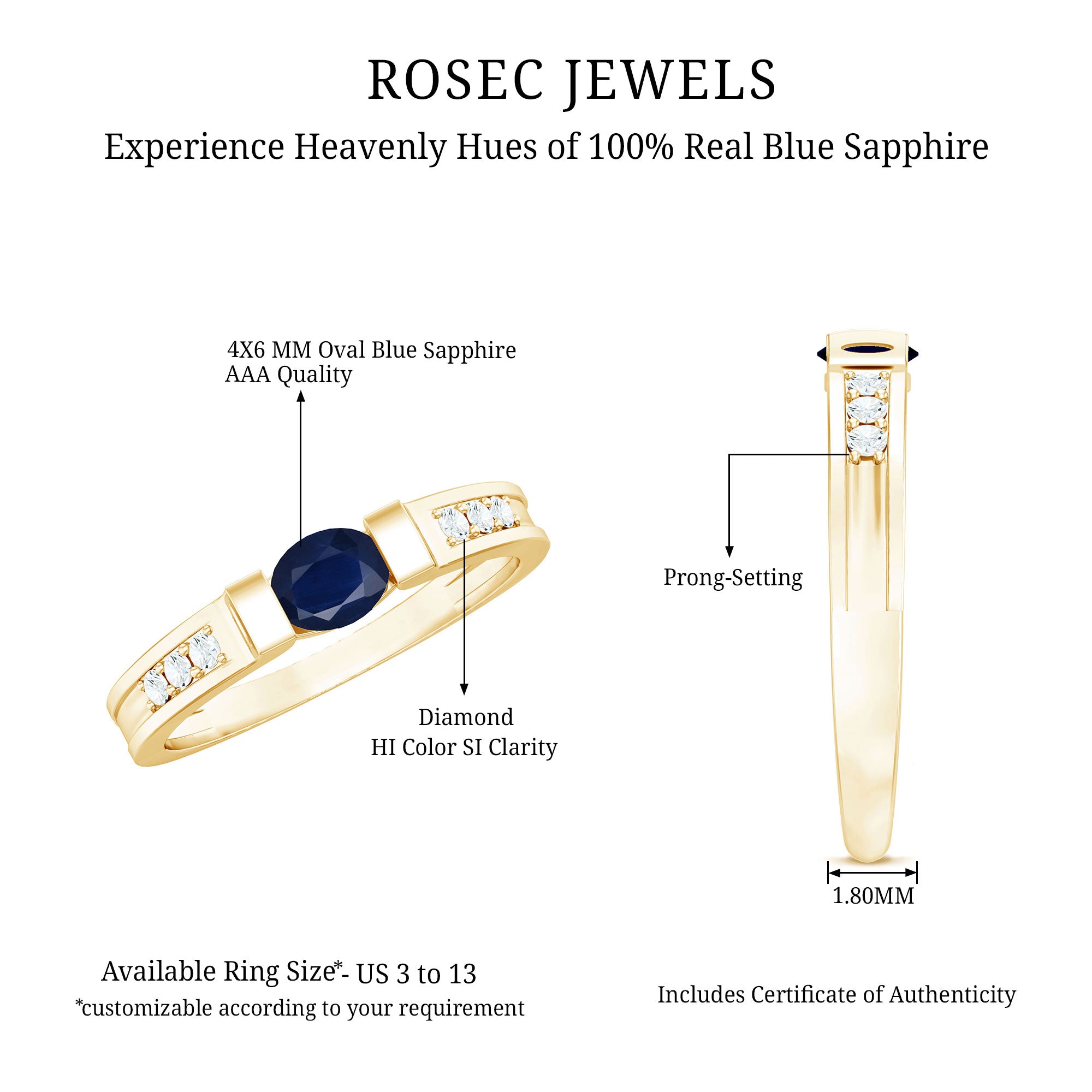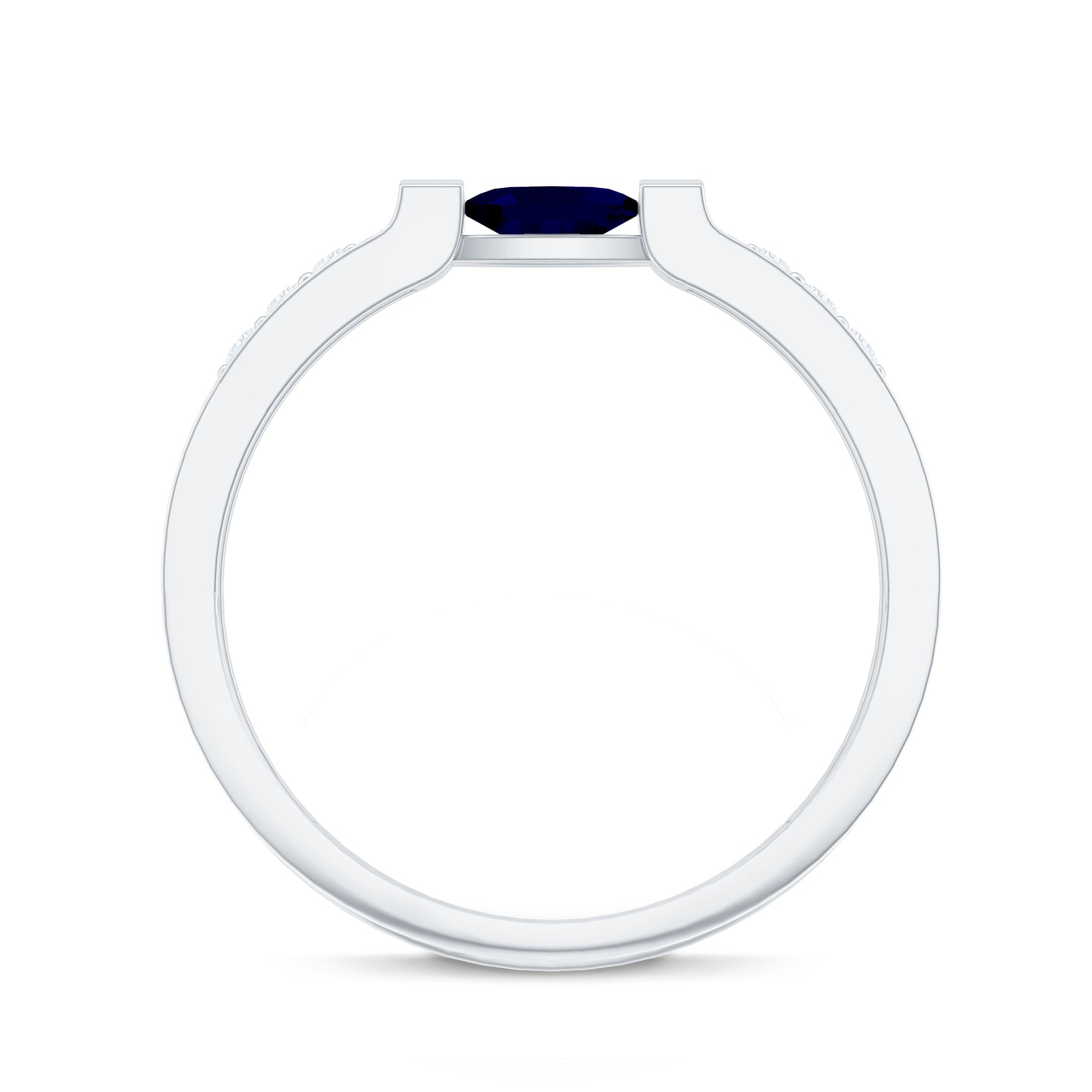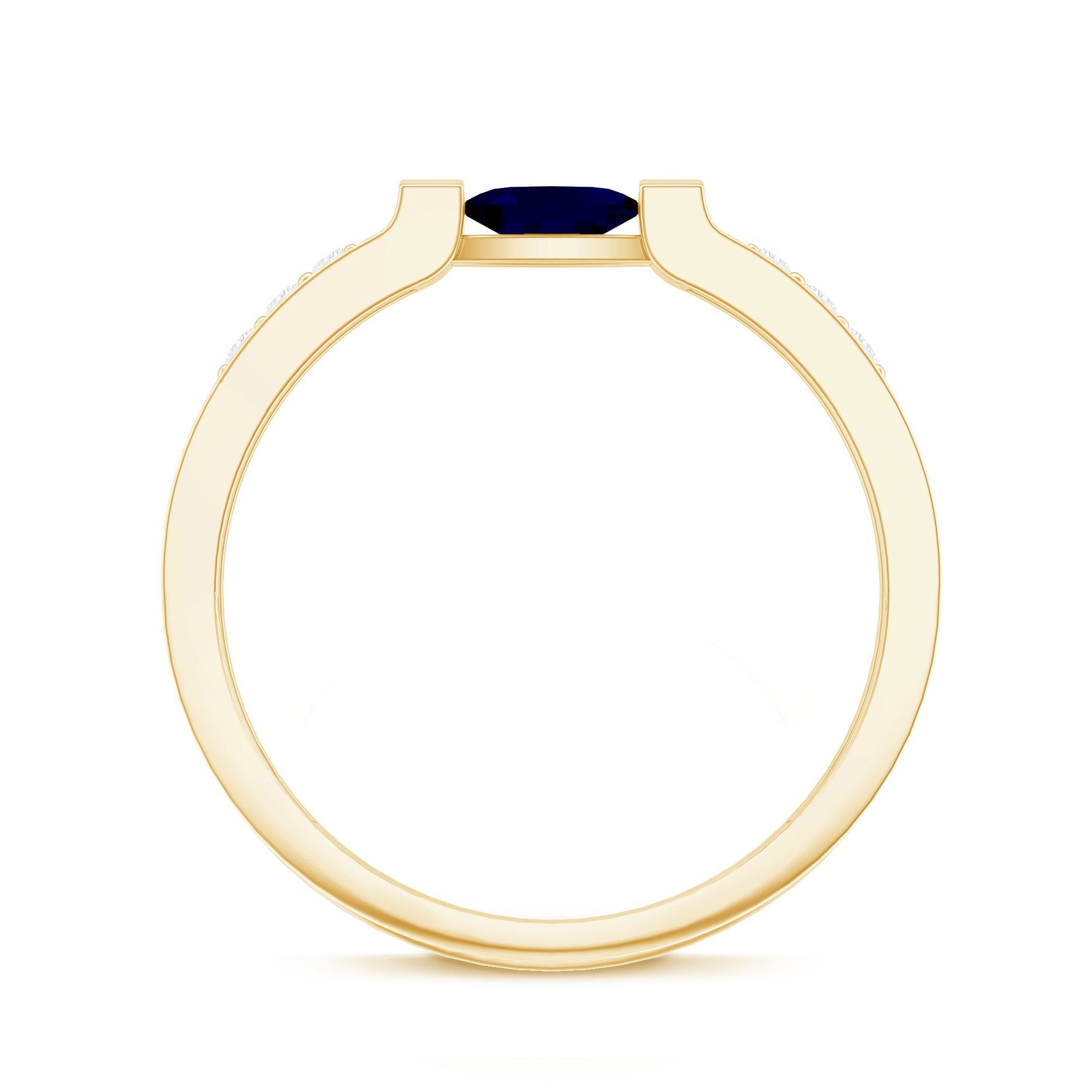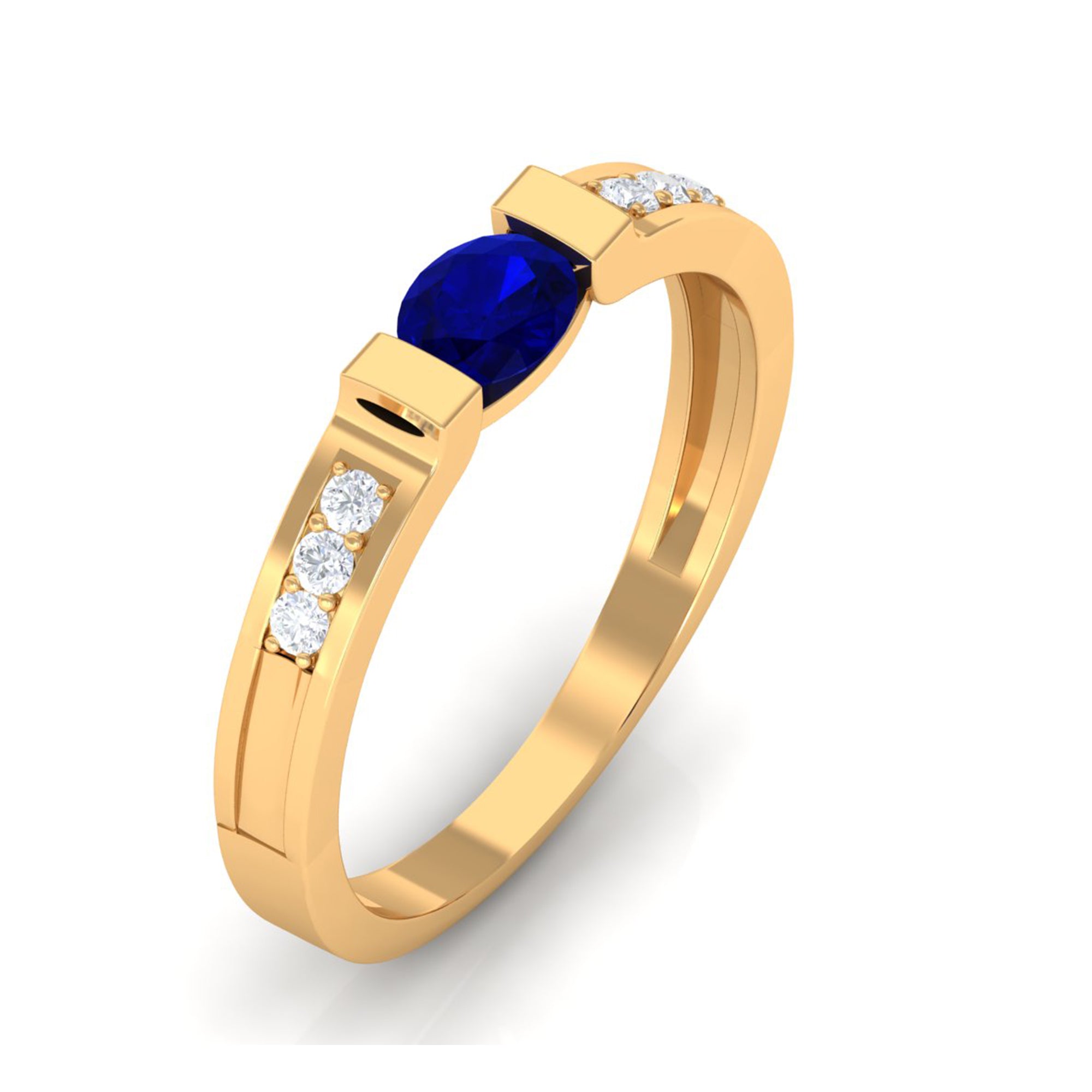 Make a statement with this sparkling Blue Sapphire Solitaire and Diamond Side Stone Ring. Featuring an oval-cut blue sapphire set in a bar setting, this solid gold ring is perfect for making a statement on any occasion.