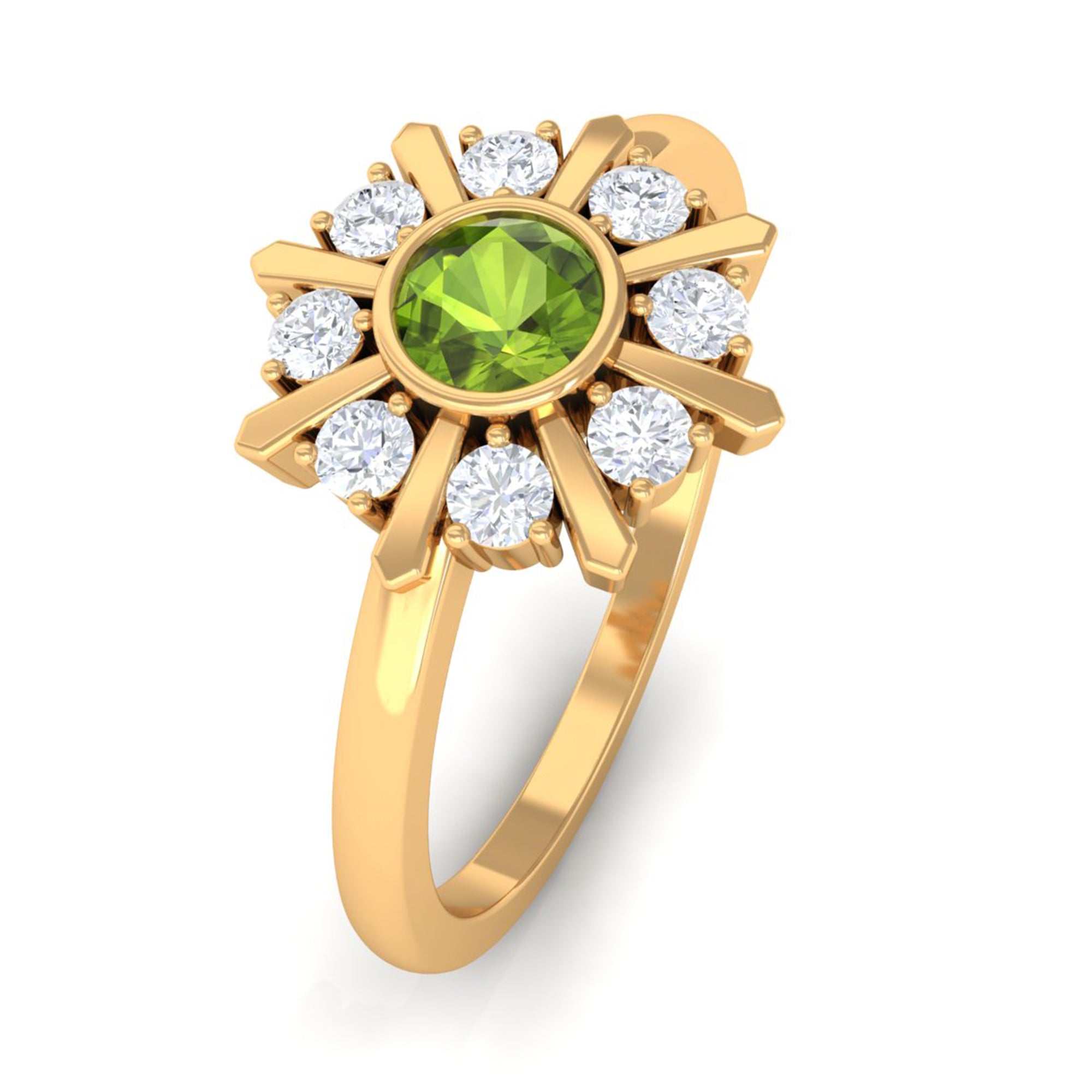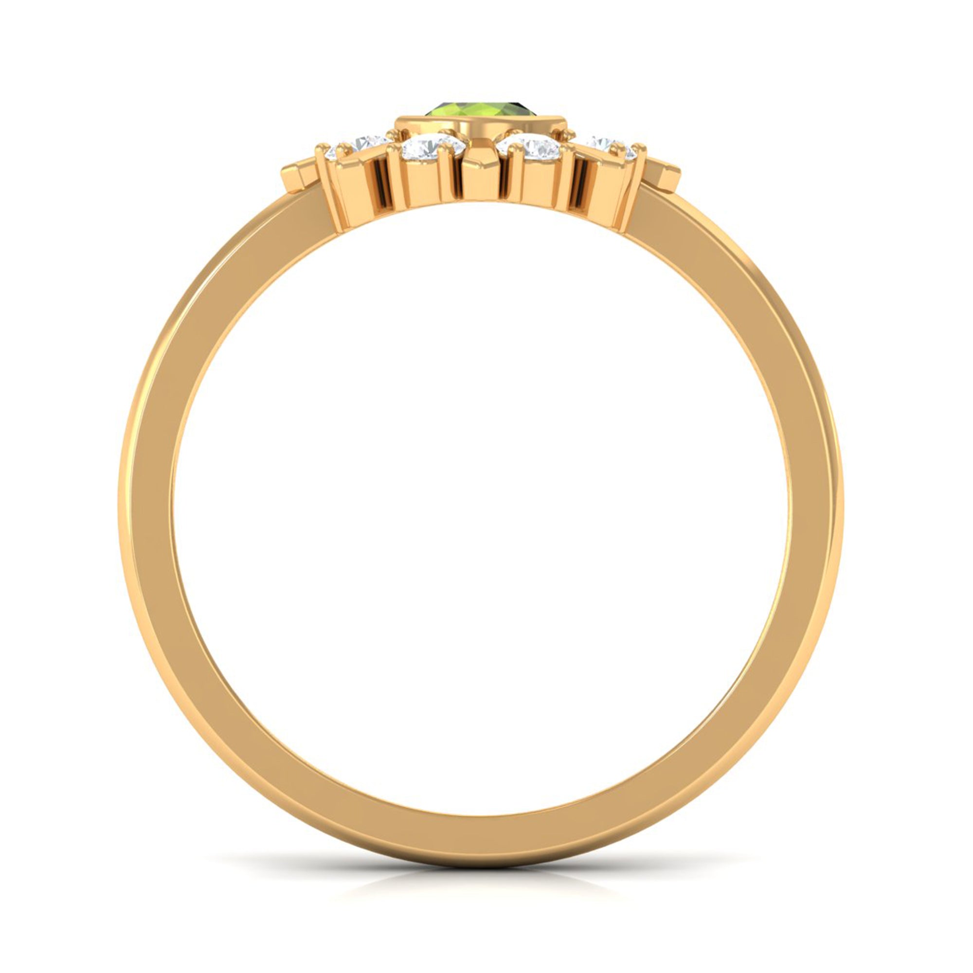 Strike out a wonderful statement by wearing this elegant Statement Ring embellished with Round Shape Peridot in Bezel Setting and encircled with Diamond Stones. This Peridot and Diamond Ring is crafted with Gold to create an enchanting piece. This Peridot Green Ring will bring you into the limelight.