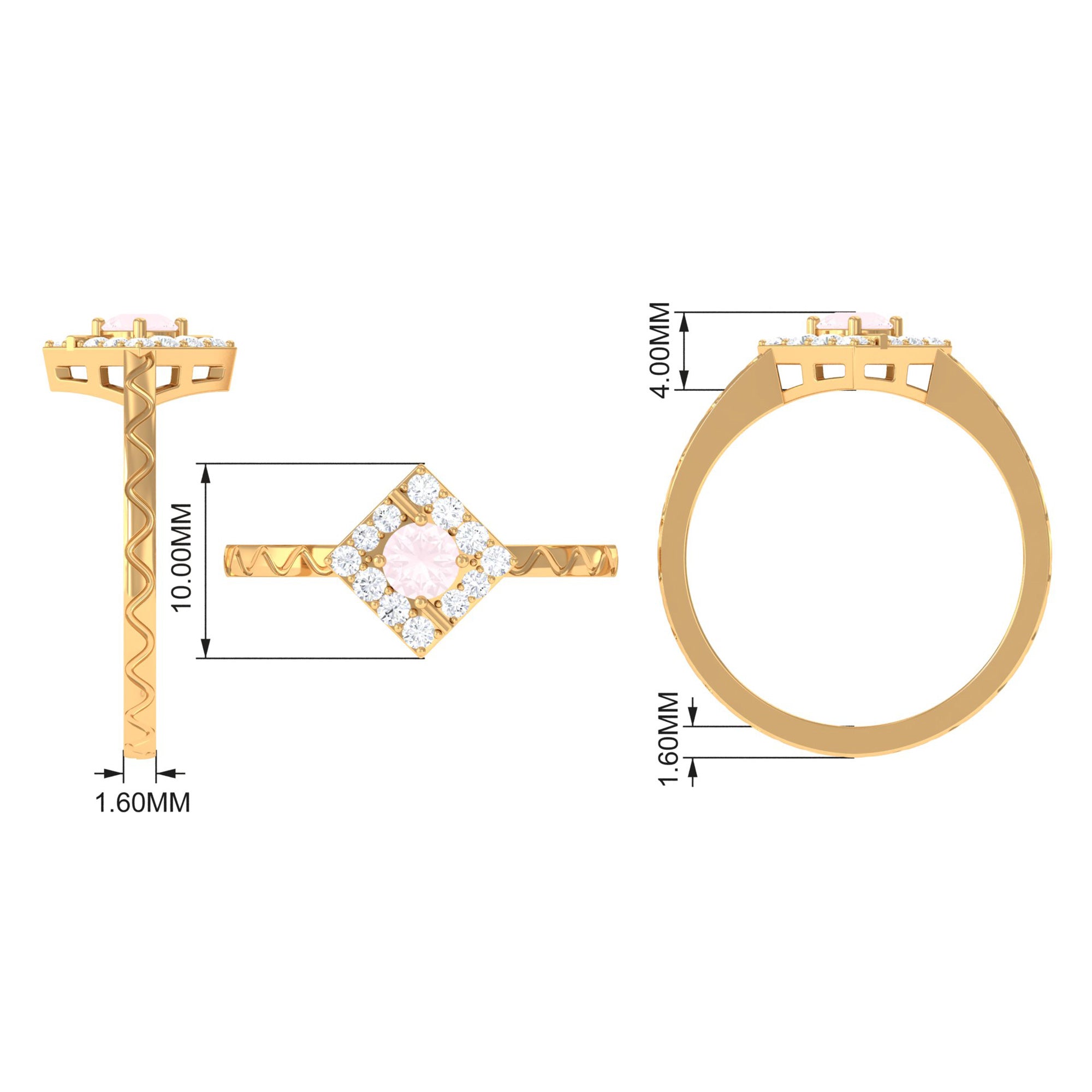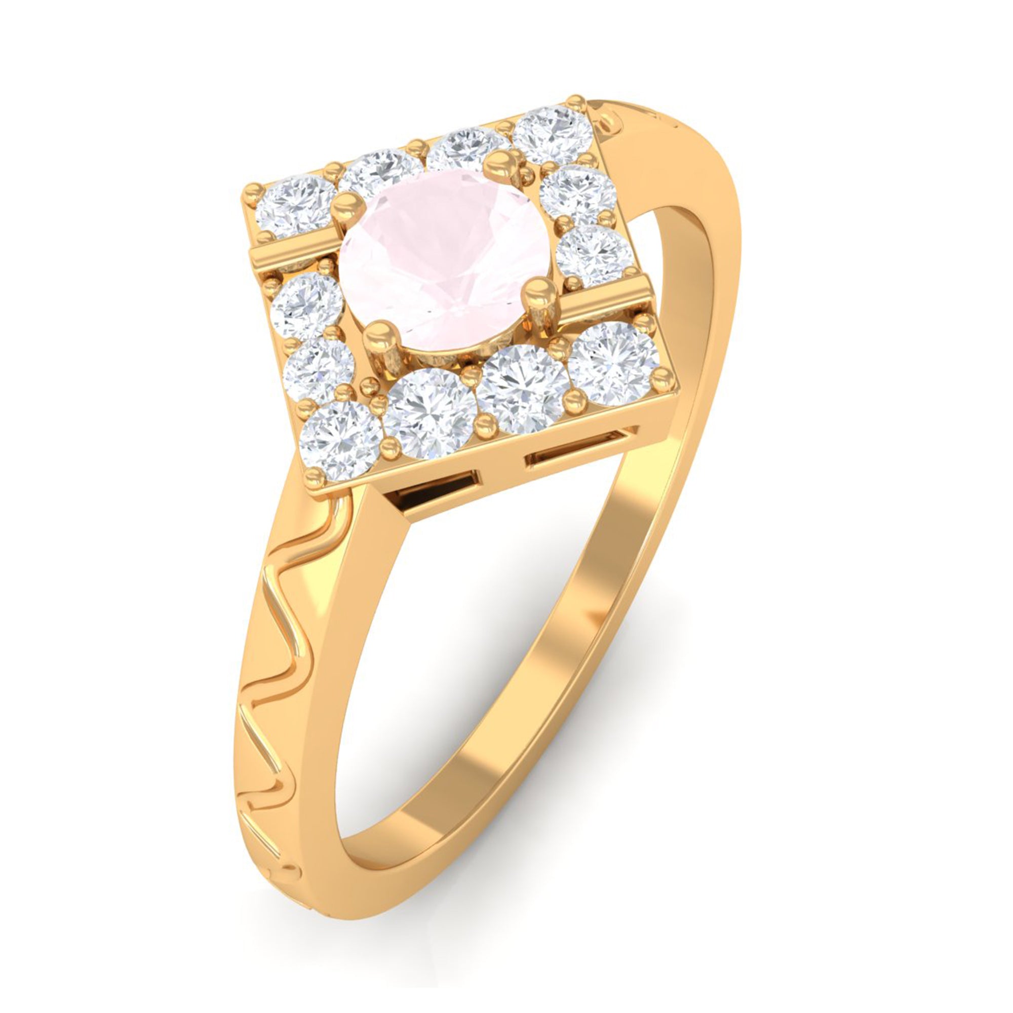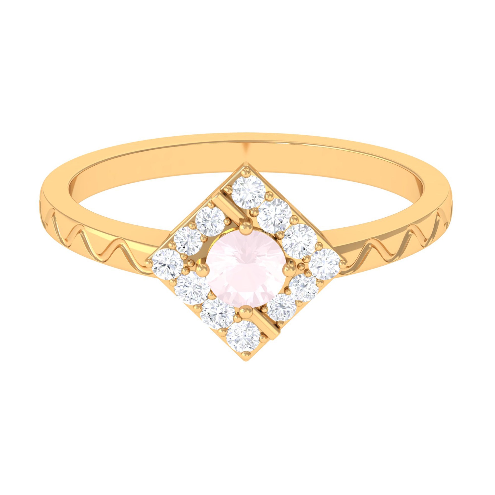Create a trendy look by wearing this elegant Minimal Textured Ring embellished with Round Shape Rose Quartz in Prong Setting with Diamond to maximize its shine. This Rose Quartz and Diamond Ring is crafted with Gold and will leave an everlasting impression. Surprise your special person with this Pink Quartz Ring and make her heart flutter.