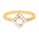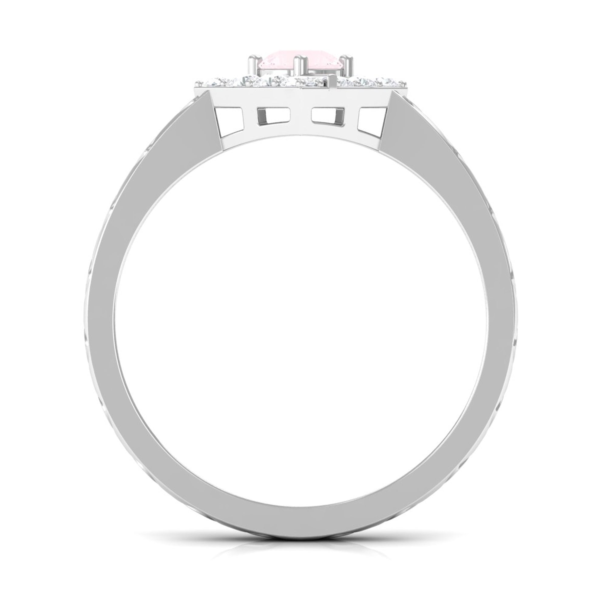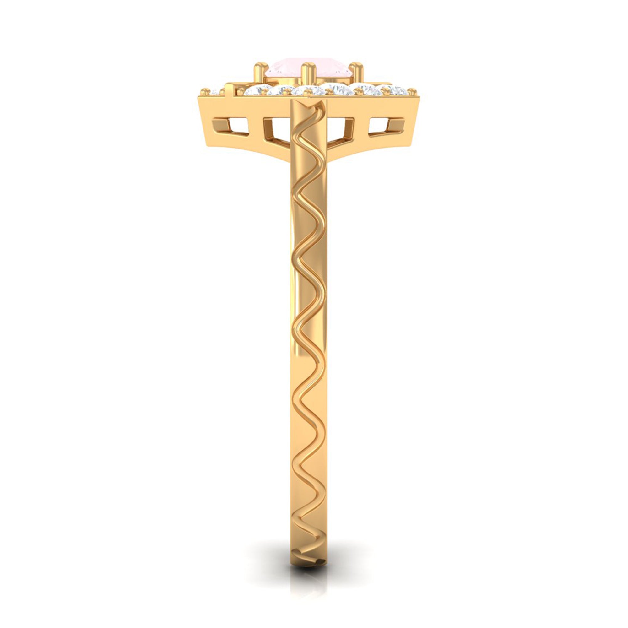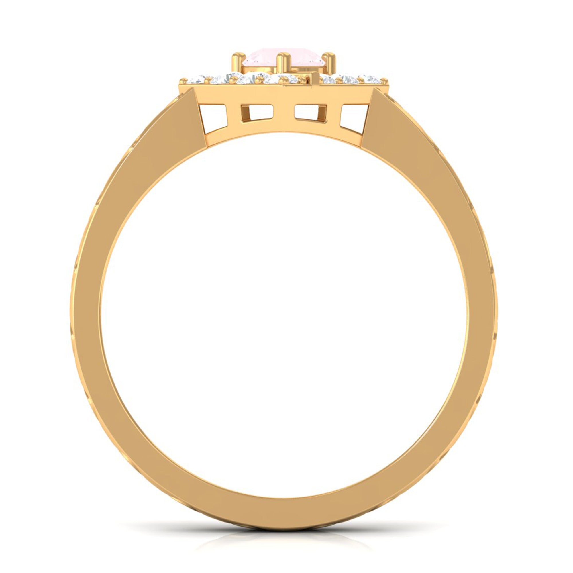 Create a trendy look by wearing this elegant Minimal Textured Ring embellished with Round Shape Rose Quartz in Prong Setting with Diamond to maximize its shine. This Rose Quartz and Diamond Ring is crafted with Gold and will leave an everlasting impression. Surprise your special person with this Pink Quartz Ring and make her heart flutter.