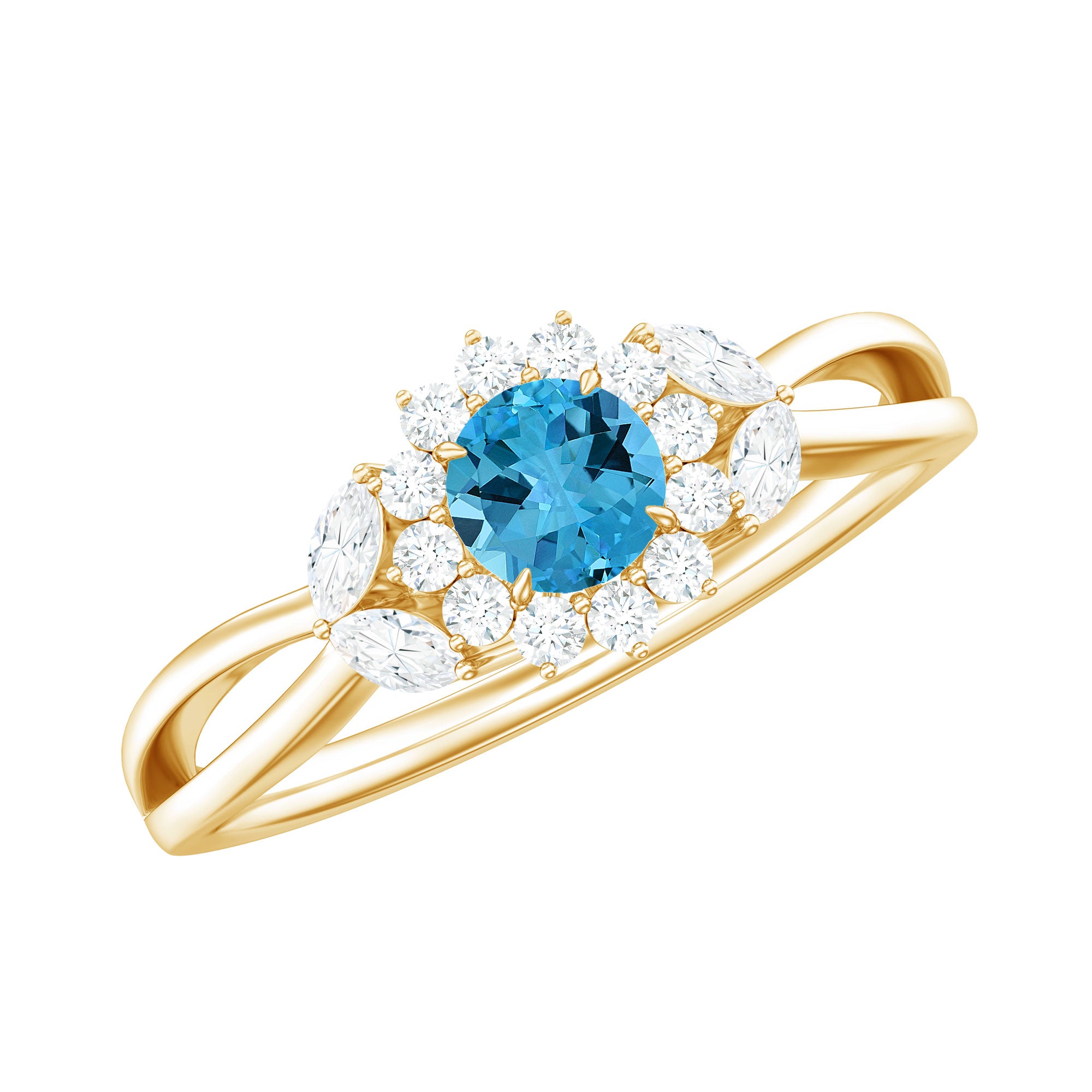 Grab everyones attention by wearing this elegant Floral Engagement Ring on your special day. This Engagement Ring is embellished with Round Shape Swiss Blue Topaz in Claw Set with Round and Marquise Cut Diamond Accent. This Swiss Blue Topaz Engagement Ring is crafted with Gold and will stun everyone with its shine and grace.