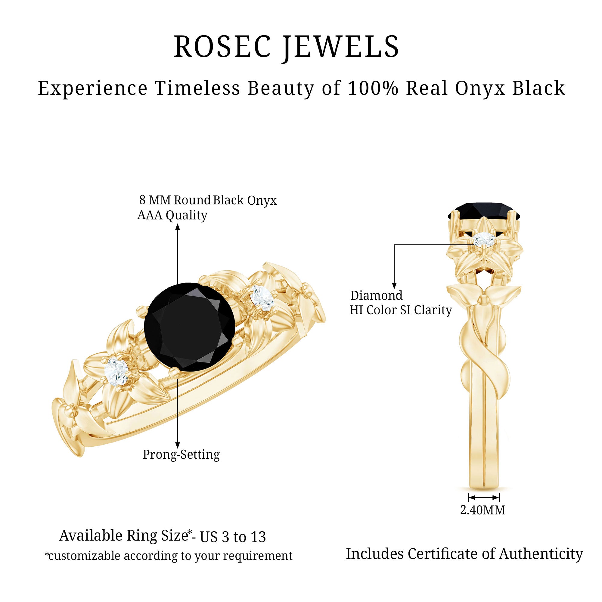 Just like love that blooms with time, this Black Onyx Flower Ring is a graceful reminder of growth, beauty, and connection. At the center of the Floral Engagement Ring sits a dazzling 8 MM round cut black onyx of AAA quality, held securely in prong setting. What makes this Black Onyx Engagement Ring truly special is the intricate floral design that flows along the band. Each flower is carefully crafted and accented with small round cut diamonds that sparkle gently with every movement. These tiny HI-SI quality diamonds bring a soft shimmer to the Nature Inspired Engagement Ring. This Black Onyx and Diamond Ring is a perfect choice for anyone who loves jewelry that tells a story. It wraps around the finger like a blooming garden, symbolizing love that keeps growing stronger over time. Thoughtfully made and designed for both elegance and comfort, it is available in US ring sizes from 3 to 13. It comes ready to gift in a lovely jewelry box, making it ideal for special moments like Valentines Day, a birthday, or even just a reminder of love.