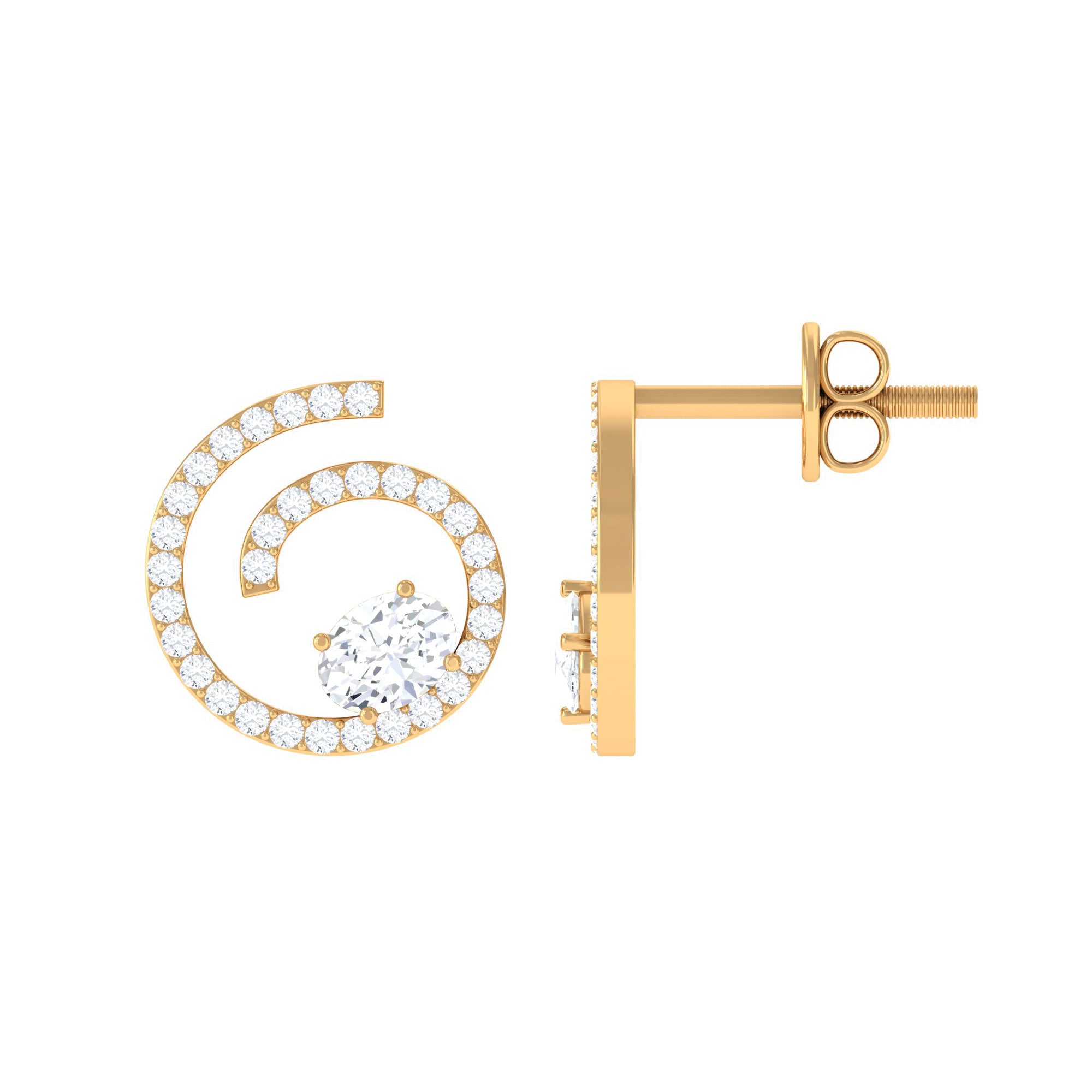 Adorn yourself in style with these elegant Swirl Stud Earrings, featuring a unique combination of oval and round cut Moissanite stones set in a prong setting. Made from gold and with a secure screw back, these Moissanite Spiral Earrings are perfect for any occasion.