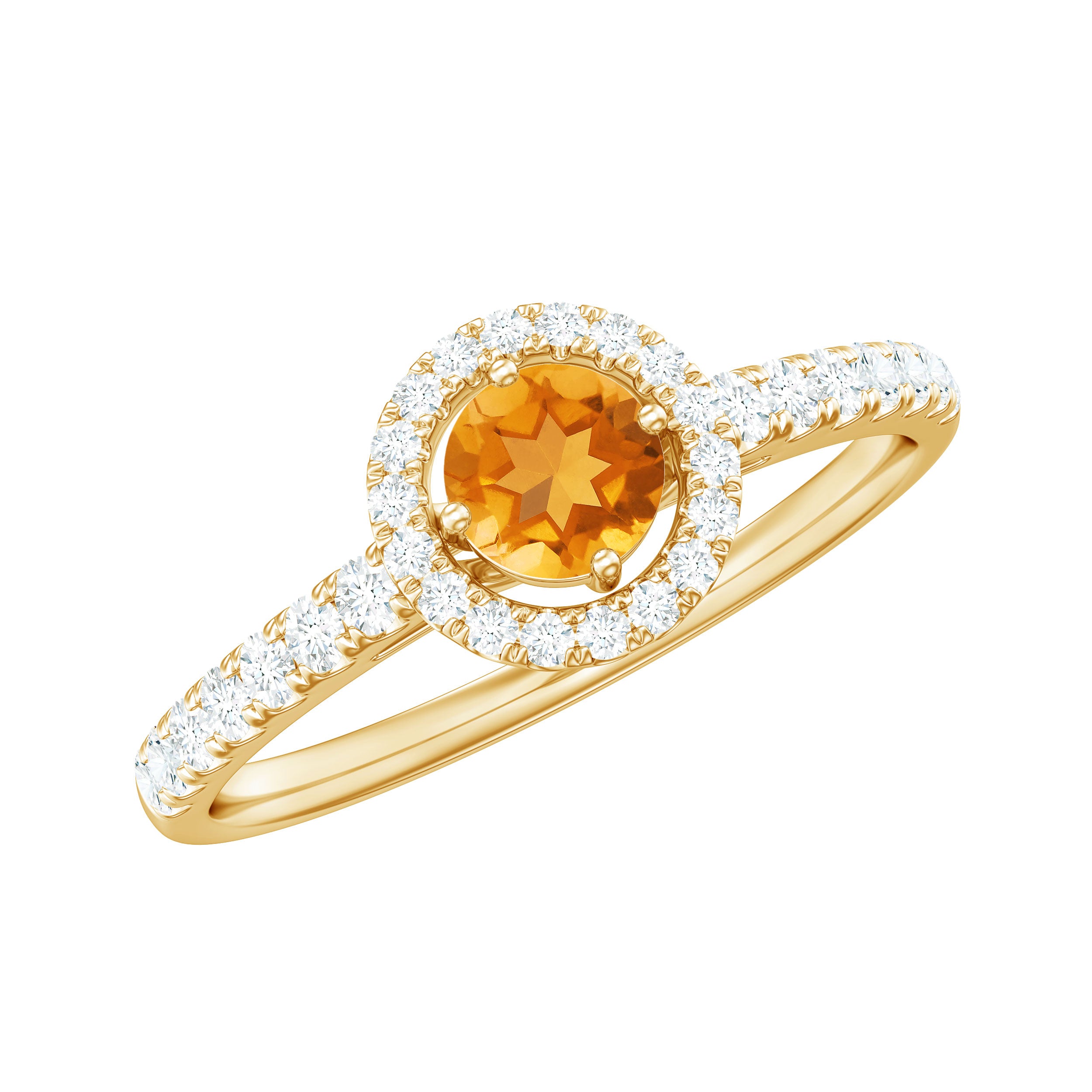 Classic Engagement Ring is the captivating piece encased with Round Shape Citrine set as Solitaire and Diamond are Studded as in halo and Side Stones. This Lovely Engagement Ring is crafted in Solid Gold.