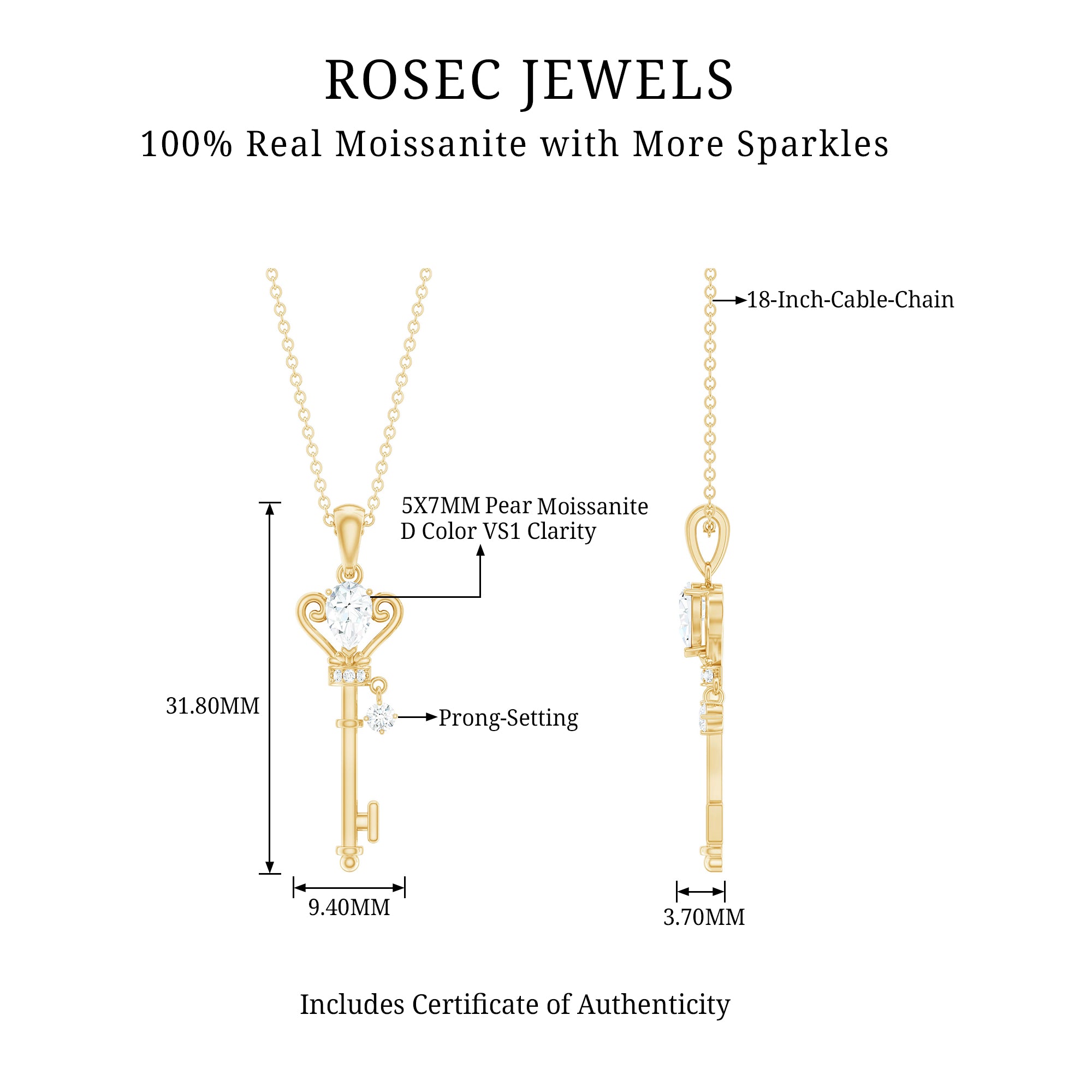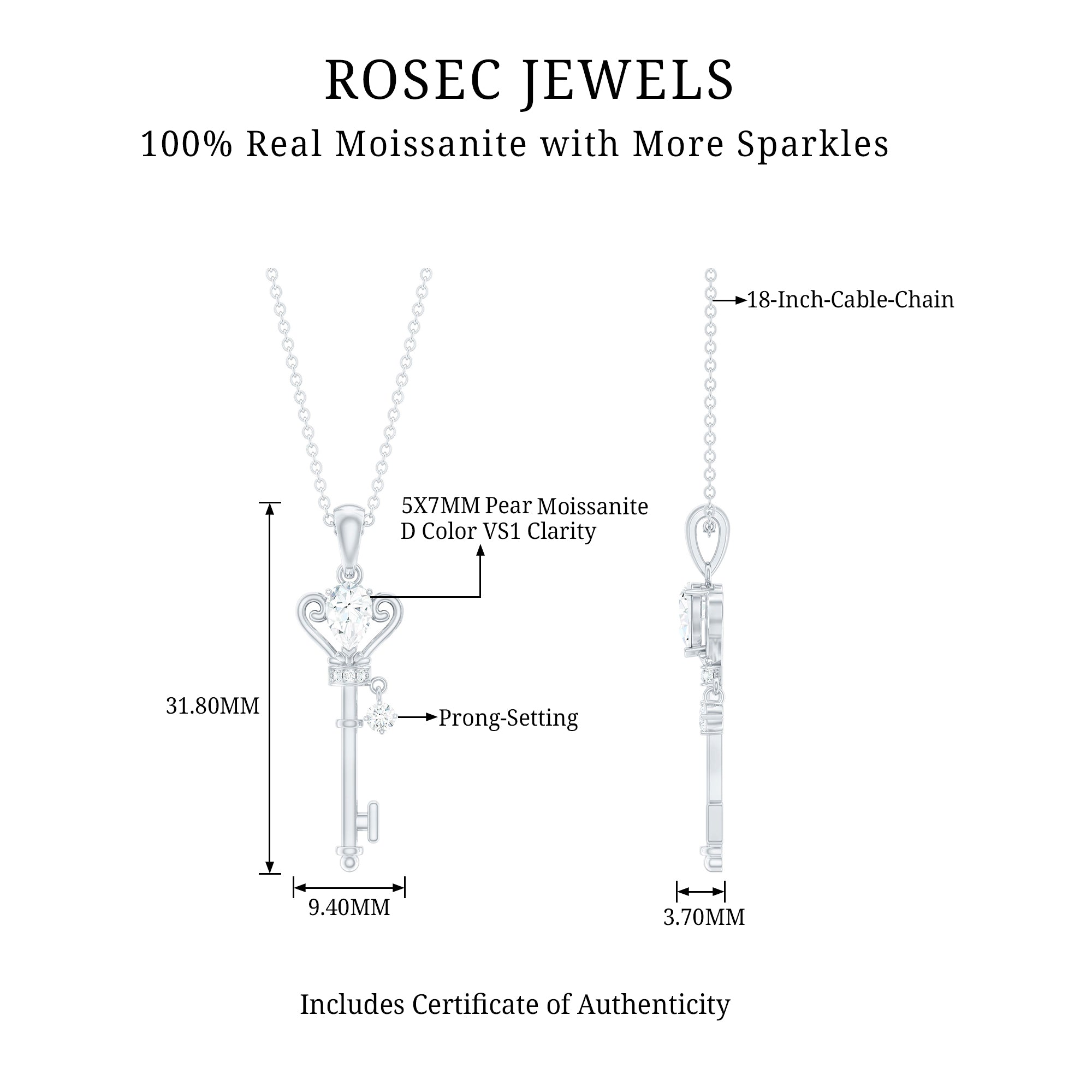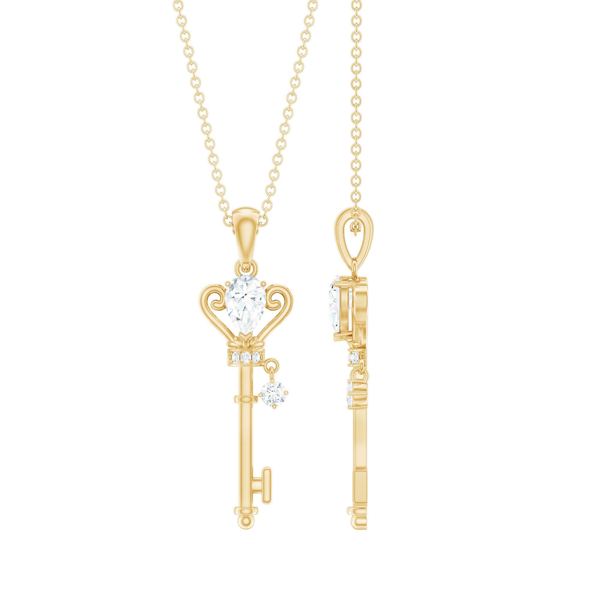 Let her know how much you love her by presenting this Moissanite Key Pendant Necklace to her. Embellished with Pear and Round Shape Moissanite secured in Prong Setting on a unique key design. Composed of Hallmarked Metal, this Moissanite Key Pendant is the perfect piece of jewelry for your favorite person and will make her heart flutter.
