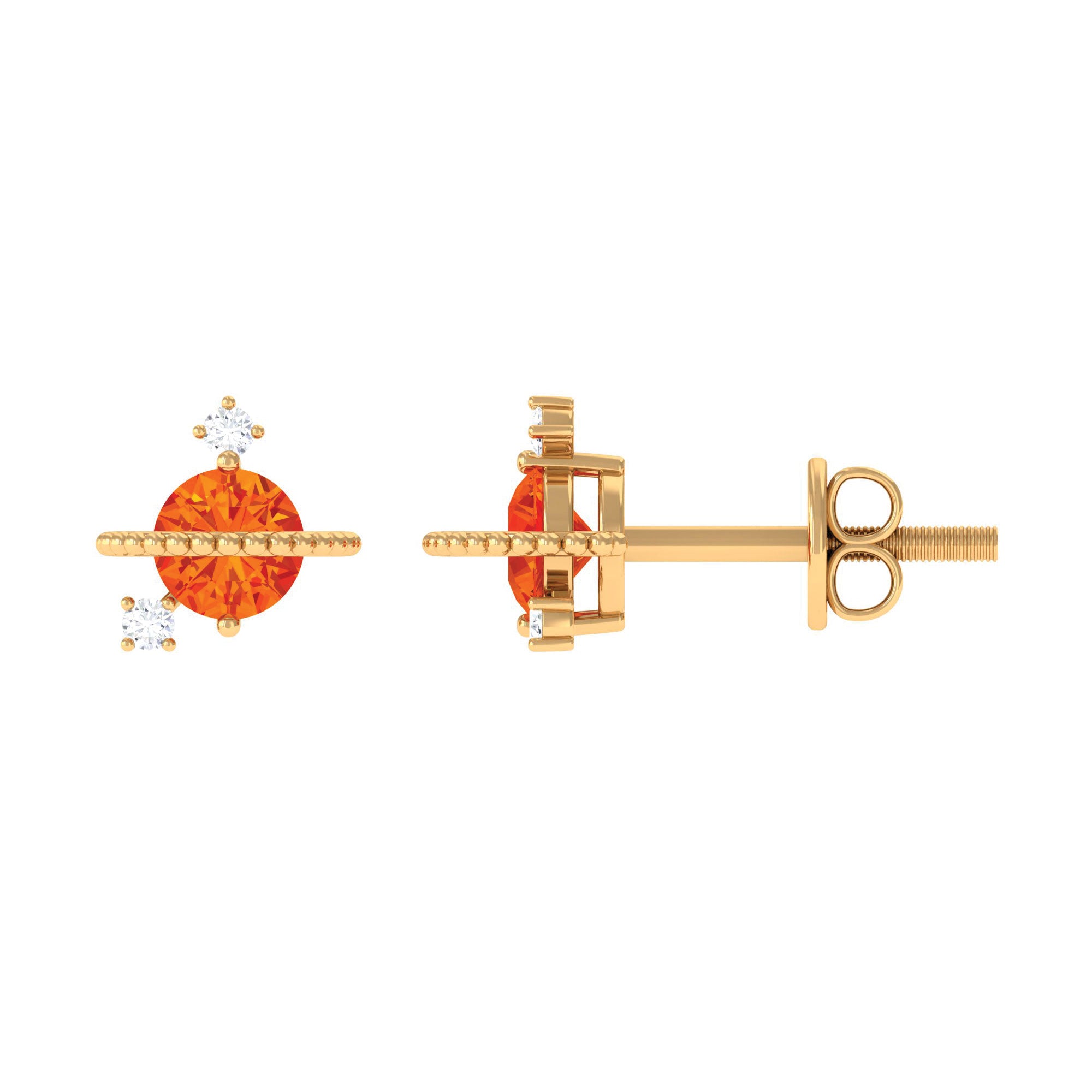 Elevate your style and add a touch of glamour to your look with the Celestial Stud Earrings, featuring a round-shaped Orange Sapphire gemstone and Diamond. These earrings are a beautiful and unique accessory that will add a pop of color to any outfit. The orange sapphire is beautifully contrasted by the sparkling Diamond stones, creating a mesmerizing sparkle. The stud design is easy to wear and versatile, making these earrings perfect for everyday wear or special occasions. The earrings are also nickel-free and hypoallergenic, ensuring that they are safe and comfortable for those with sensitive skin. Whether youre looking for a special gift or a stunning accessory to add to your own jewelry collection, these Celestial Stud Earrings are sure to impress.