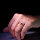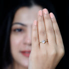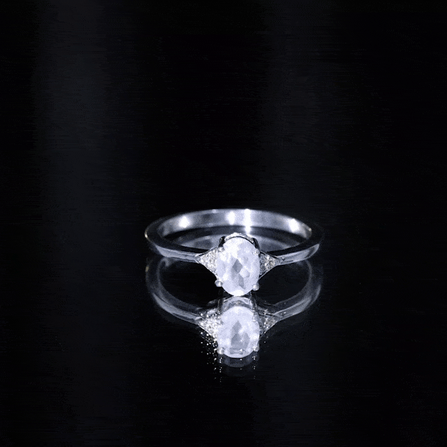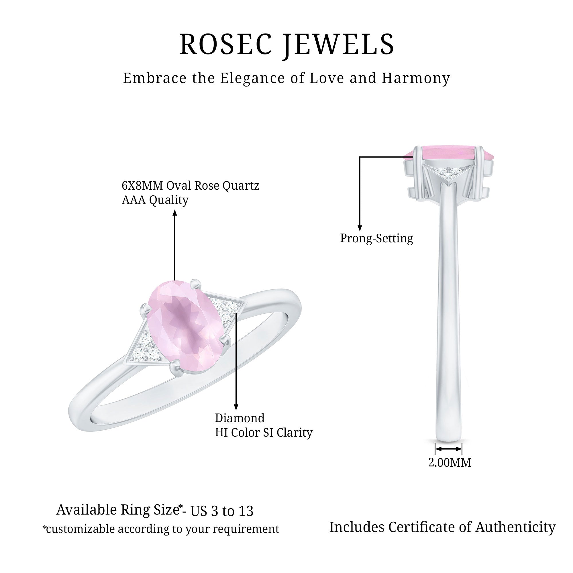 This delicate and feminine solitaire ring features a stunning oval rose quartz center stone accented by a trio of sparkling Diamond stones on each side. The soft and romantic pink hue of the rose quartz is complemented by the brilliance of the Diamond stones, creating a beautiful and sophisticated look. The classic and timeless design is perfect for those seeking a unique and luxurious statement ring.