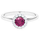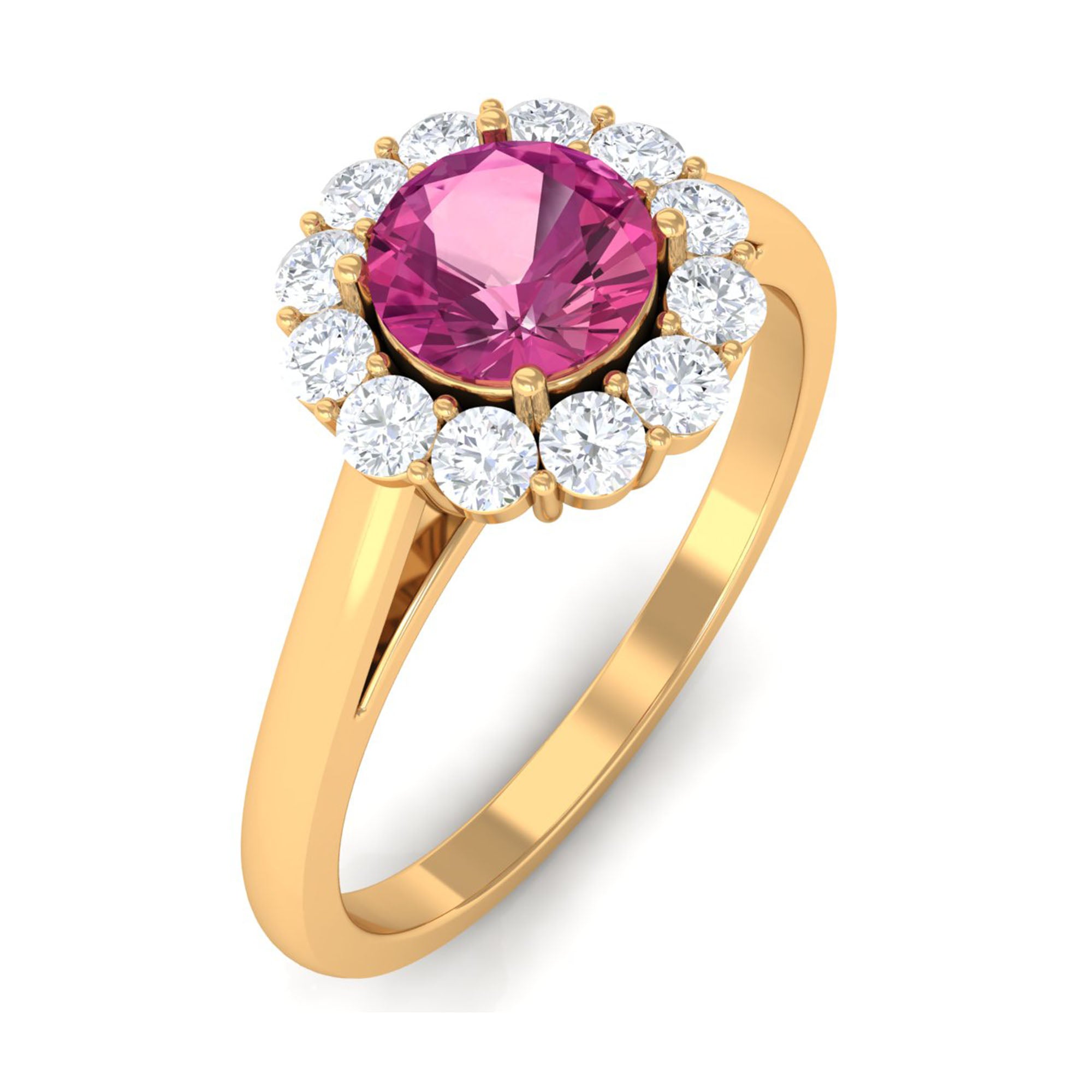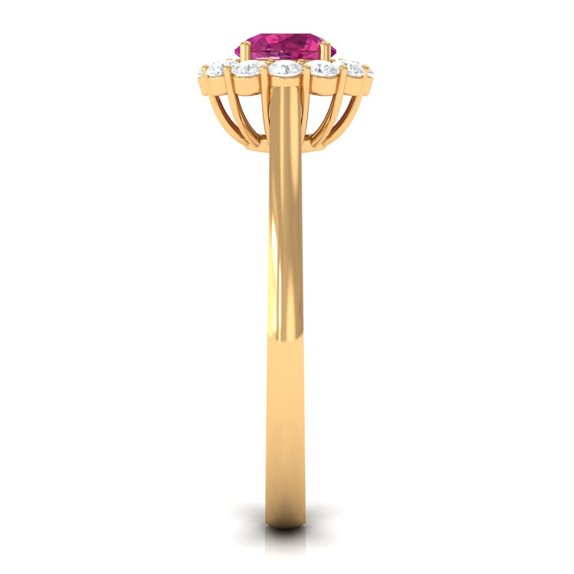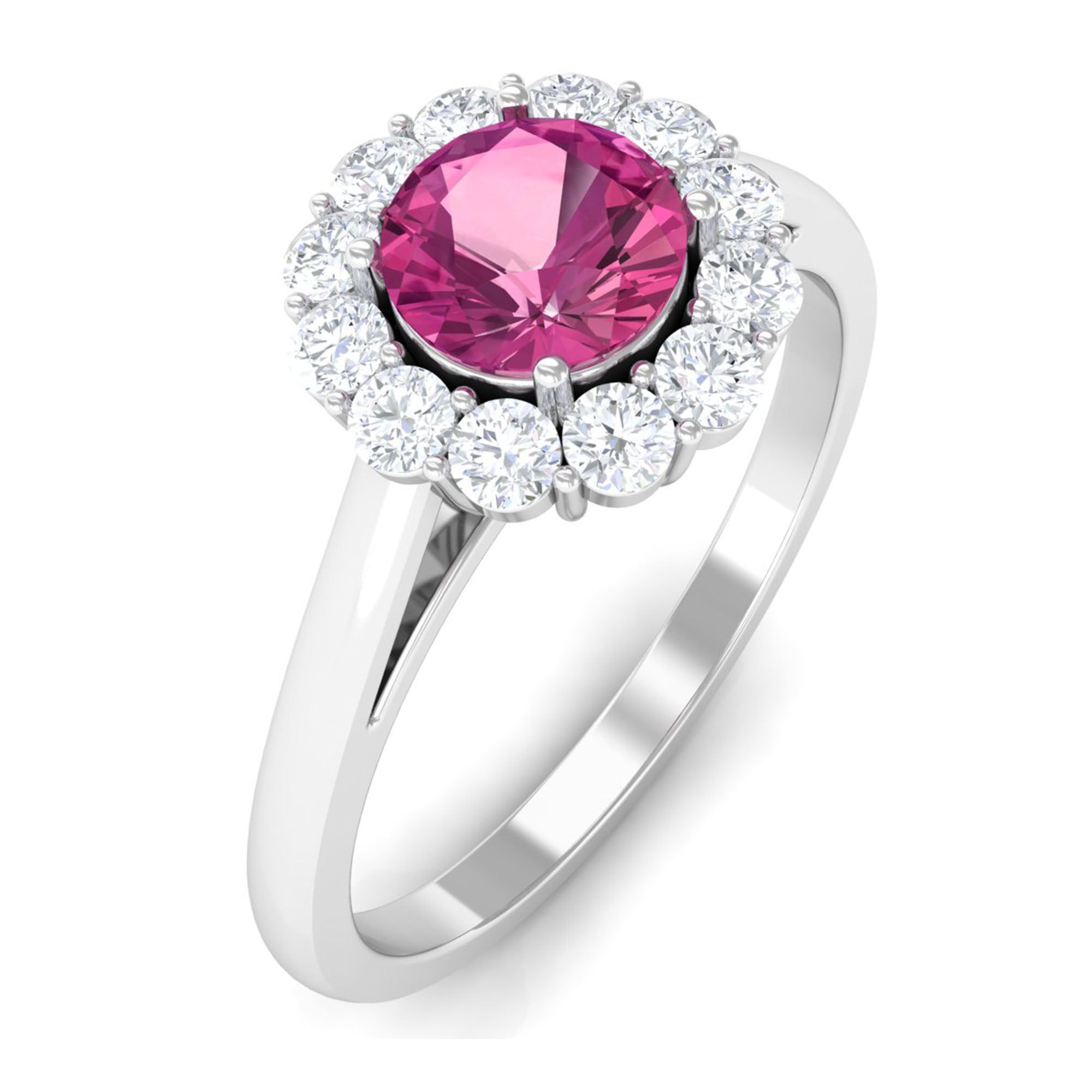 Enhance your beauty with Floating Halo Engagement Ring is embellished with Round Shape Pink Tourmaline Set as a solitaire in a prong setting and Round Shape Diamond in a floating Halo. This Engagement Ring is composed of solid gold.