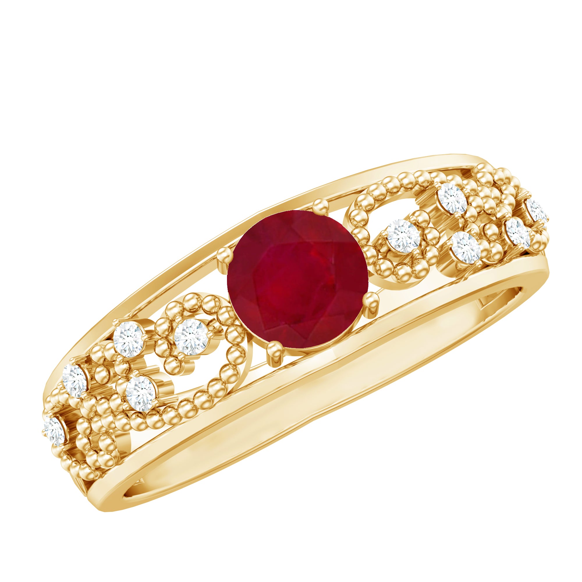 A striking symbol of your everlasting love, this gorgeous Ruby Engagement Ring for her features a lovely center round shape ruby that is set in a prong setting with Diamond on the shank. Pledge your love and affection to your partner by presenting this ultimate Ruby and Diamond Engagement Ring.