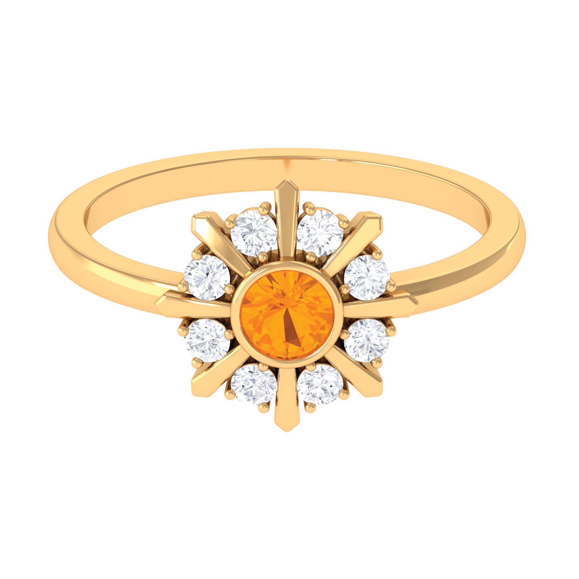 Express your love with this Statement Ring towards your lady. This October Birthstone Ring is adorned with Round Shape Fire Opal as a solitaire in a bezel setting surrounded by Round Diamond in a prong setting. This Fire Opal and Diamond Ring is mounted in gold metal.