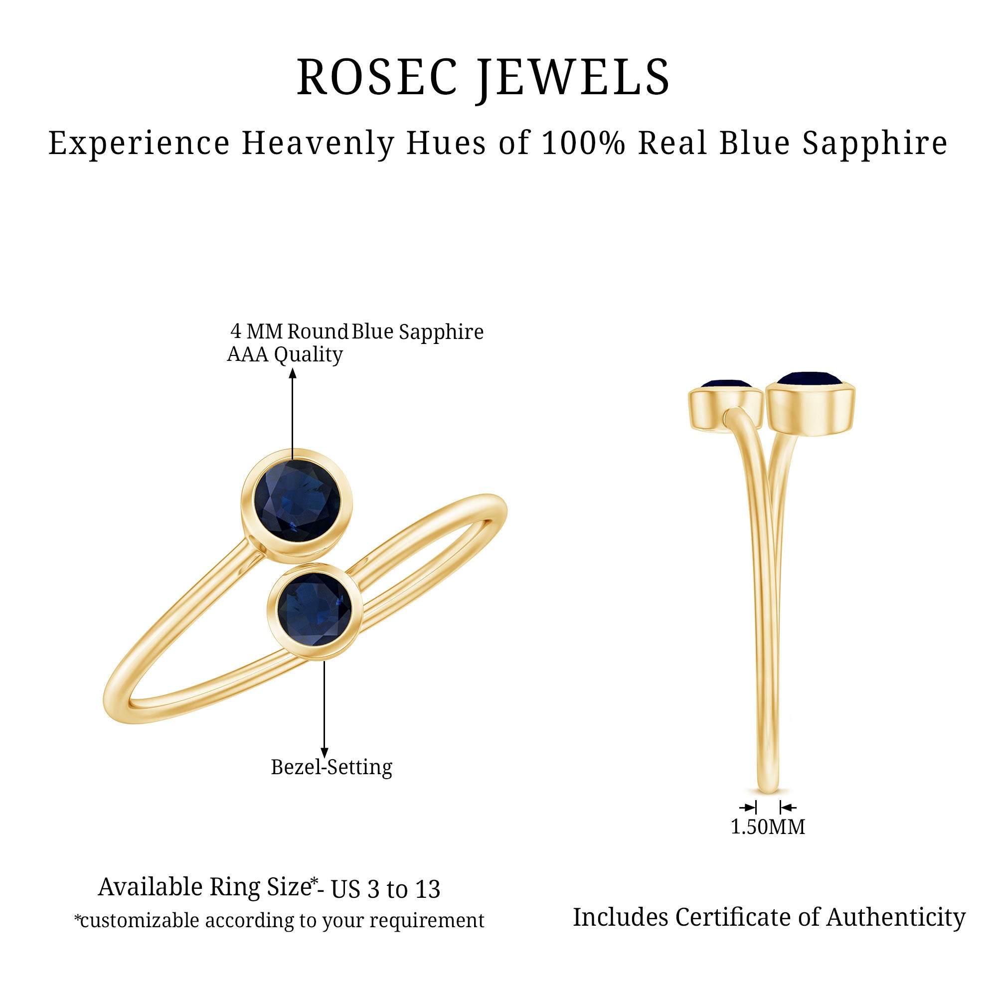 Make a stunning fashion statement with this Blue Sapphire Promise Ring. Adorned with a Bezel Set Blue Sapphire, the Bypass Shank design adds a touch of elegance to this simple yet chic gemstone ring. Perfect for adding a touch of sparkle to your finger on special occasions like Valentines Day.