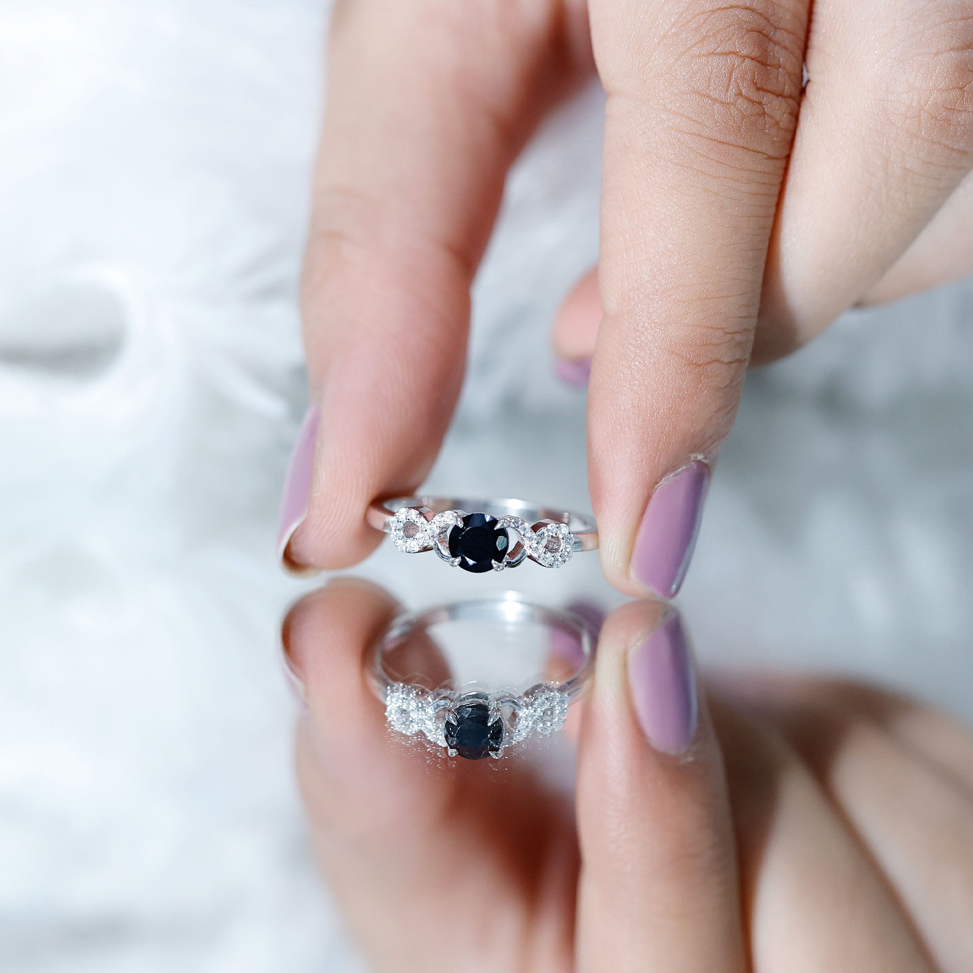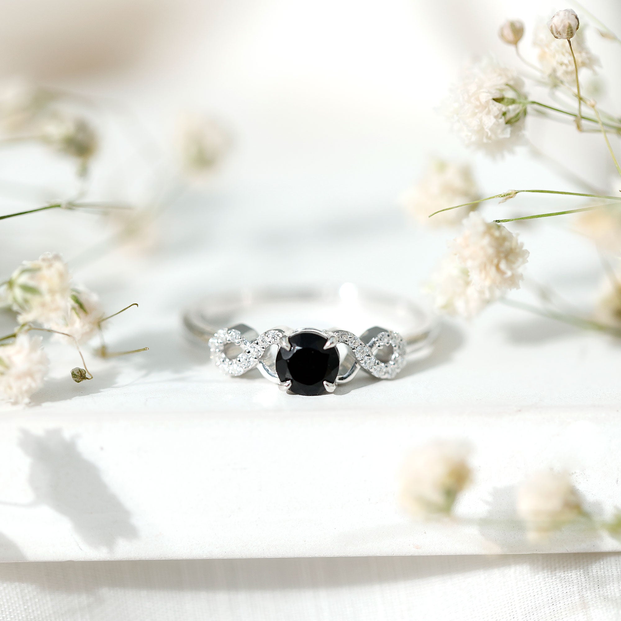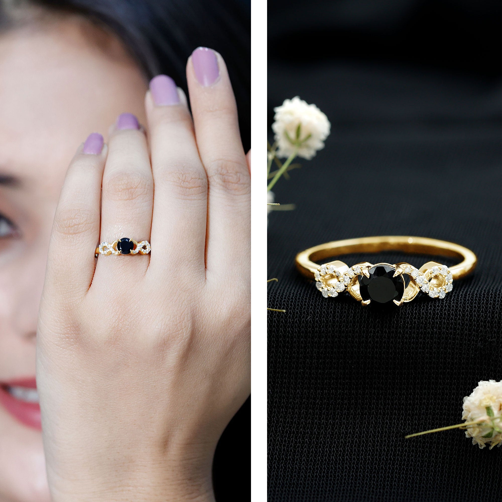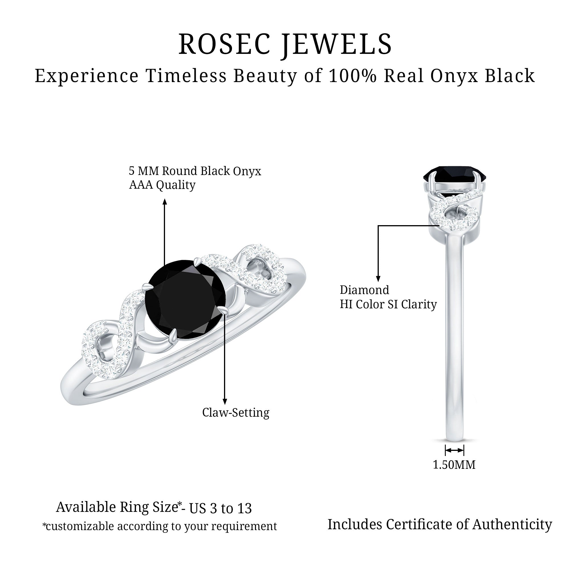 A Stylish and Fashionable Criss Cross Engagement Ring is a perfect match for your love. This Engagement Ring is decorated with Round Shape Black Onyx as a solitaire in a claw setting with Round Diamond over a crisis cross shank.