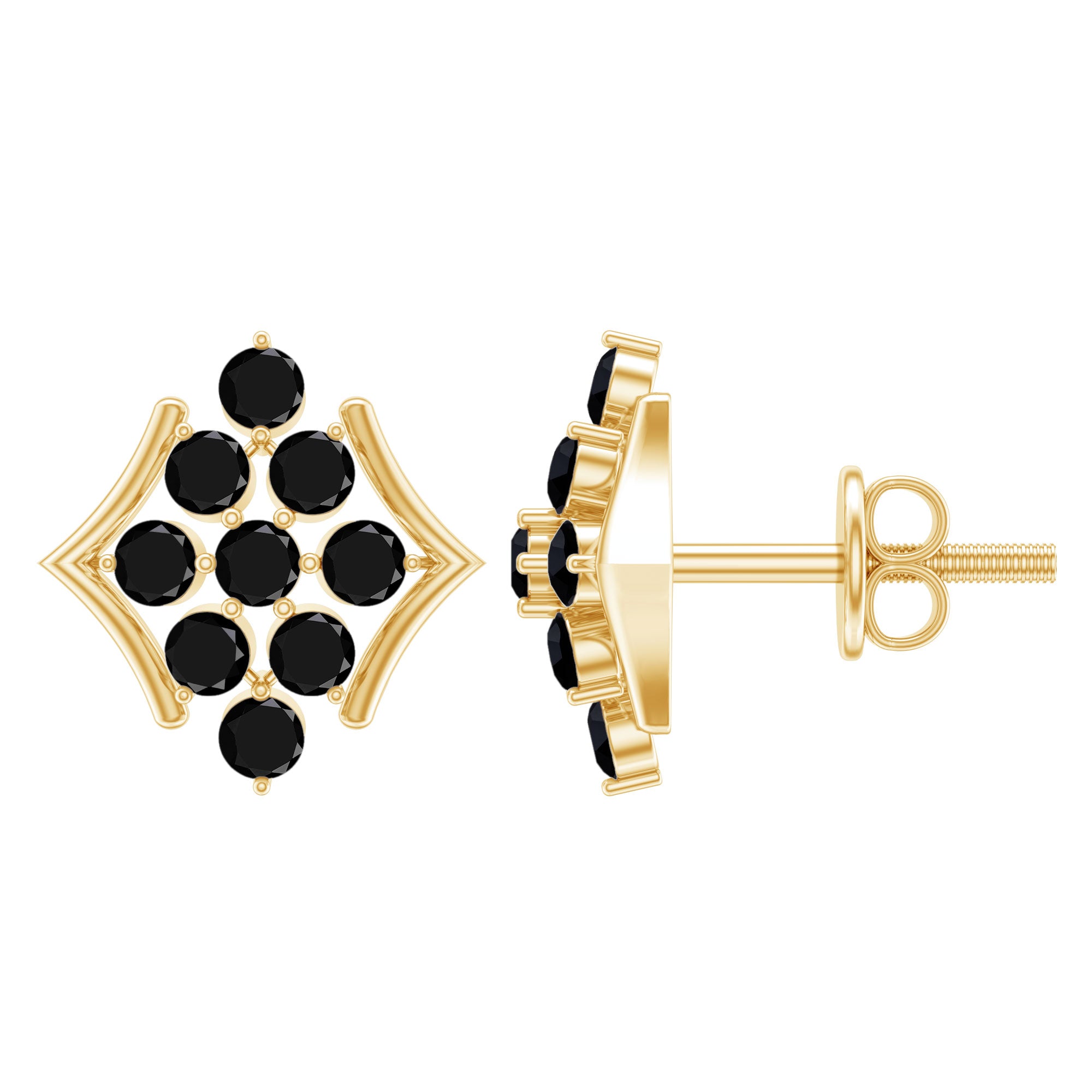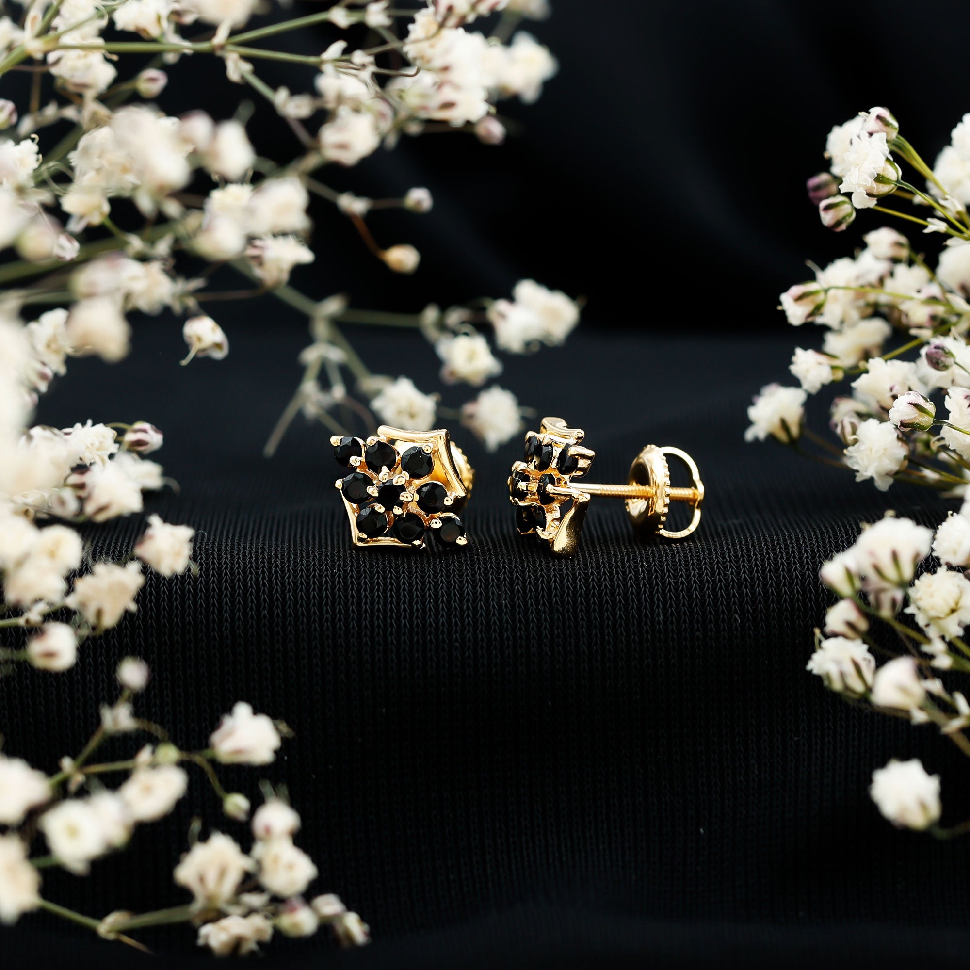 These Floral Cluster Earrings are a statement in its own, crafted with Solid Gold and adorned with Black Onyx these Cluster Stud Earrings are a classic choice for special occasions.
