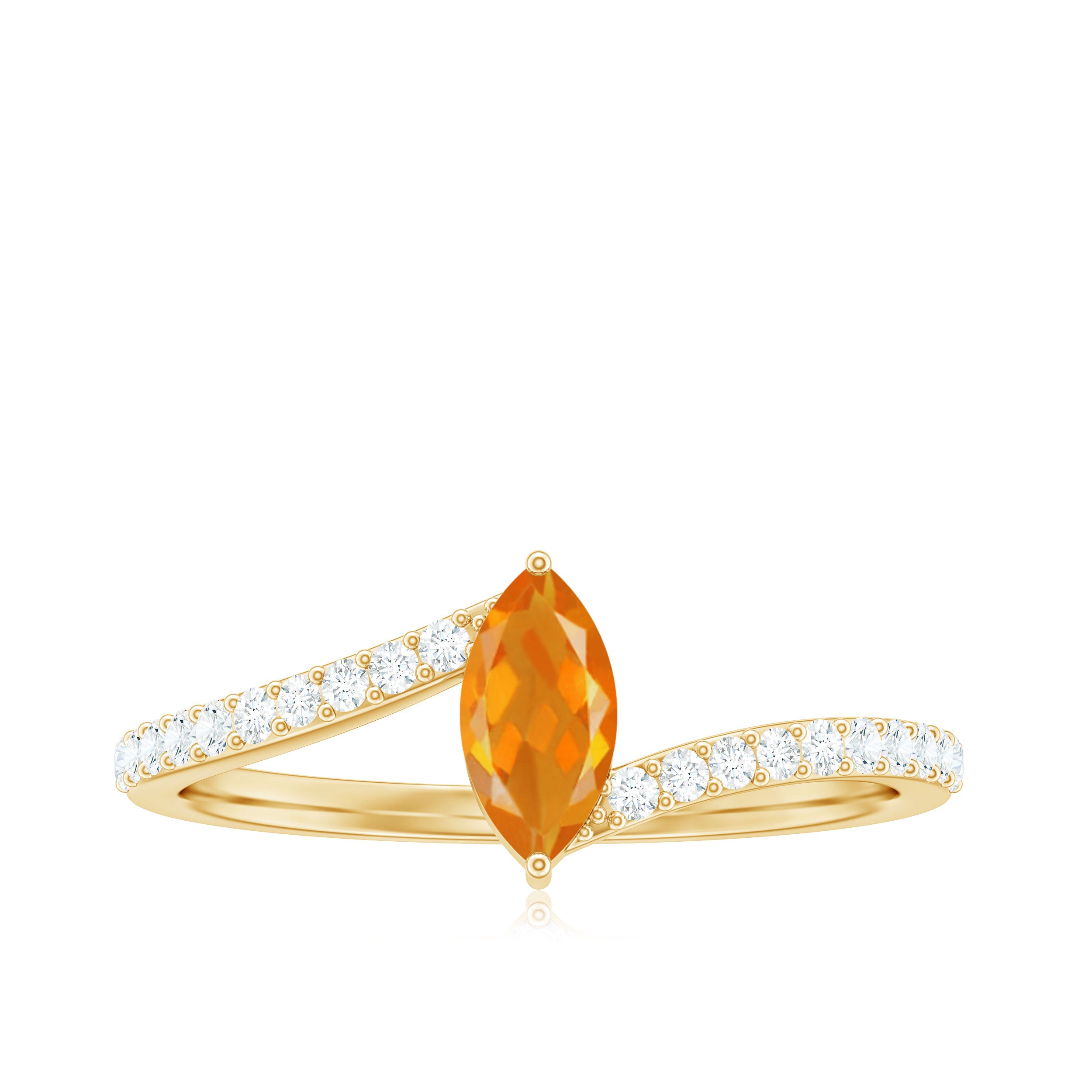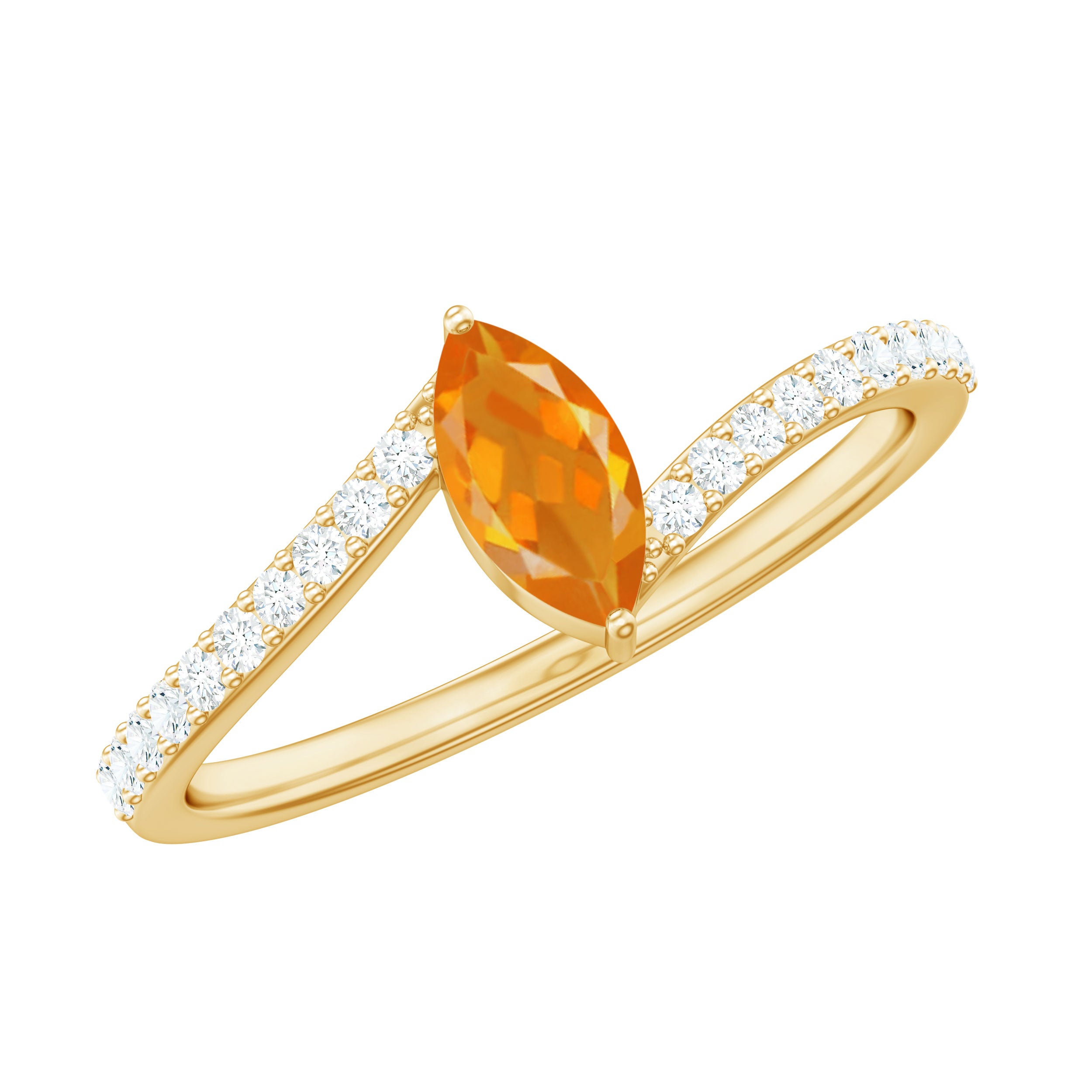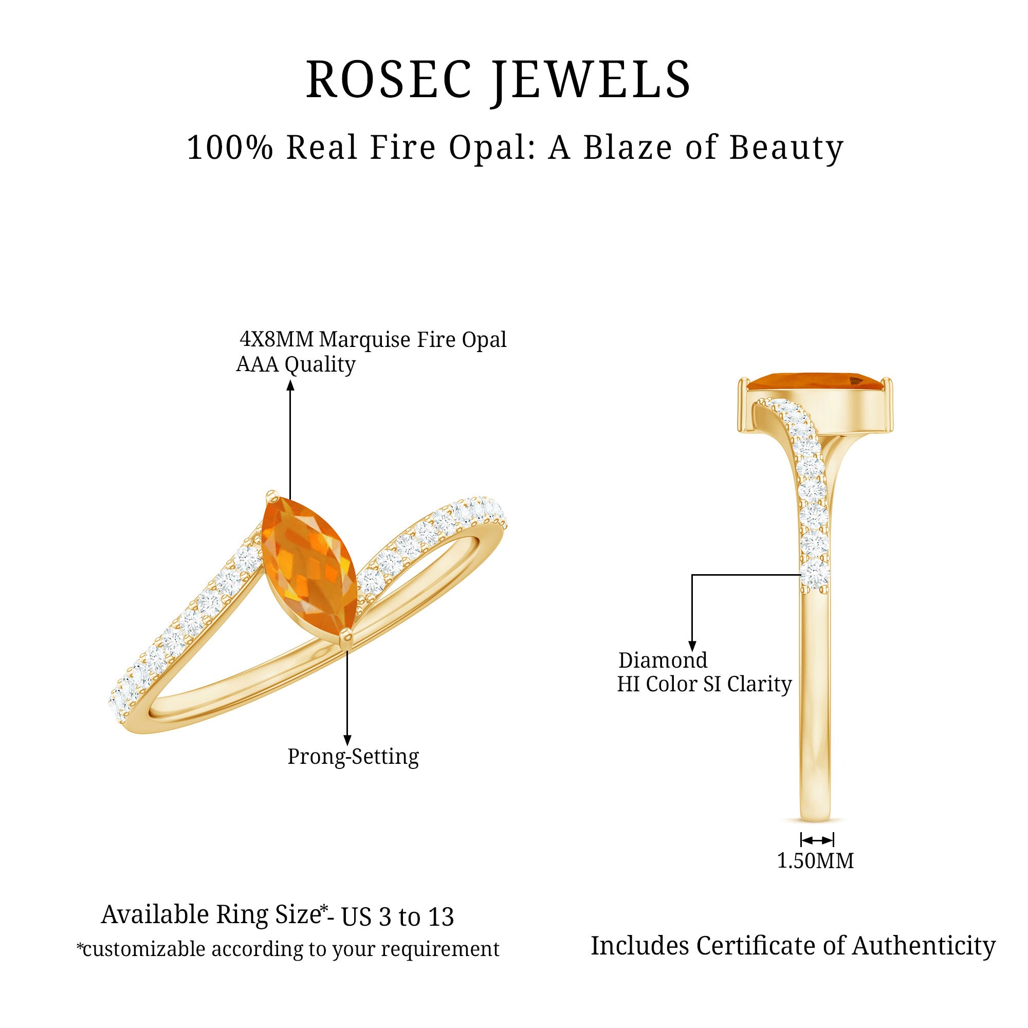Get ready for the special evening with this lovely Bypass Engagement Ring. This Engagement Ring is adorned with Marquise Cut Fire Opal in the center in a prong setting with a Round Diamond as a side stone over a bypass shank.
