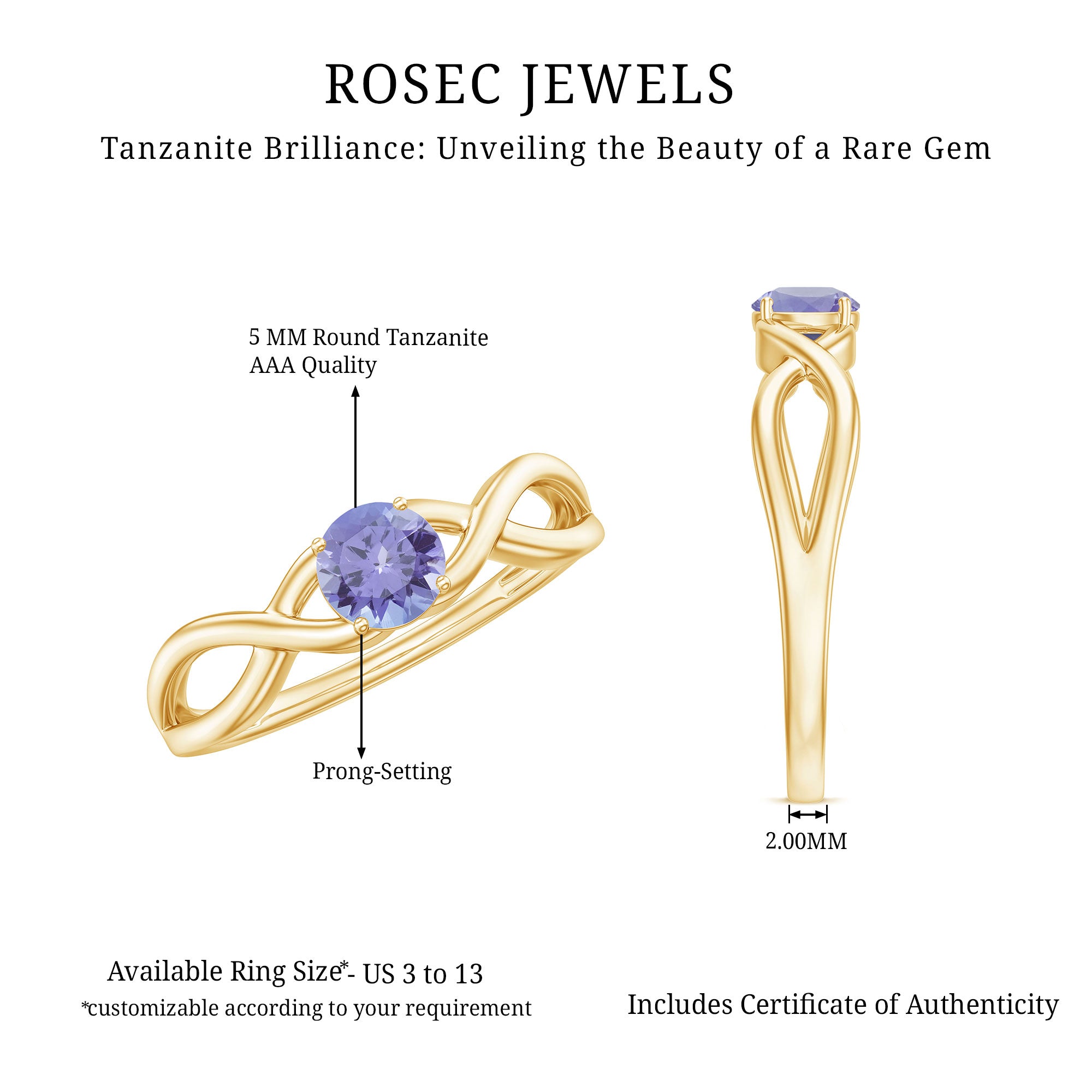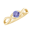 Embrace romance with this Tanzanite Solitaire Promise Ring, designed in an elegant and sophisticated style. The ring features a Round Cut Tanzanite set as a solitaire on a Gold Crossover Shank. For special occasions, this jewelry accessory is crafted in Gold Metal.