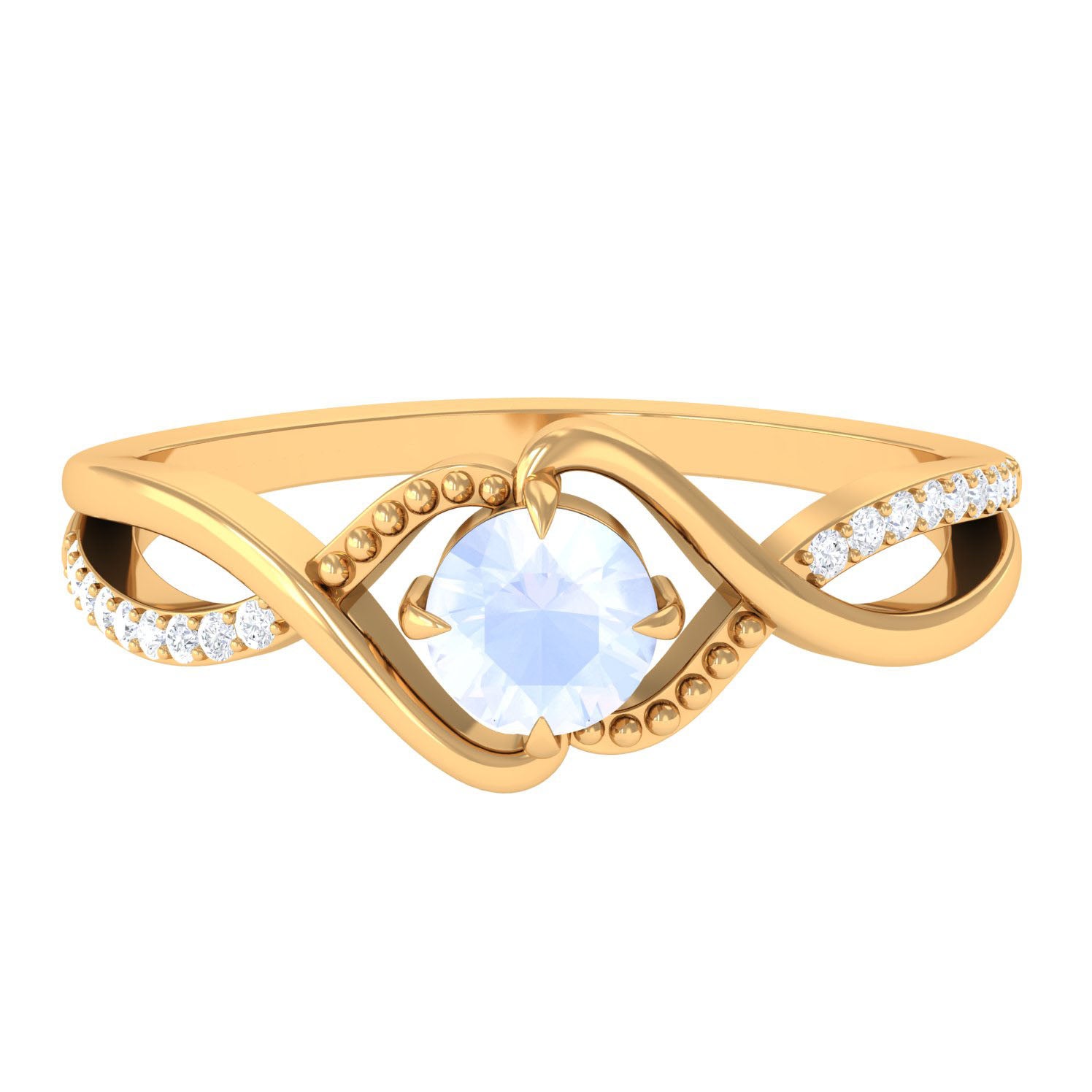 Embrace romance with this Moonstone Solitaire Ring, designed in an elegant and sophisticated style. The Ring features a Round Shape Moonstone set as a Solitaire with Diamond on a Gold Crossover Shank. For special occasions, this jewelry accessory is crafted in Gold Metal.