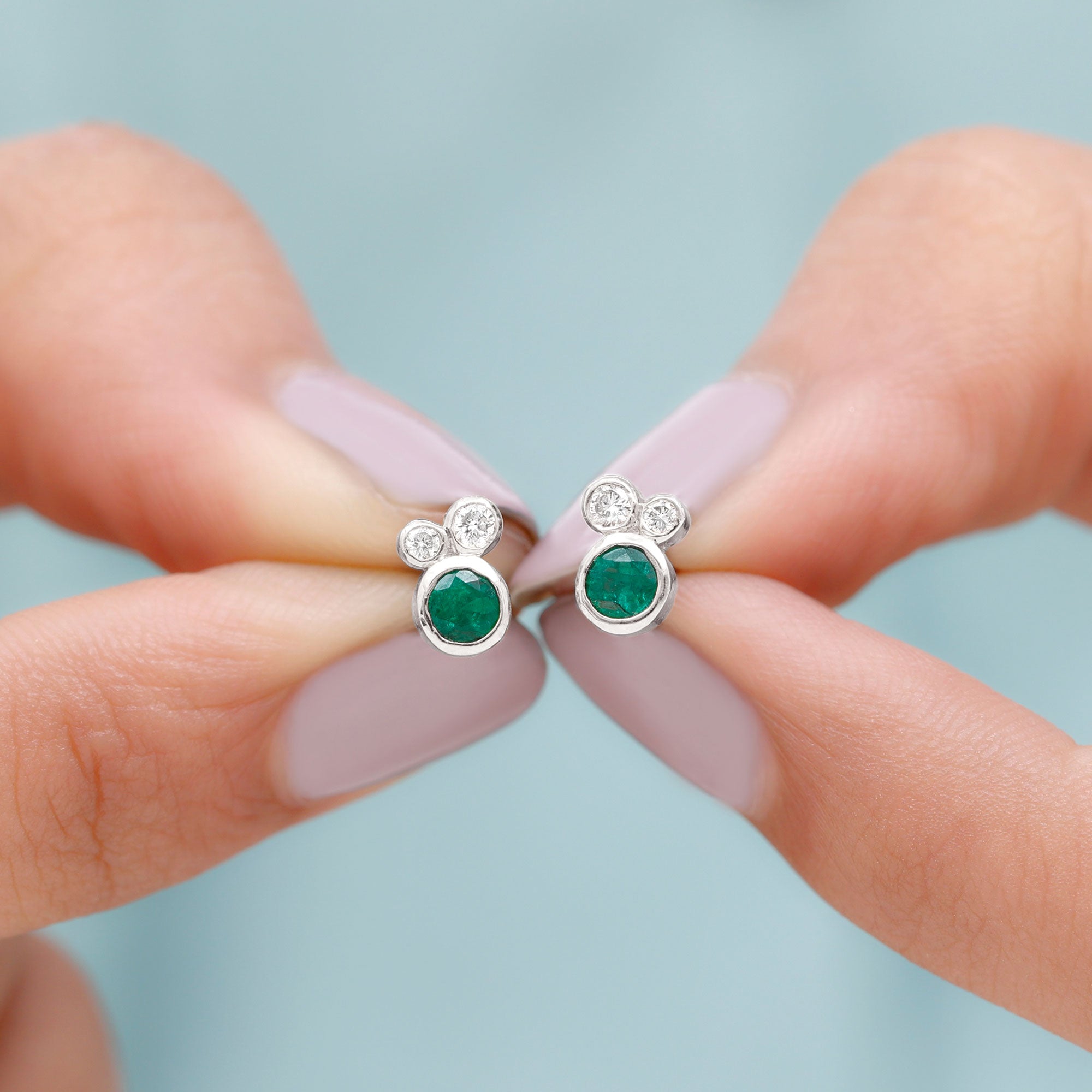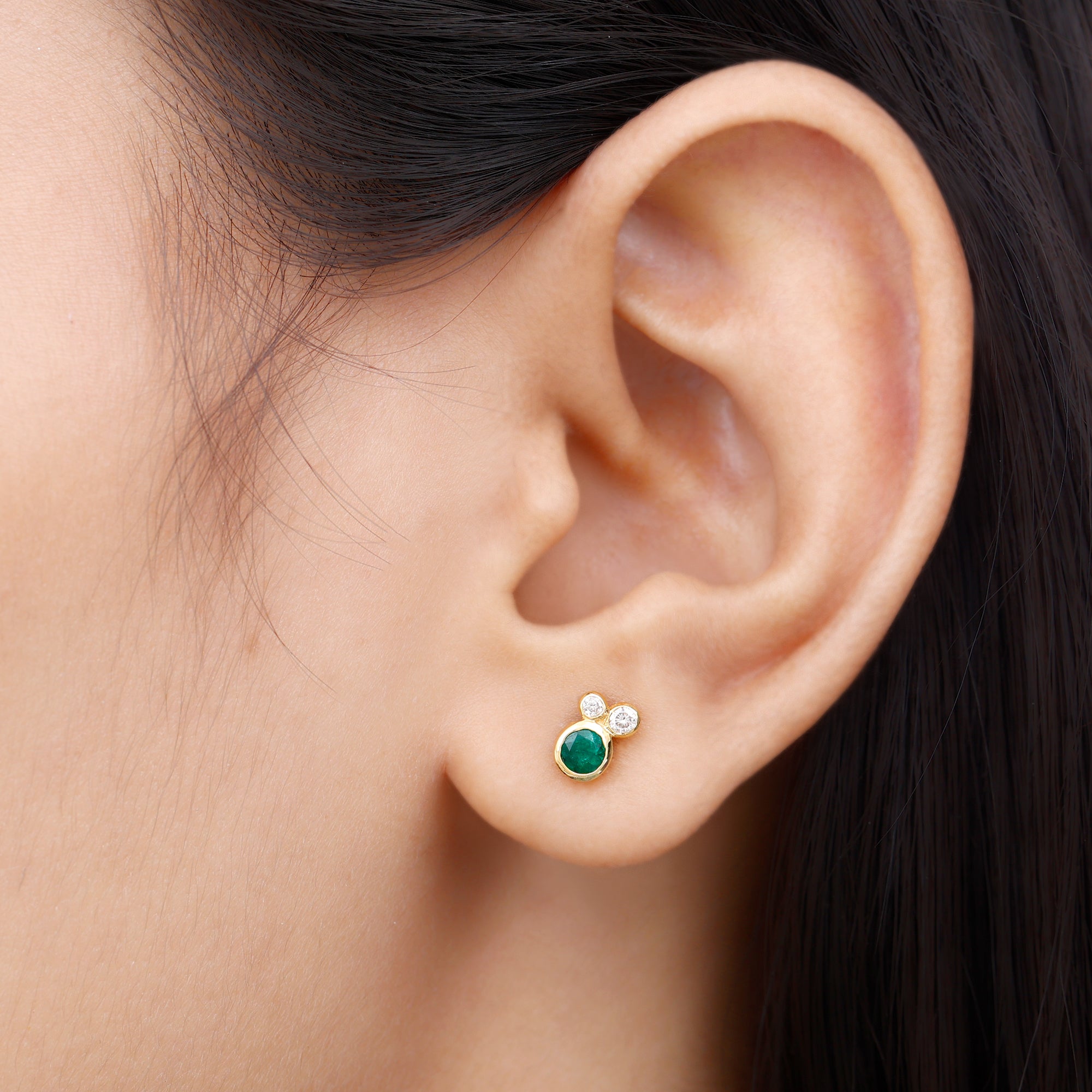 Grab this shinning Three Stone Stud Earrings for your loved one. These Dainty Earrings are embellished with Round Shape Emerald and Diamond in Solid Gold with Bezel Setting.
