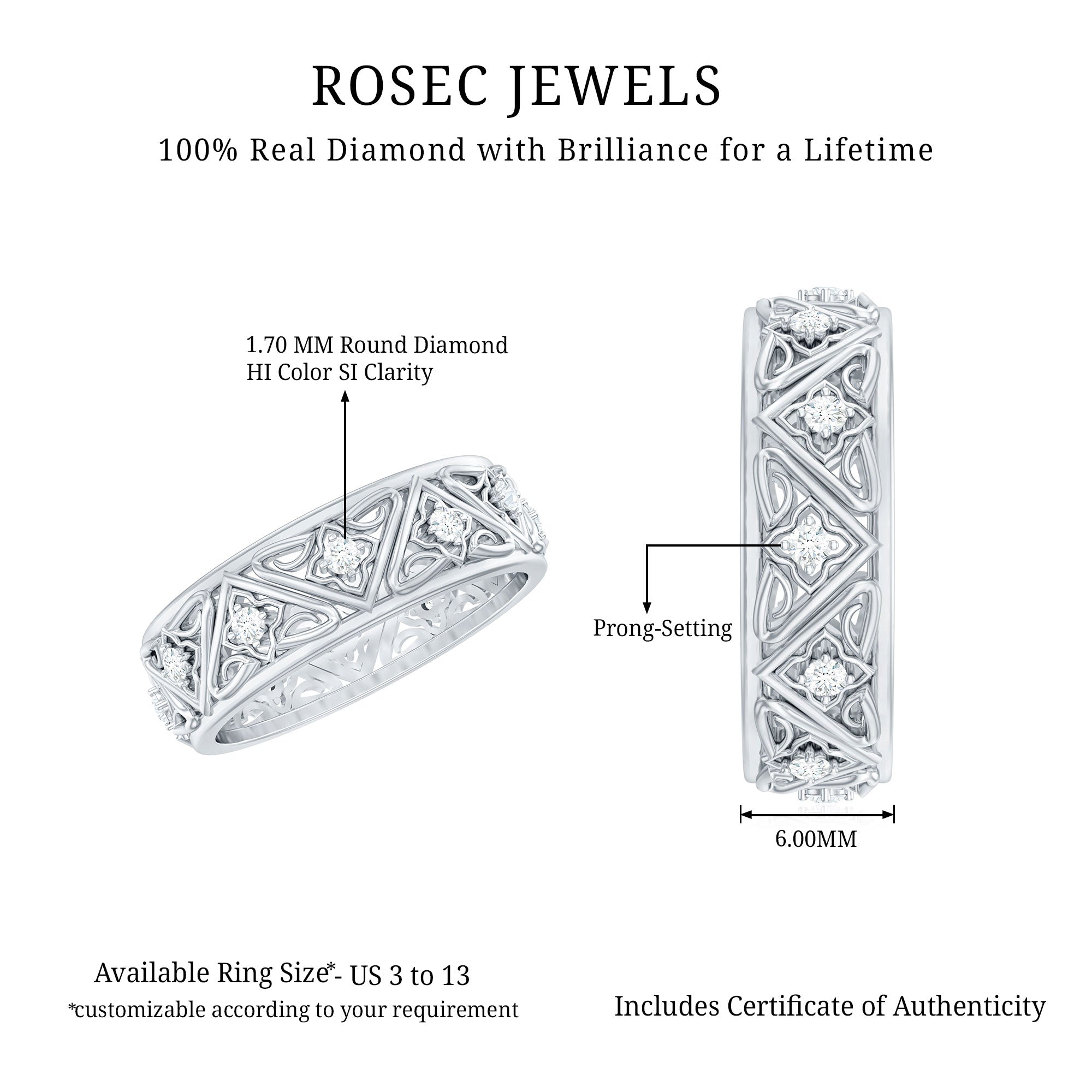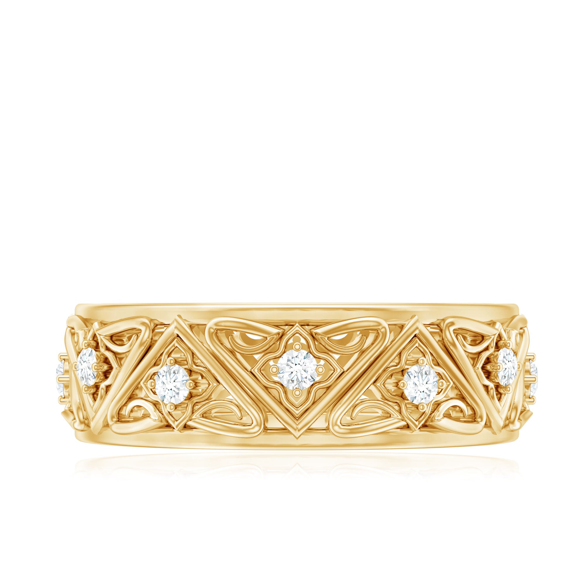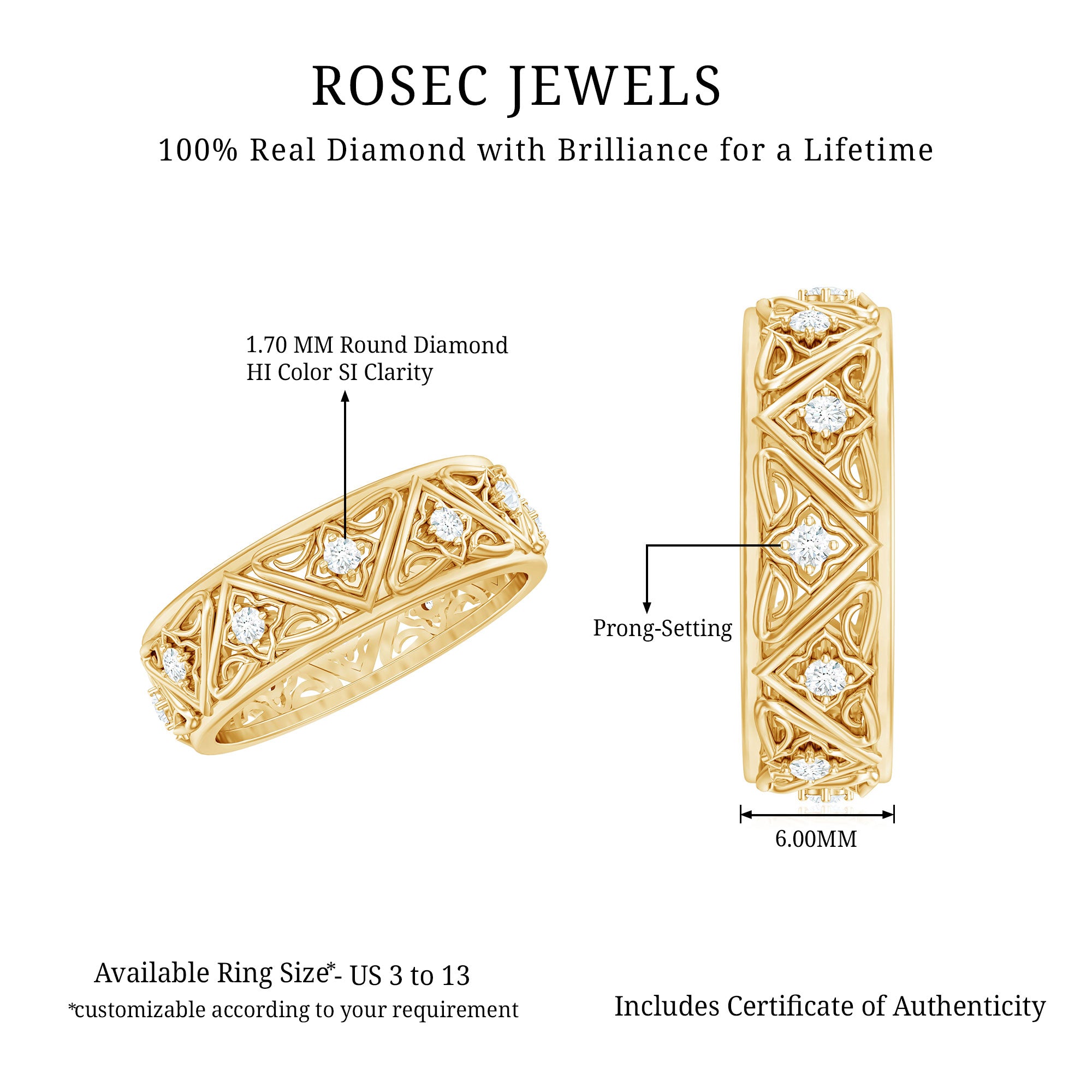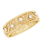 Grab this alluring Round Cut Diamond Vintage Band Ring in 4 Prong Setting to make her feel extra special on the Wedding Date. This Ring is made with Solid Gold Metal Finish.