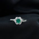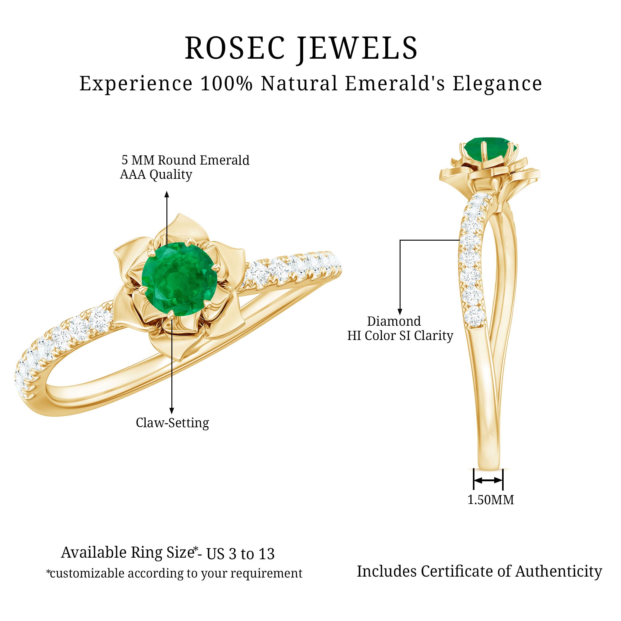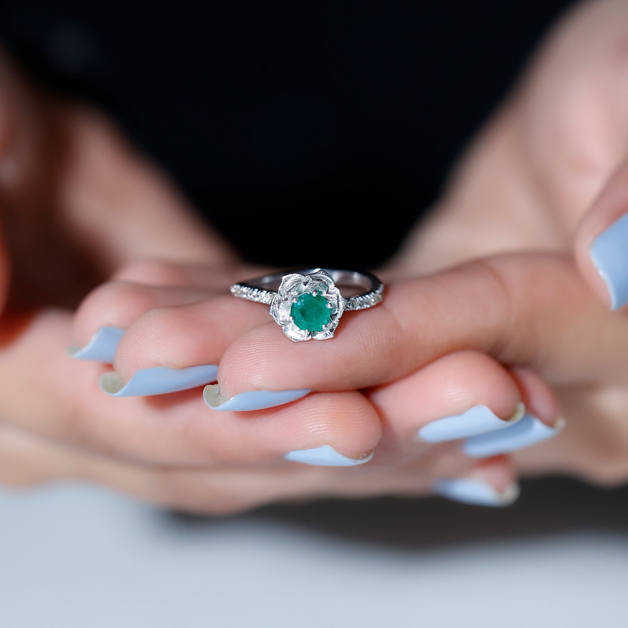 Blooming with the grace of nature’s artistry, this Nature Inspired Engagement Ring captures the essence of love in its purest form. At its center rests a 5 MM round cut emerald, securely held in prong setting. Surrounding the center stone are delicately shaped metal petals, forming a floral design reminiscent of a blossoming rose. On either side of the center, round cut diamonds glimmer softly, adding a hint of sparkle that enhances the vivid color of the emerald. The gently curved shank gives the Rose Engagement Ring a refined and modern silhouette while maintaining a romantic and classic appeal. Crafted with AAA quality emerald and HI-SI quality diamonds, this Emerald Engagement Ring is designed with care and precision to radiate sophistication. This Emerald Flower Ring beautifully symbolizes love, growth, and new beginnings, making it a perfect choice for proposals or meaningful celebrations. Whether worn as a promise of forever or a cherished keepsake, it embodies the timeless connection between nature and devotion. Presented in an elegant jewelry box with a certificate of authenticity, this Emerald and Diamond Engagement Ring is a celebration of romance, grace, and everlasting beauty.
