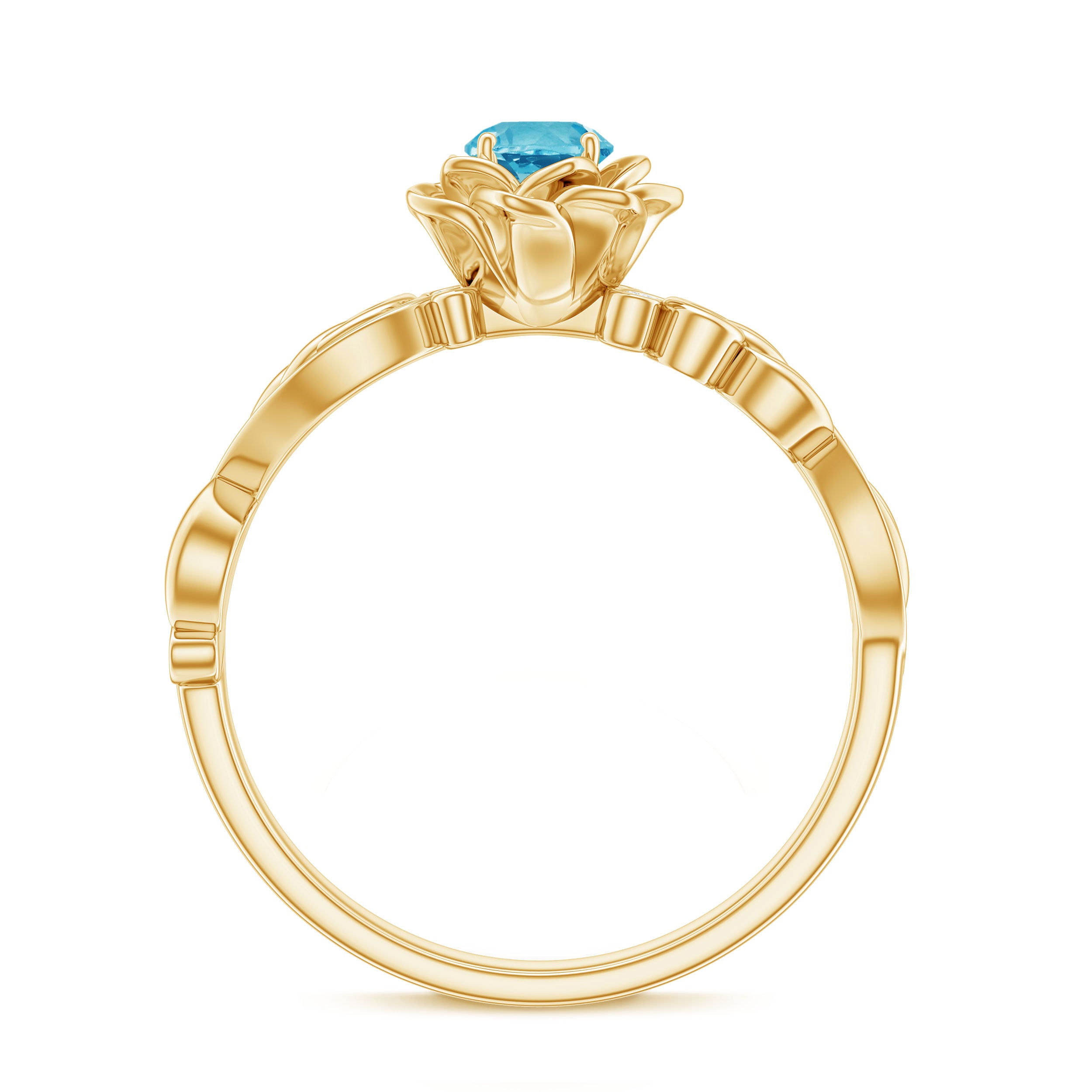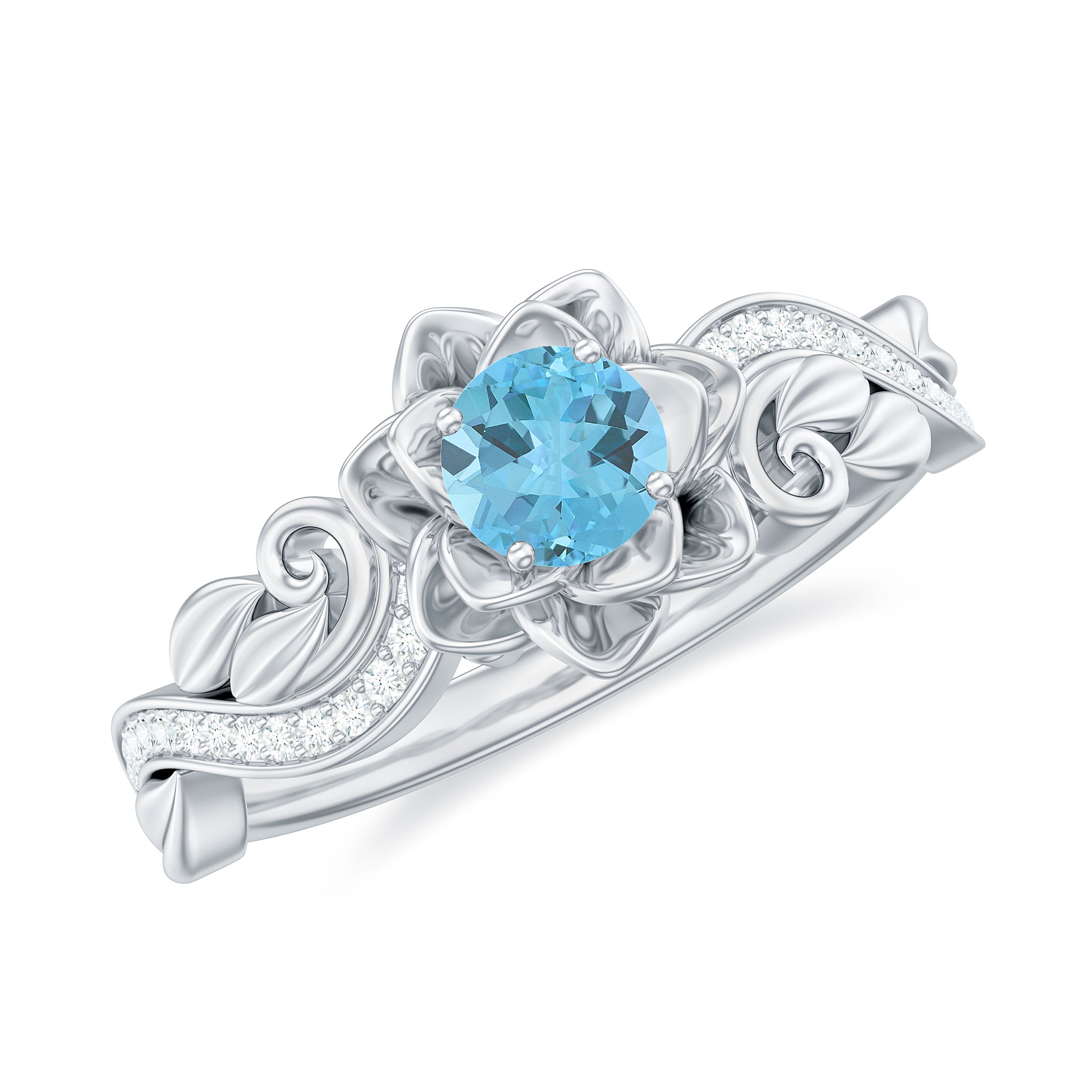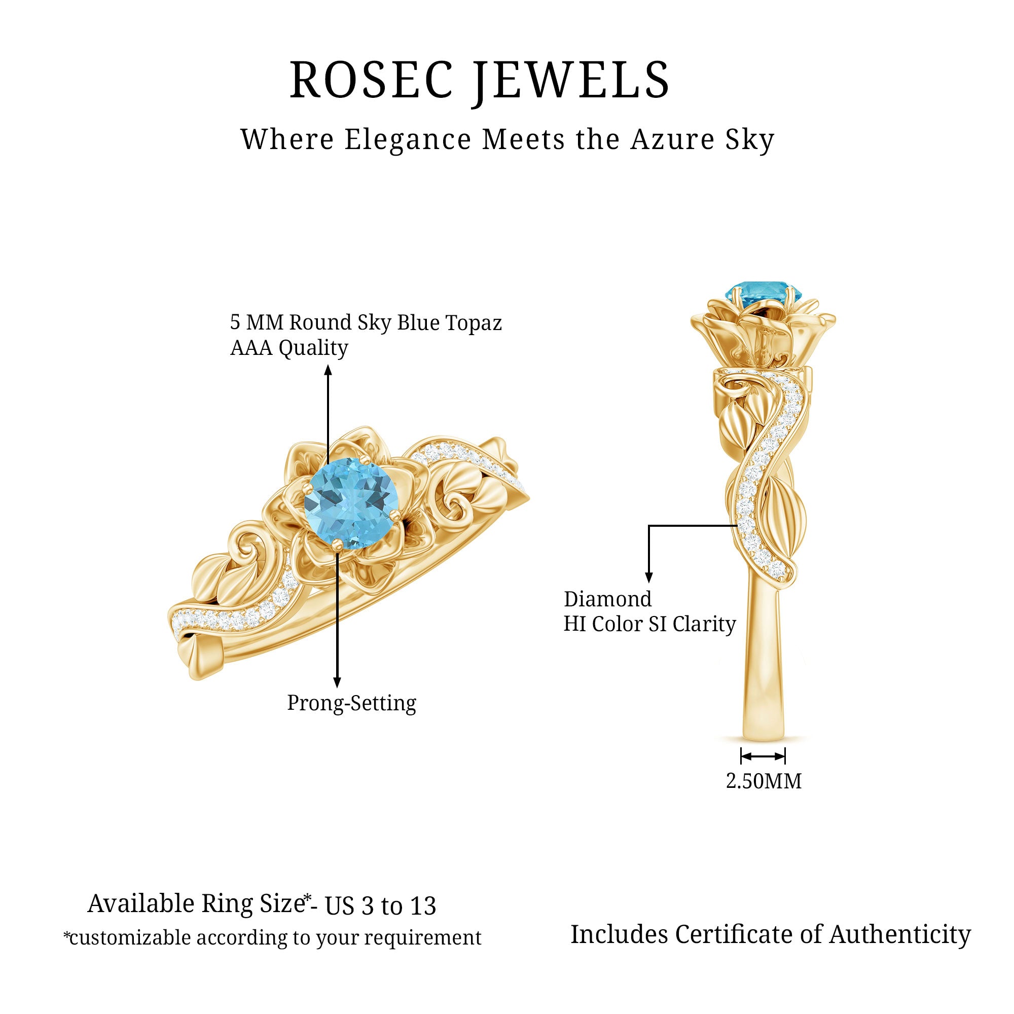 It is a Floral Inspired Engagement Ring for Women, adorned in Solid Gold and features a Round Shape Sky Blue Topaz embellished in Prong Setting with Round Shape Diamond embellished in Pave Setting.