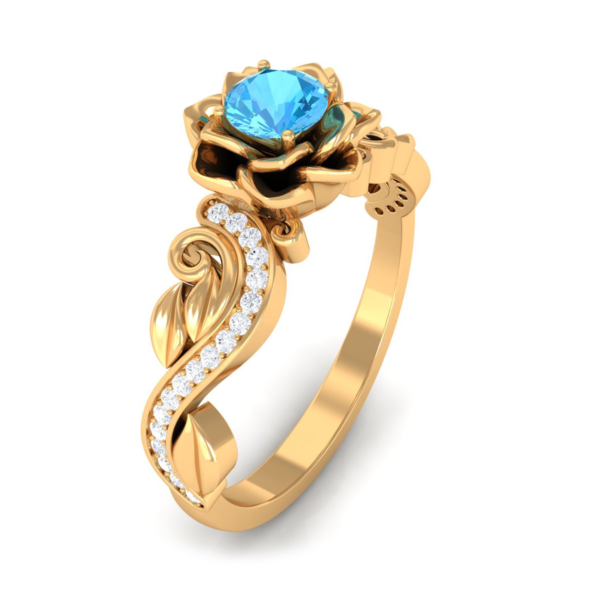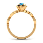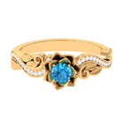 It is a Floral Inspired Engagement Ring for Women, adorned in Solid Gold and features a Round Shape Swiss Blue Topaz embellished in Prong Setting with Round Shape Diamond embellished in Pave Setting.