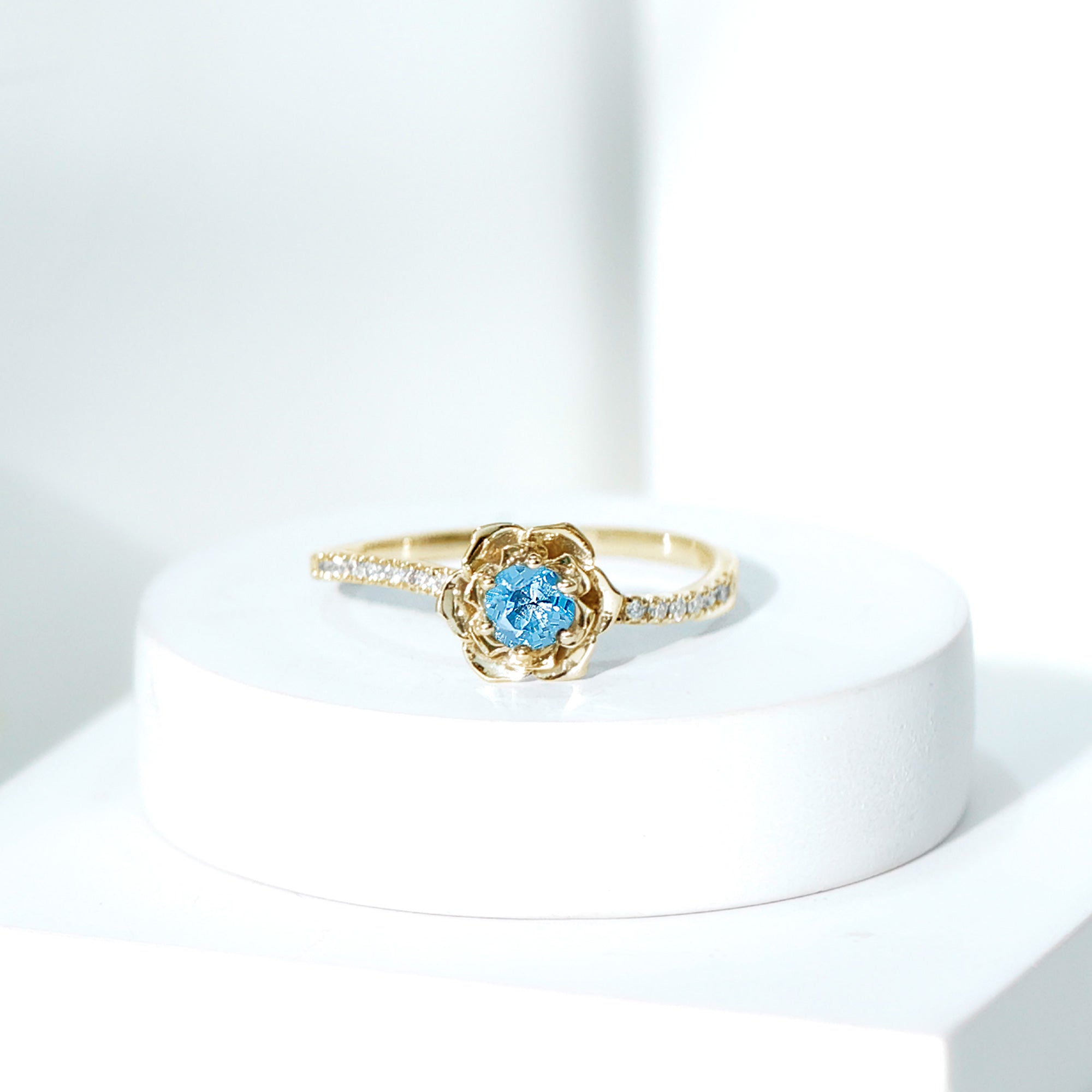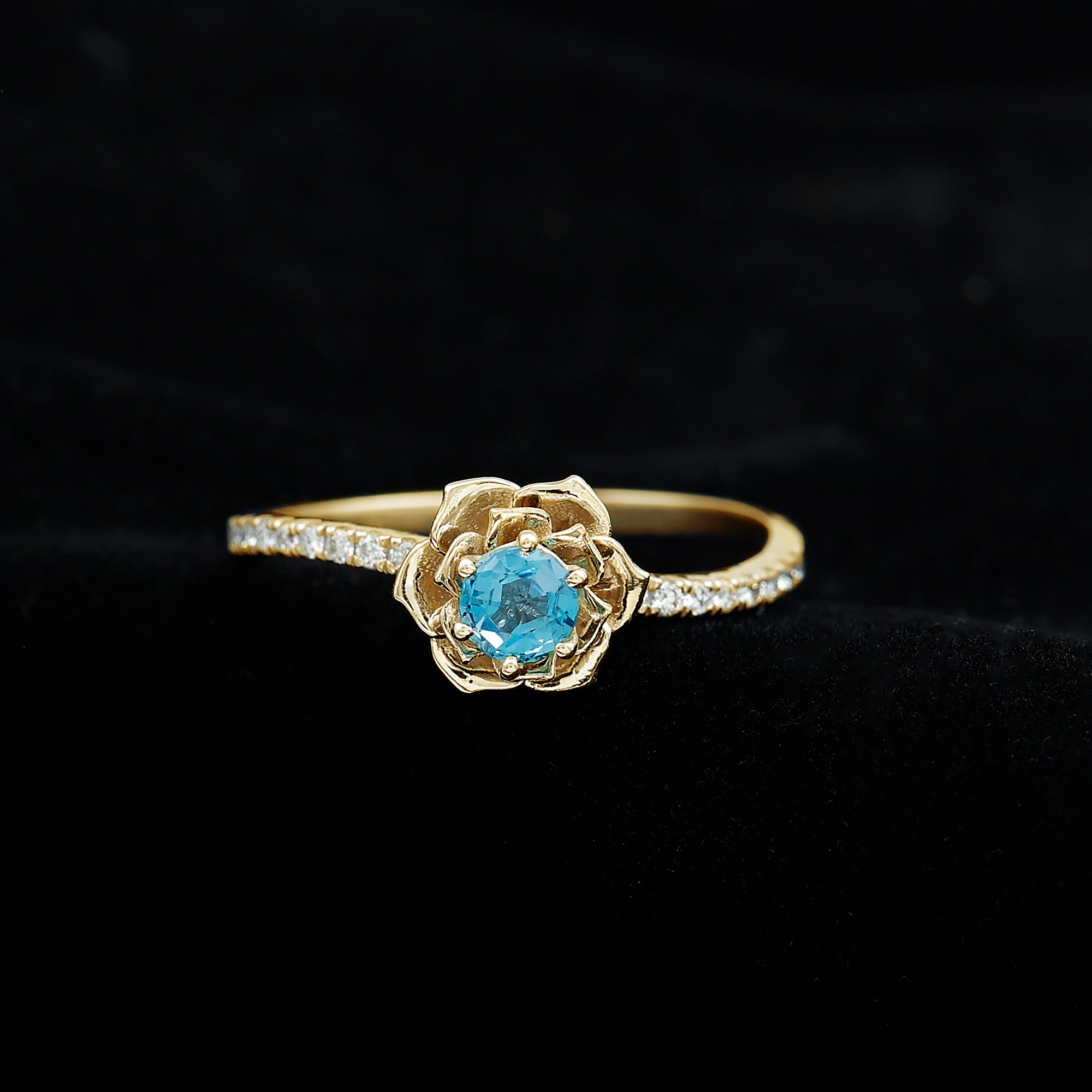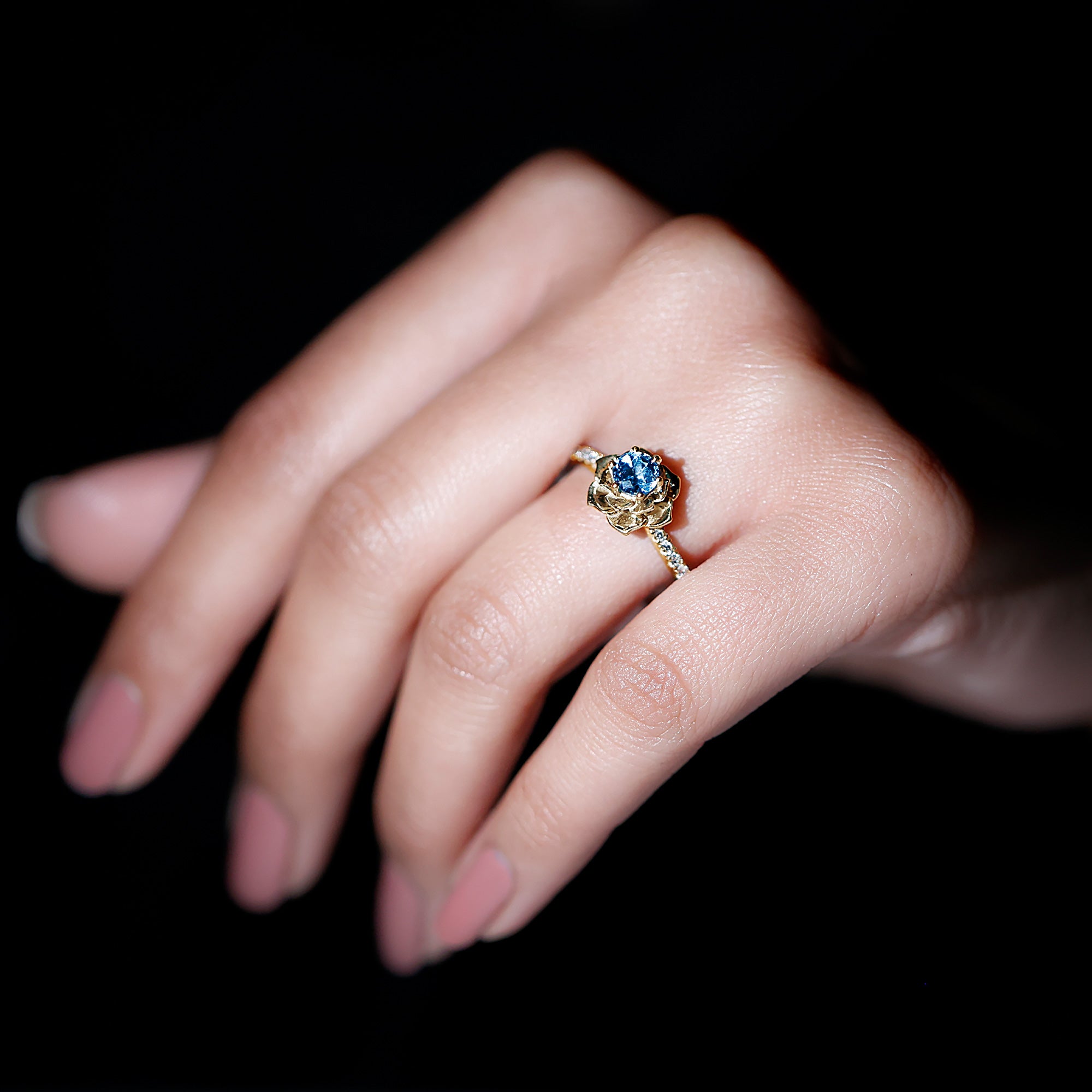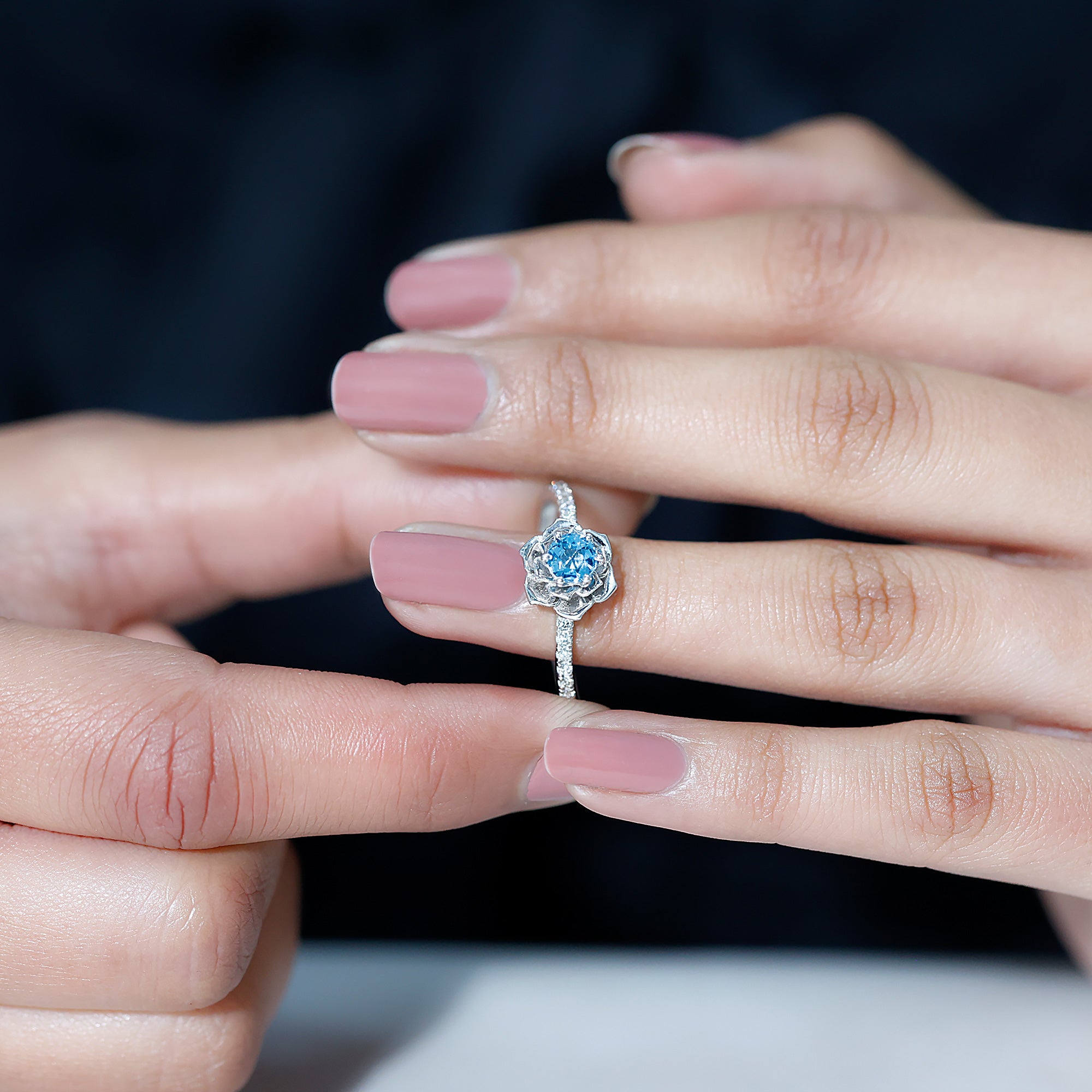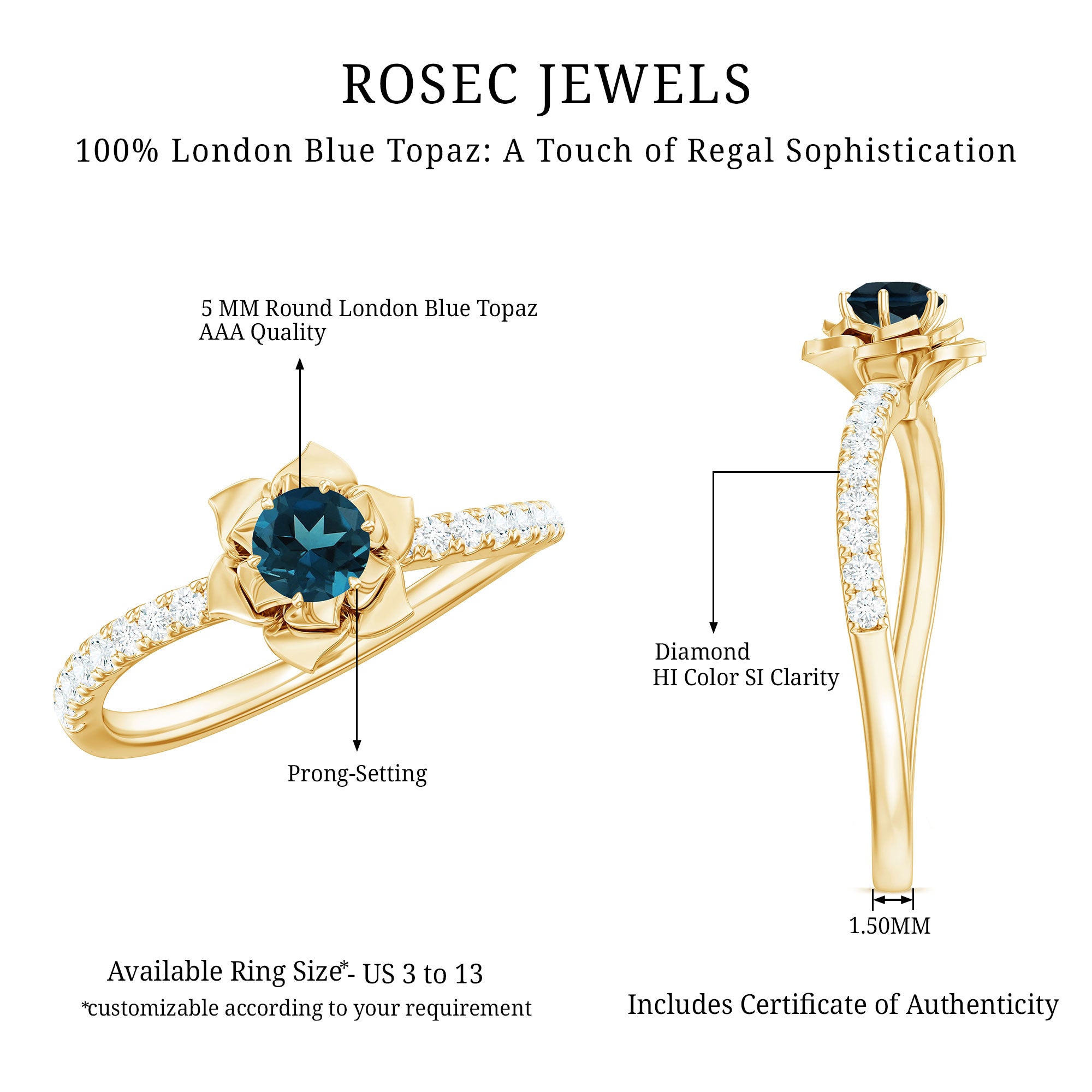 Elegant as a flower in full bloom, this Nature Inspired Engagement Ring embodies beauty drawn directly from the garden. At its heart lies a 5 MM round shape London Blue Topaz, held securely in a prong setting. The blue color stone is softly encircled by a metal petals, arranged to create a charming rose floral design. On either side of the center, round shape diamonds as side stones, contributing a graceful and organic essence to the overall aesthetic. The curved style shank introduces a contemporary flair to this classic style, providing the London Blue Topaz Engagement Ring with a light appearance that feels both sophisticated and fresh. Crafted with AAA quality london blue topaz and HI-SI quality diamonds, this Flower Engagement Ring is designed to radiate with understated elegance. Each detail, from the petals look to curved style band, infuses charm and significance into this creation. This piece transcends mere jewelry; it symbolizes new beginnings, love, and the beauty of nature. Whether you are preparing for a proposal or seeking a timeless engagement ring, this floral design presents a romantic and innovative interpretation of tradition. Ideal for someone who appreciates nature, elegance, and meaningful artistry, this Real Blue Topaz and Diamond Ring is a unique piece crafted to honor enduring love.