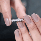 Delicate, dazzling, and full of charm, this Flower Eternity Band is a sweet celebration of sparkle and style. Designed to resemble a row of blooming flowers, each cluster features perfectly set round moissanites that catch the light with every movement. The floral inspired design adds a romantic touch while still keeping things sleek, ideal for someone who loves subtle elegance with a bit of sparkle. Each moissanite in this Half Eternity Ring is carefully prong set to enhance its brilliance and ensure security, while the sleek band keeps the Moissanite Wedding Band comfortable enough for daily wear. What makes this piece even more versatile is its stackable design. Whether paired with your engagement ring, worn beside other bands, or styled solo as a statement of your own, this Moissanite Stackable Ring layers beautifully without losing its charm. Whether you are marking an anniversary, celebrating a milestone, or simply treating yourself, this Flower Wedding Band offers timeless beauty with a fresh, floral twist. It comes complete with a certificate of authenticity and arrives in a beautiful jewelry box, ready to gift or keep.