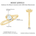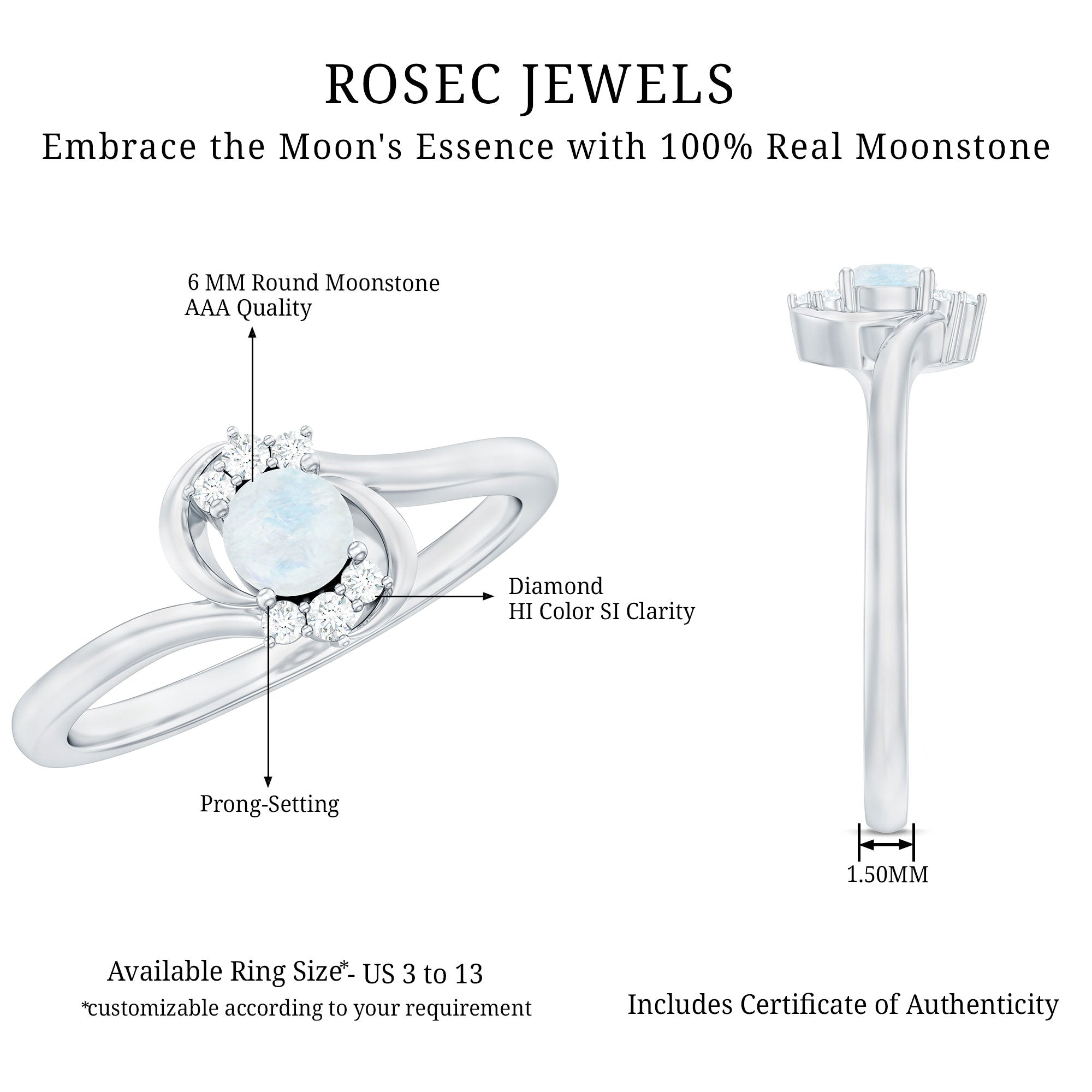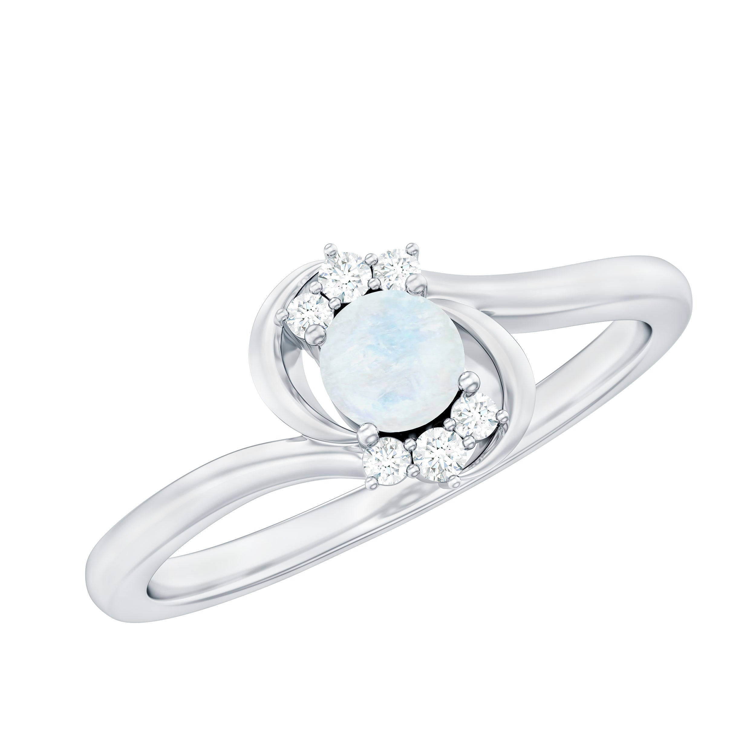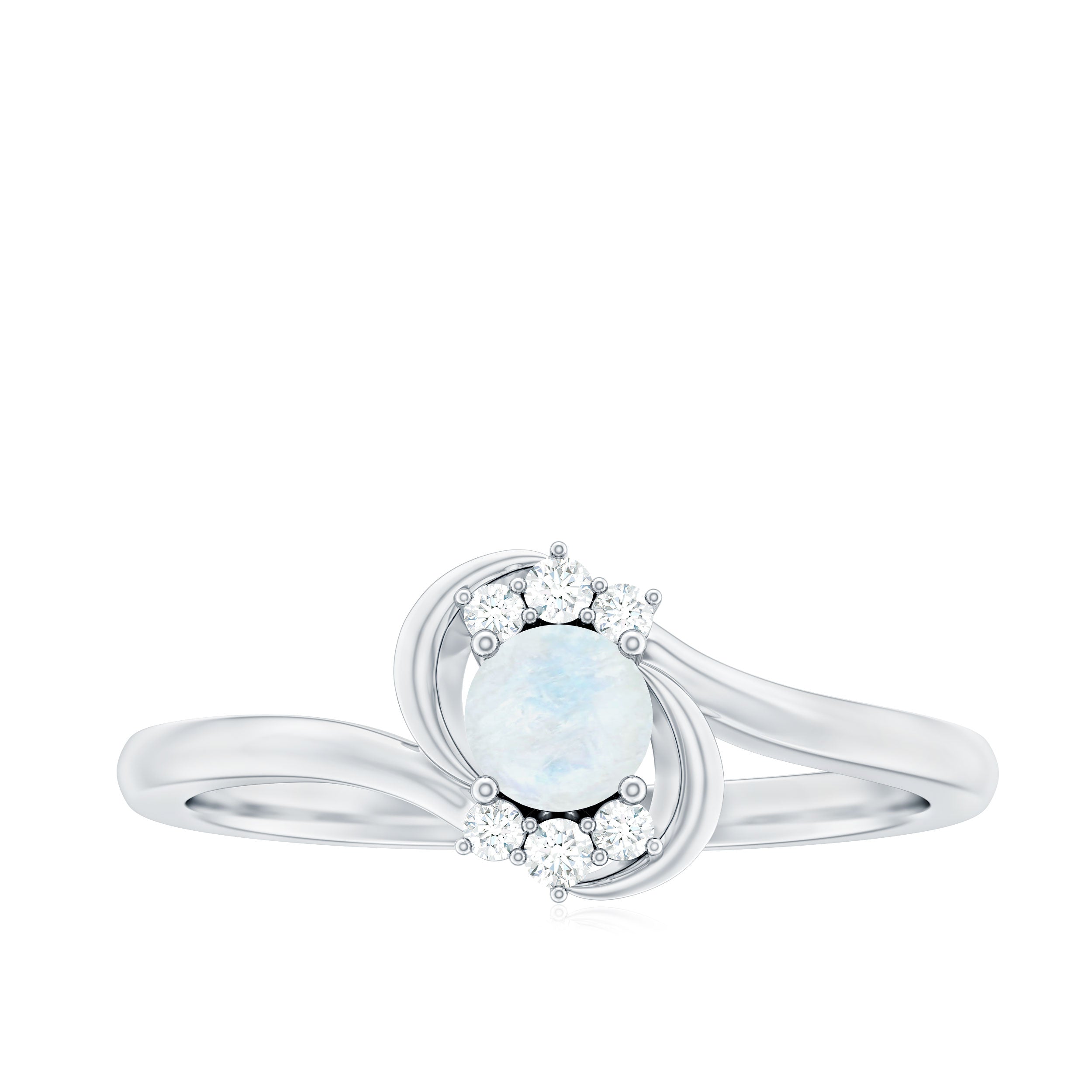 It is a Bypass Ring embellished with Round Shape Moonstone and Diamond in Prong Setting. This Moonstone Promise Ring will be a unique piece for a woman to wear. This Moonstone and Diamond Ring is composed to offer is luxurious look.