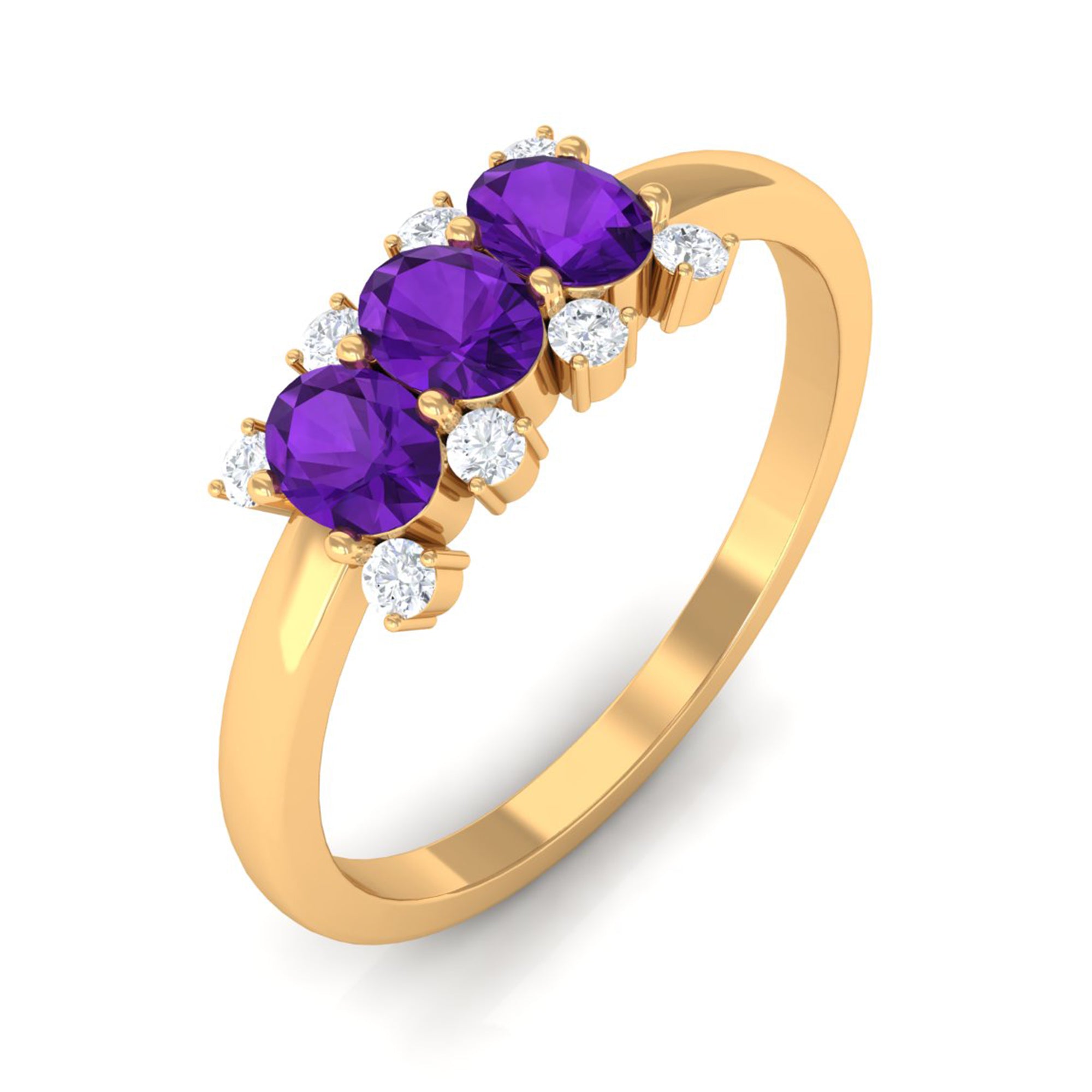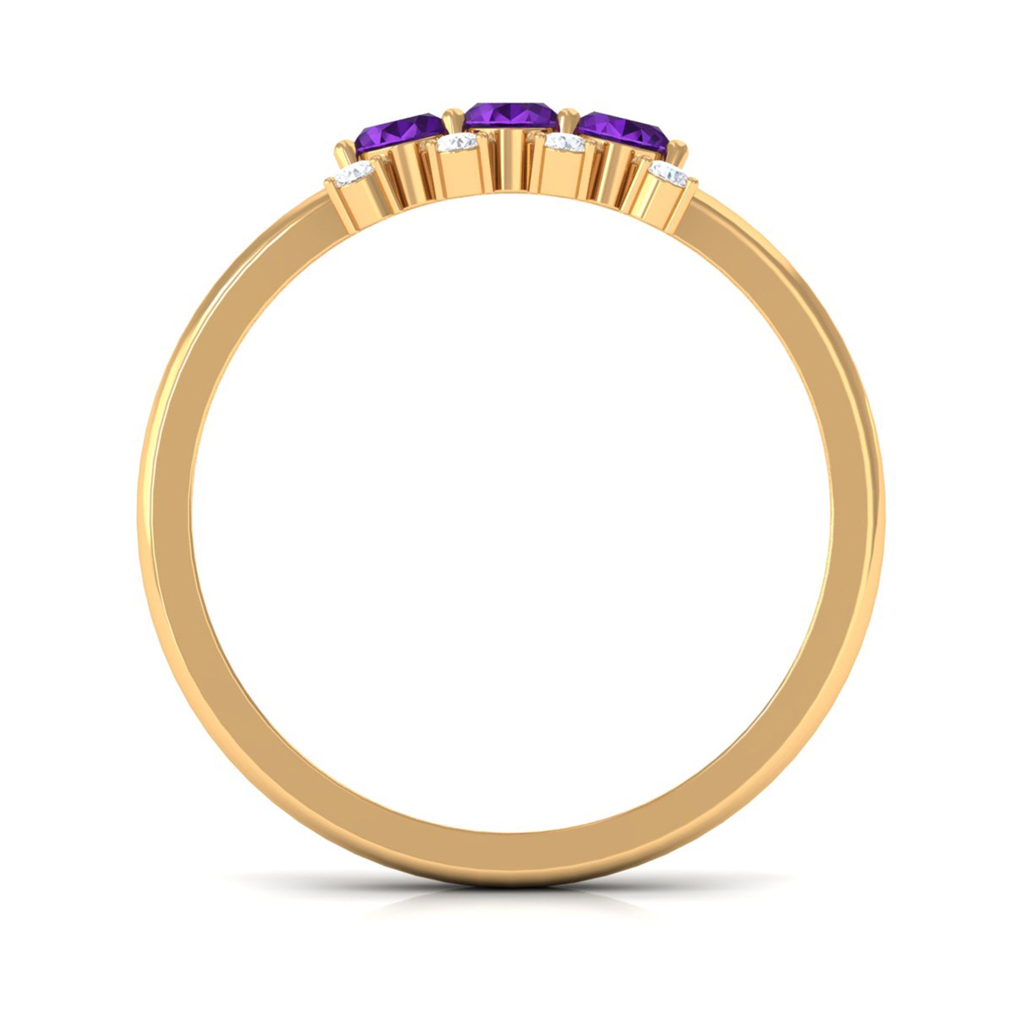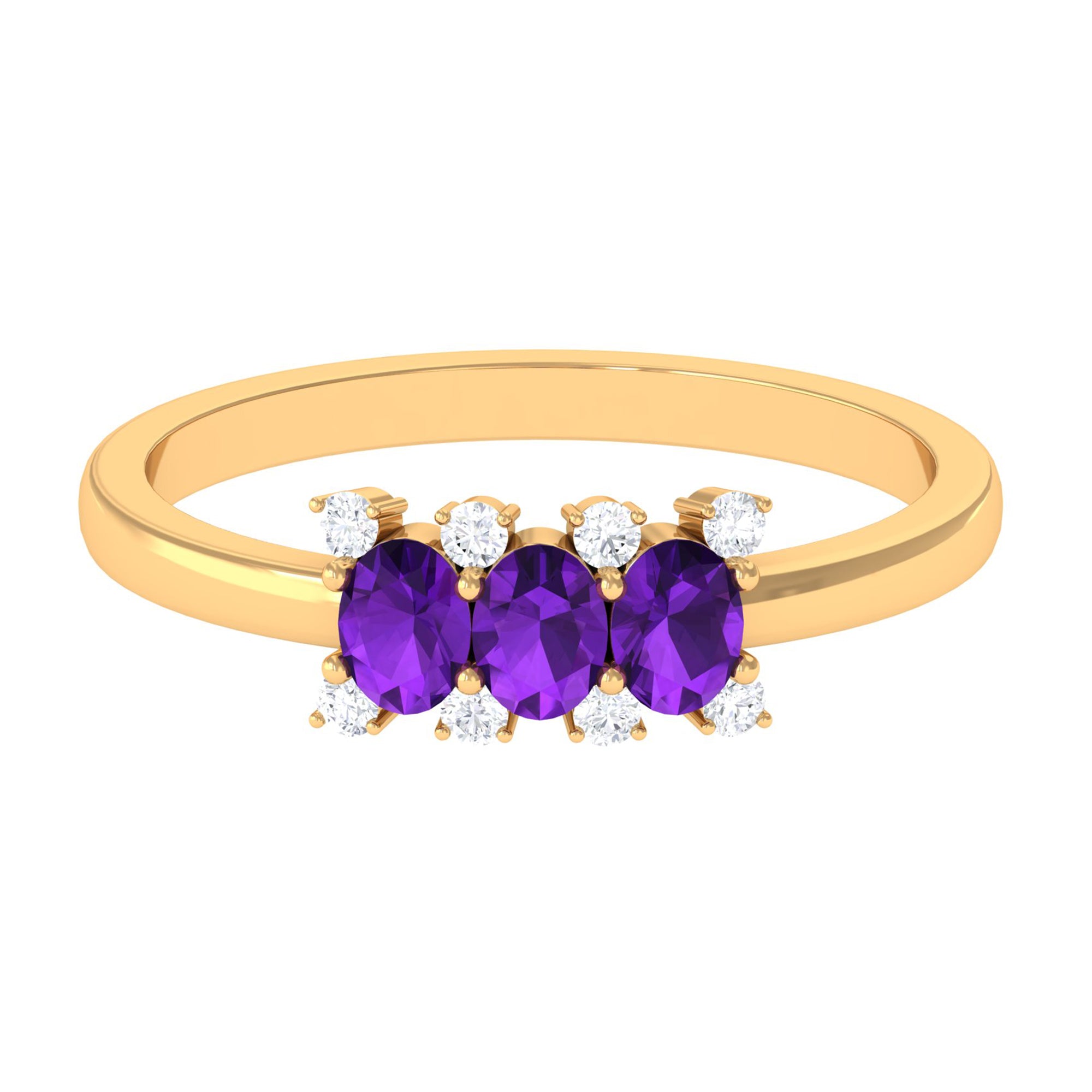 Make your love go forever with this Three Stone Promise Ring for a woman. This Three Stone Ring is consisting of Oval Shape Amethyst and Round Diamond set in a prong setting. This Three Stone Amethyst Promise Ring is available in gold metal.