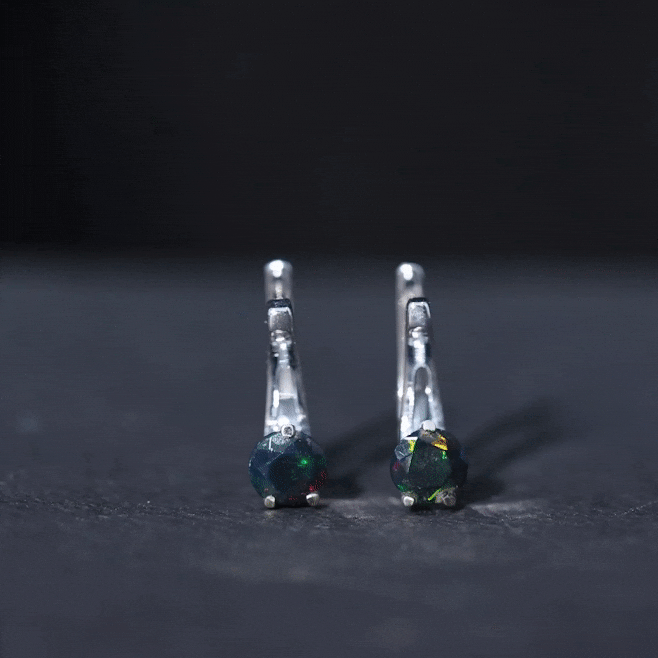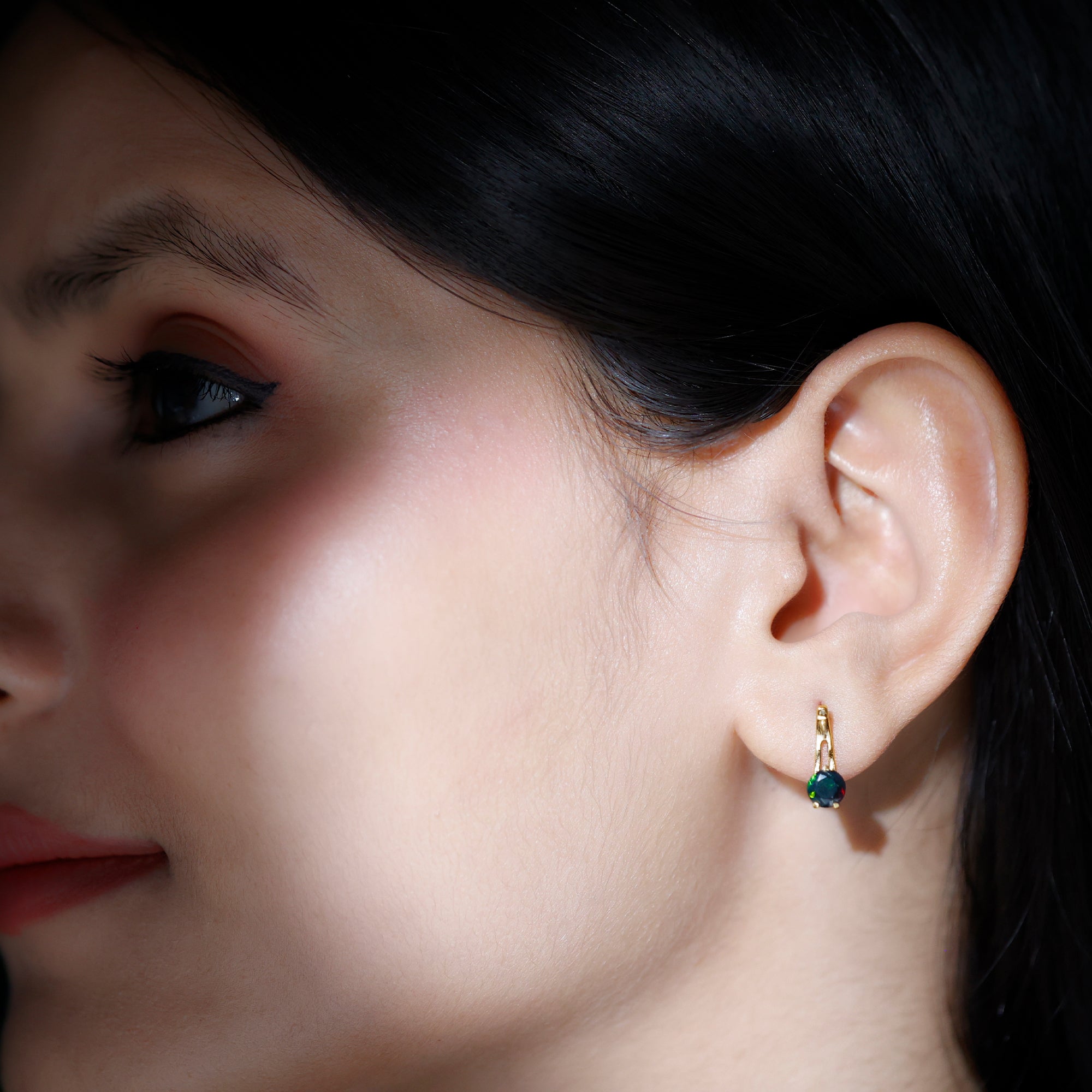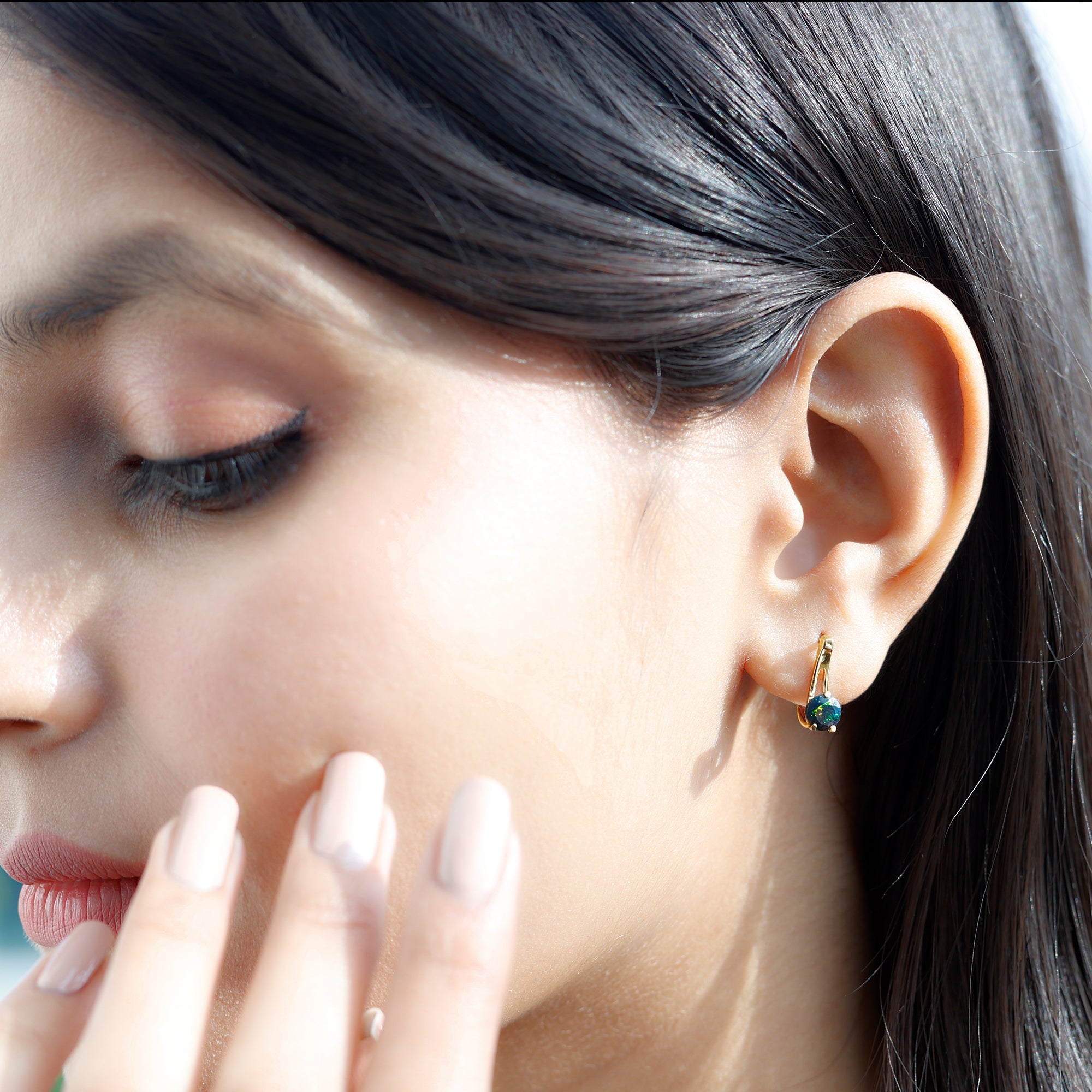Surprise your special someone with these charming J hoop earrings, featuring a solitary round-cut Black opal gemstone set in a three-peg head setting and a solid gold lever-back finding. These Black Opal earrings are both elegant and simple, making them the perfect gift.