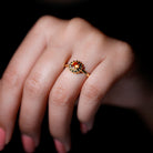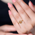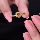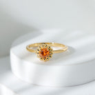 A stunning Solitaire ring featuring a dazzling round cut Orange Sapphire in a golden flower design. The Orange Sapphire is set in a classic prong setting and is surrounded by delicate petals, creating a unique and beautiful piece of jewelry. Perfect for a special occasion, this engagement ring is sure to become a cherished treasure.
