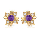 This Sunburst Stud Earrings is embellished with Round Shape Amethyst is set at the center in a Bezel Setting and round shape Diamond are set as floral pattern, crafted in a Solid Gold.