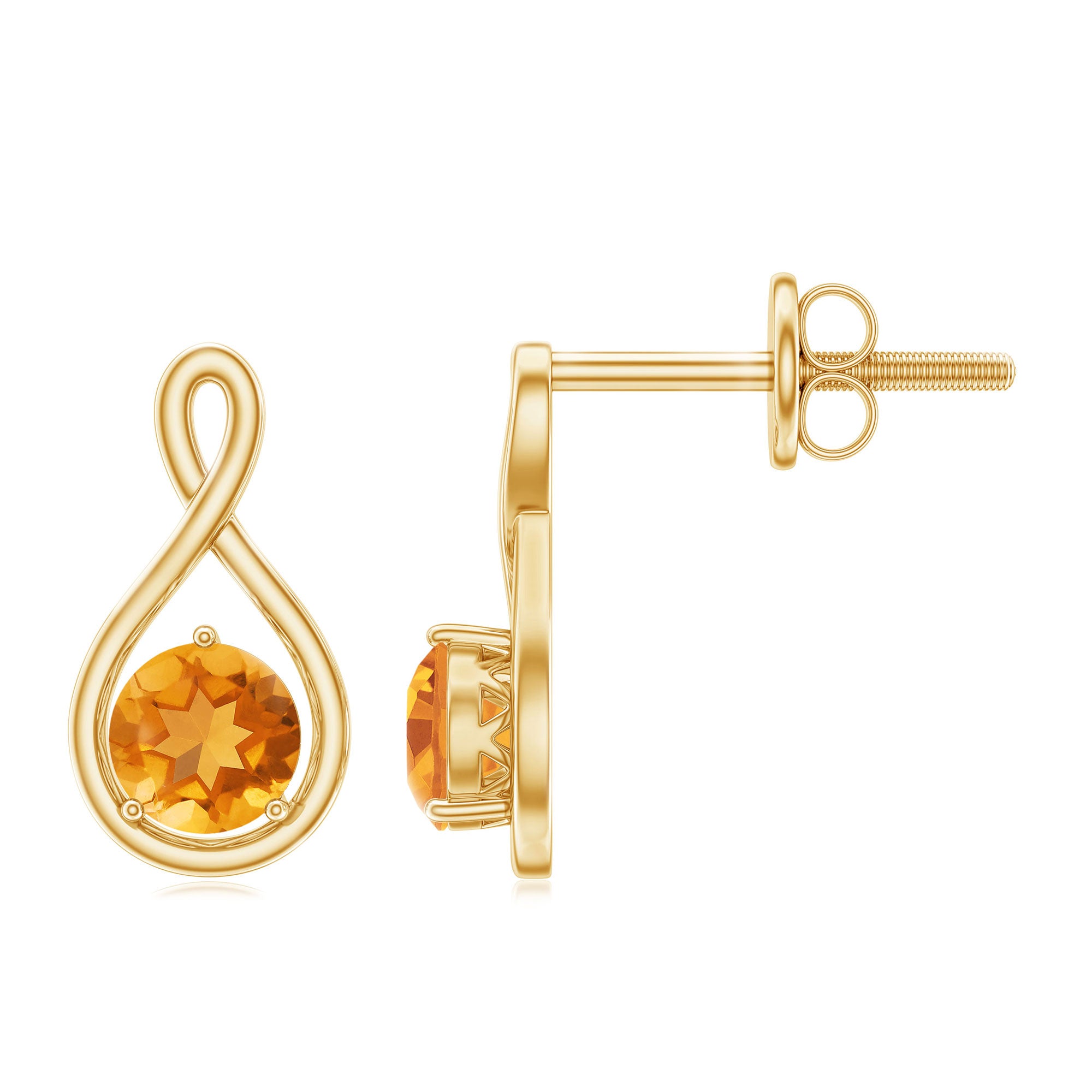 The Elegant Gold Infinity Pattern Stud Earrings embellished with 4x4 MM Round Cut Citrine Solitaire Gemstone. Gemstone is set Beautifully in the Solid Gold crafted Infinity Pattern. Three Prong Setting and Screw Back Finding make the Pair of Stud Earring more Charming.