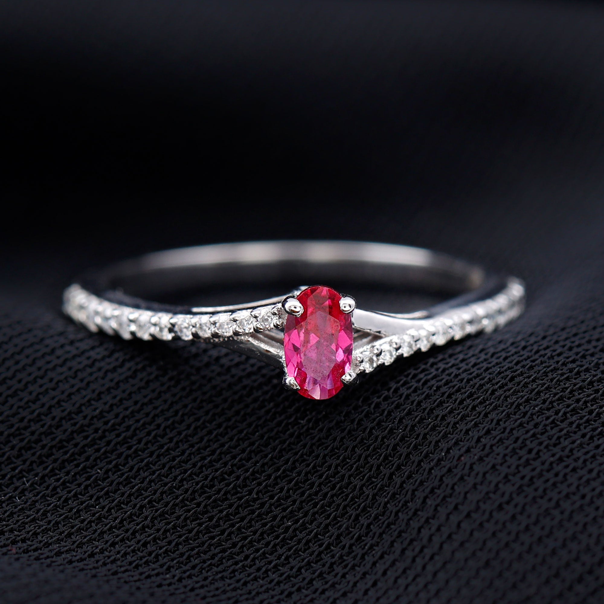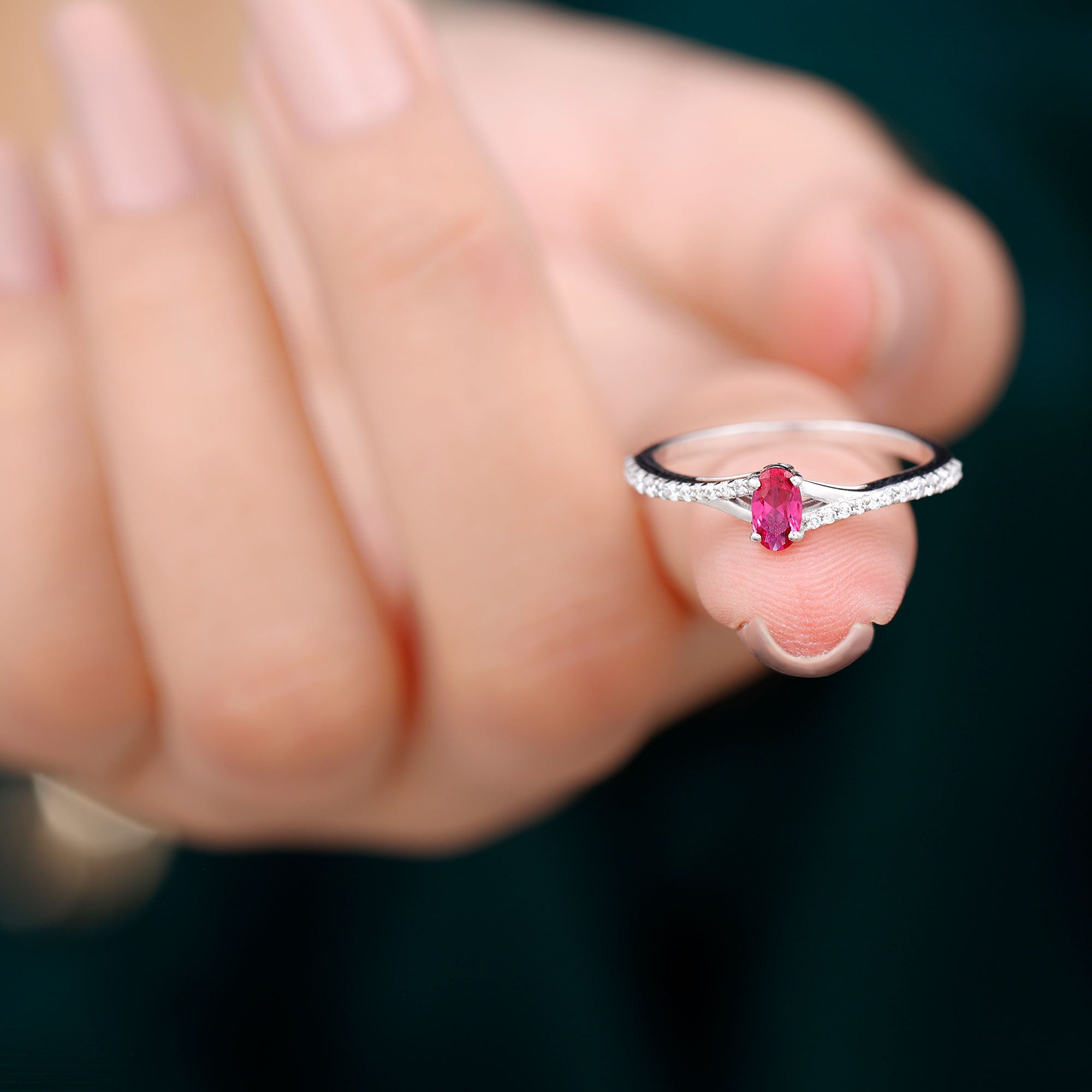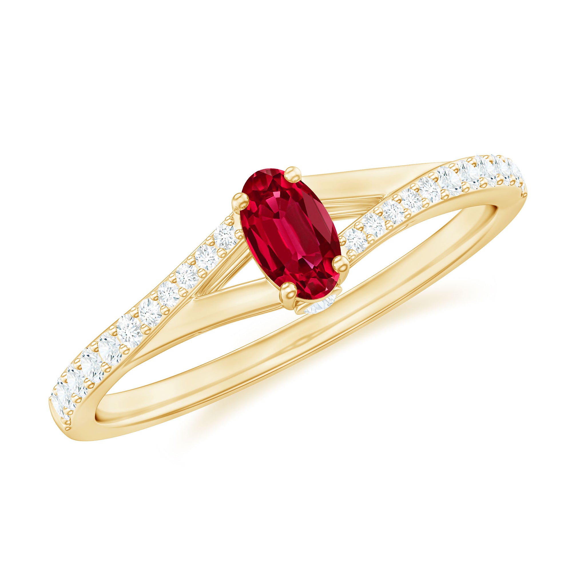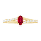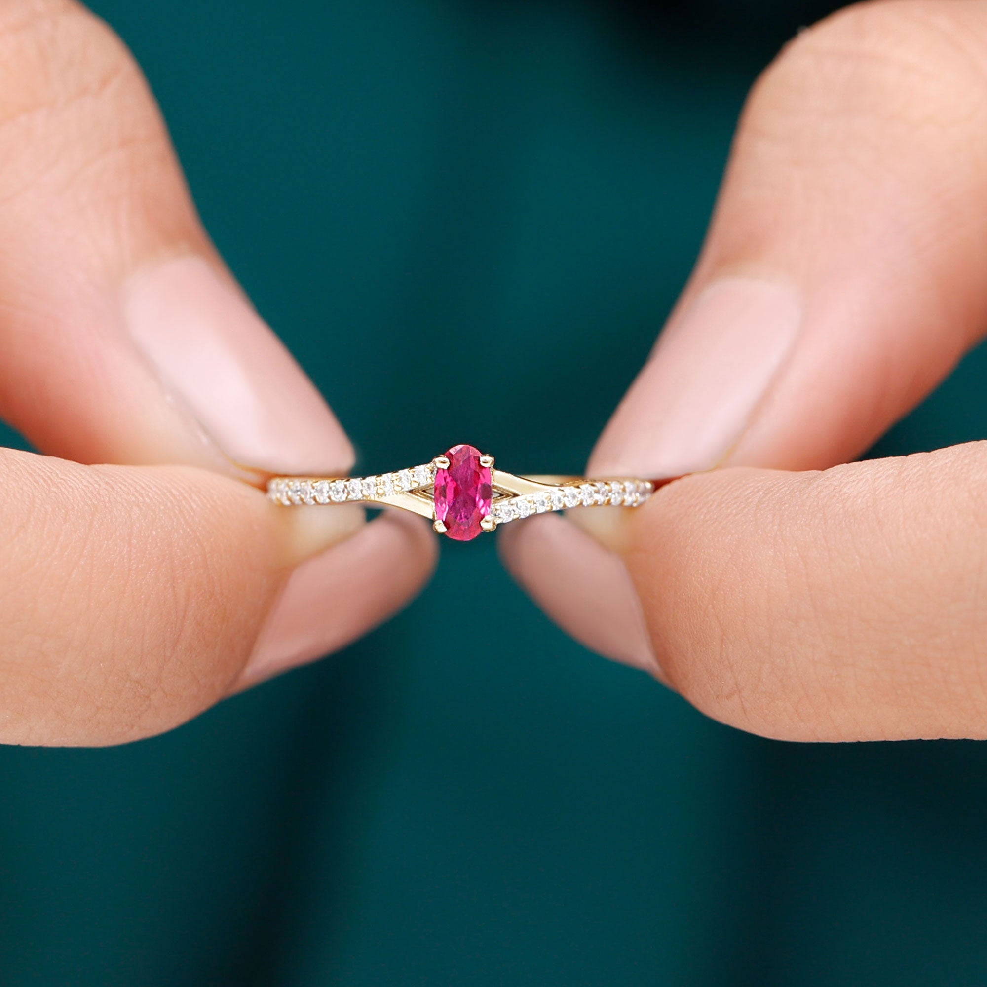 This split shank ring for women features an oval-cut created ruby solitaire set in a prong setting and surrounded by round-cut Diamond in pave setting.