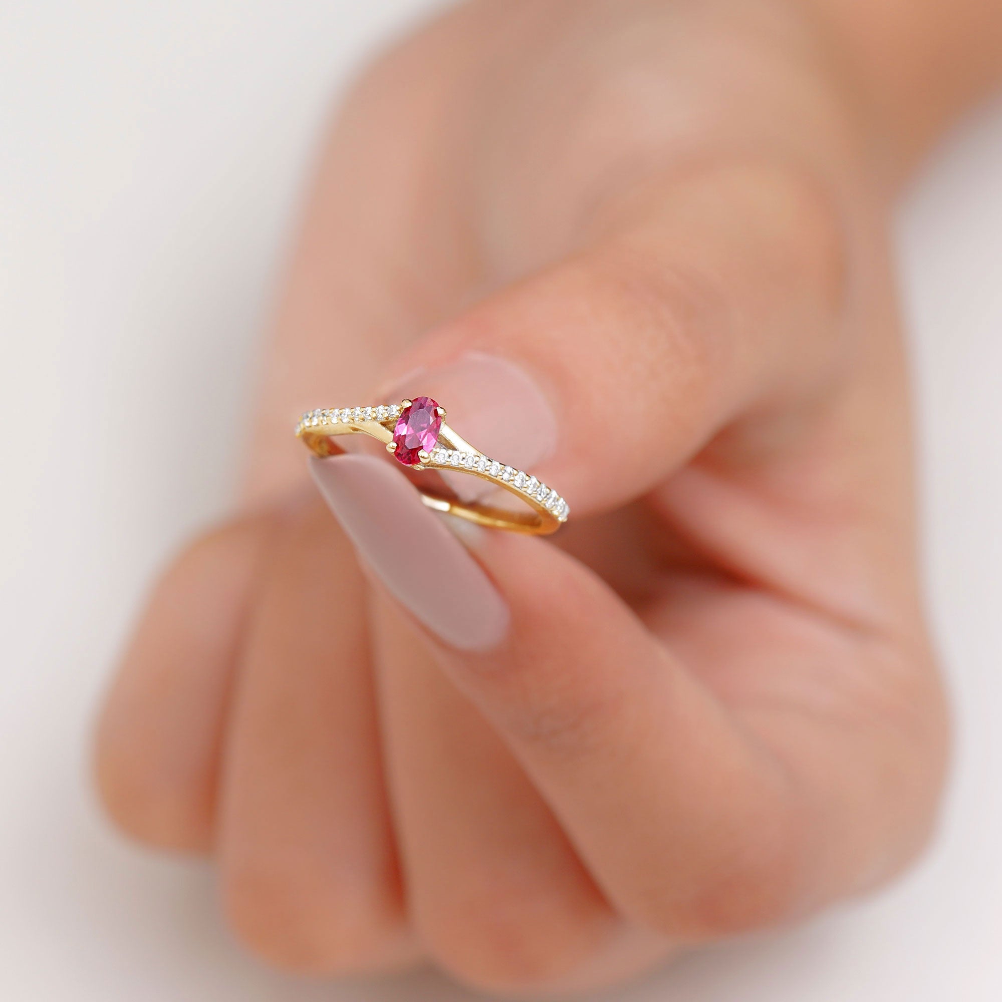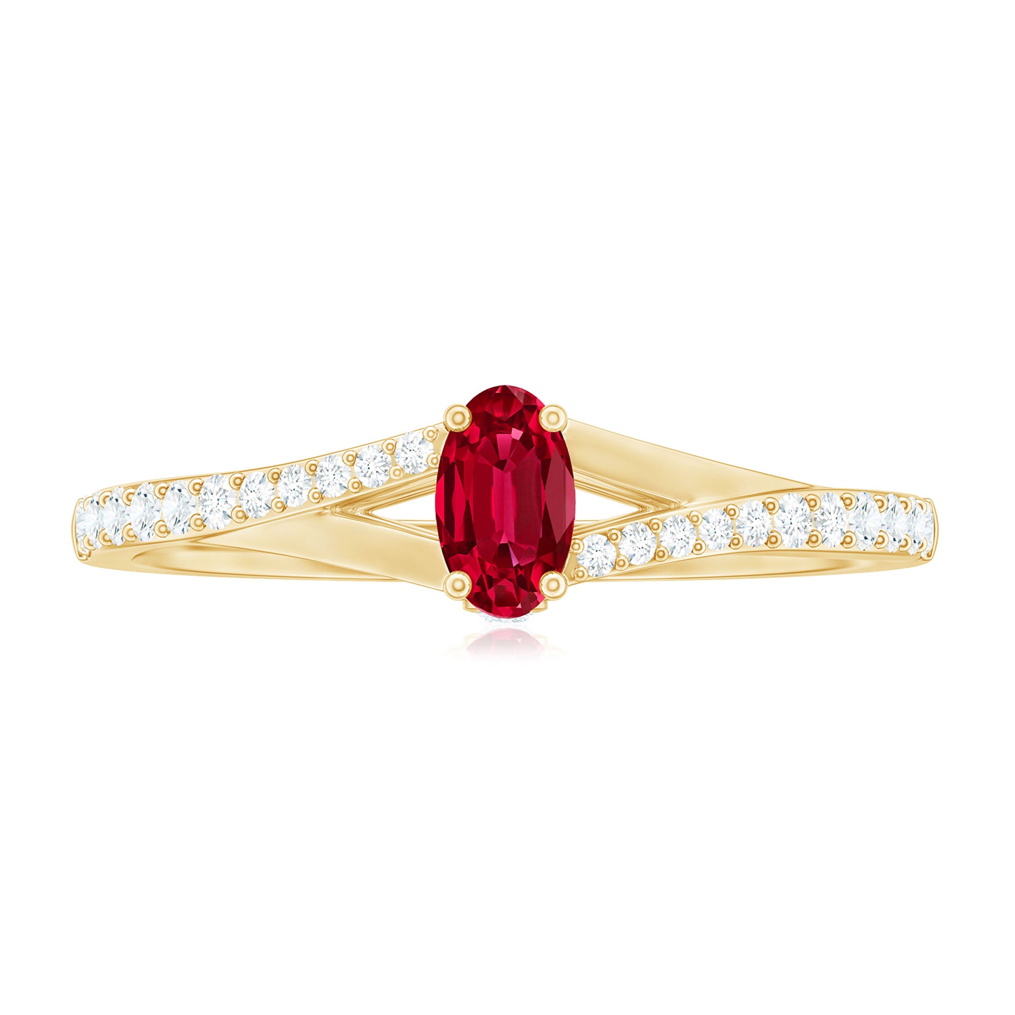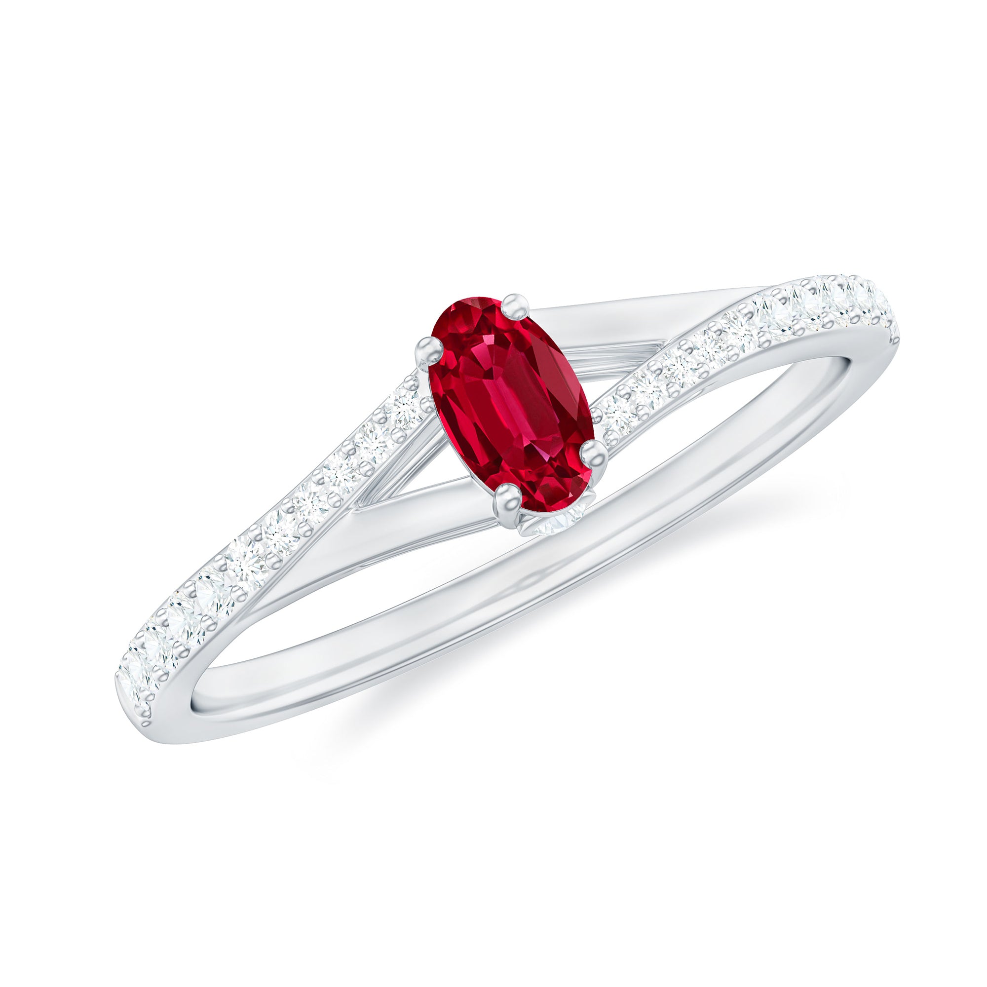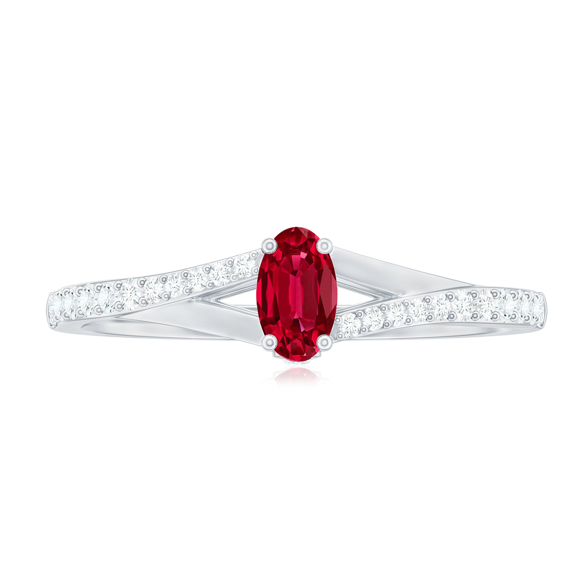 This split shank ring for women features an oval-cut created ruby solitaire set in a prong setting and surrounded by round-cut Diamond in pave setting.