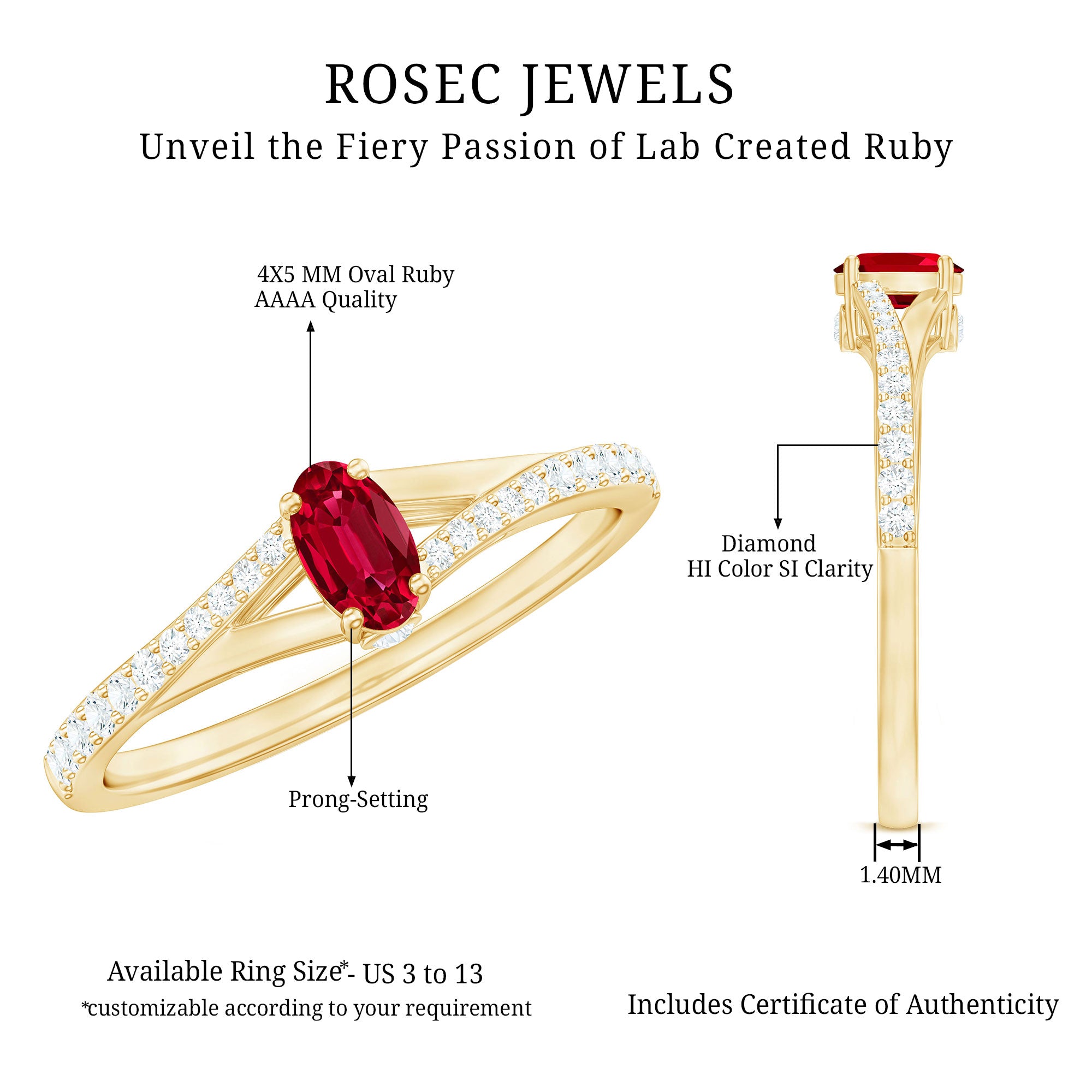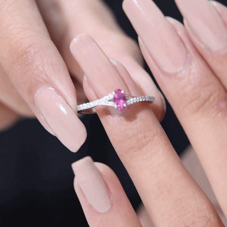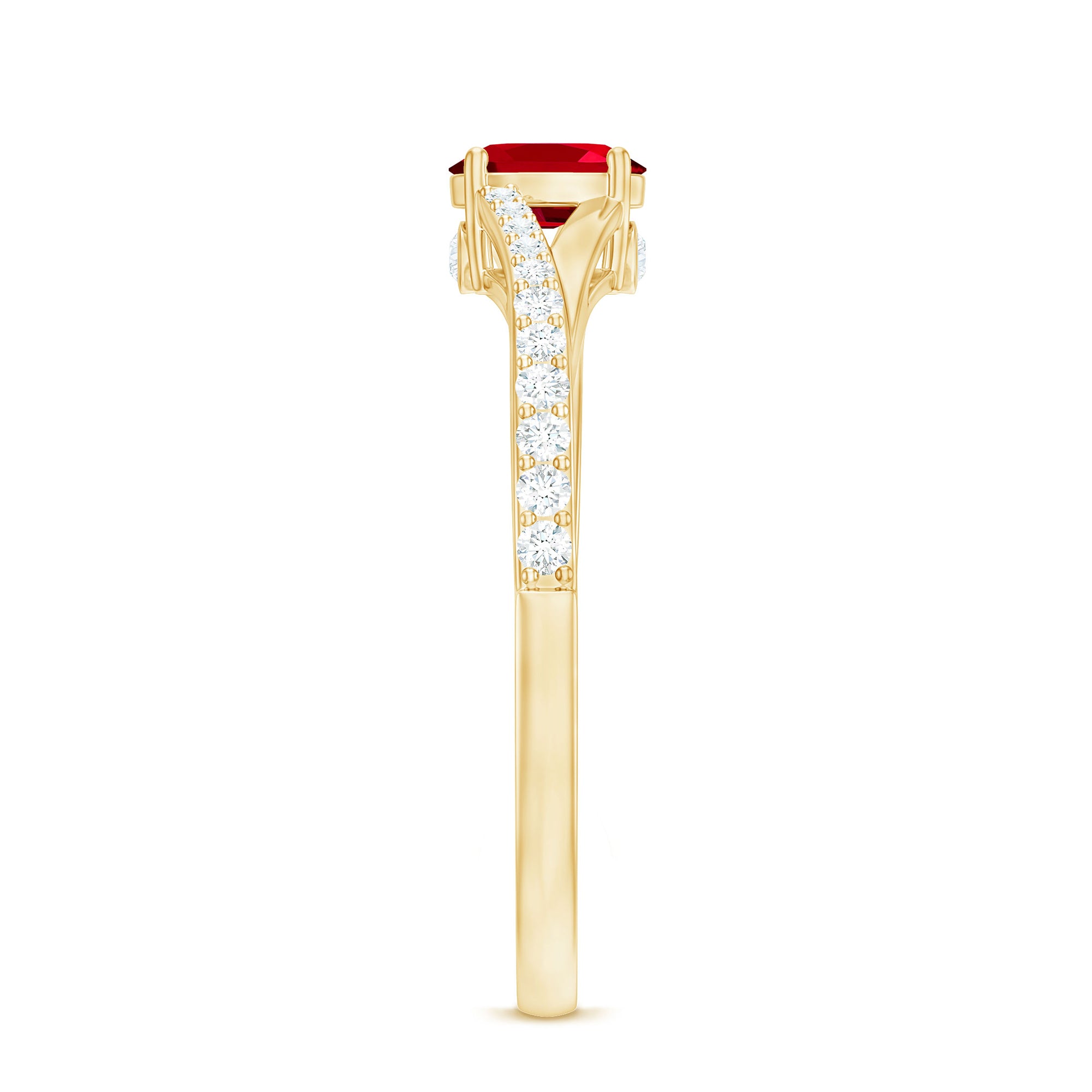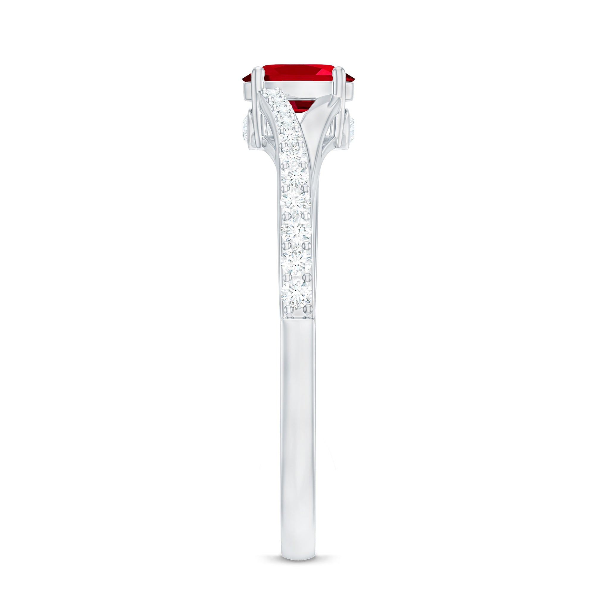 This split shank ring for women features an oval-cut created ruby solitaire set in a prong setting and surrounded by round-cut Diamond in pave setting.