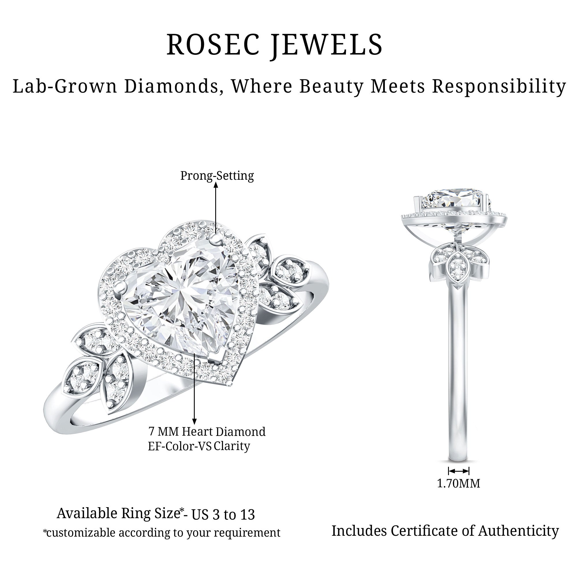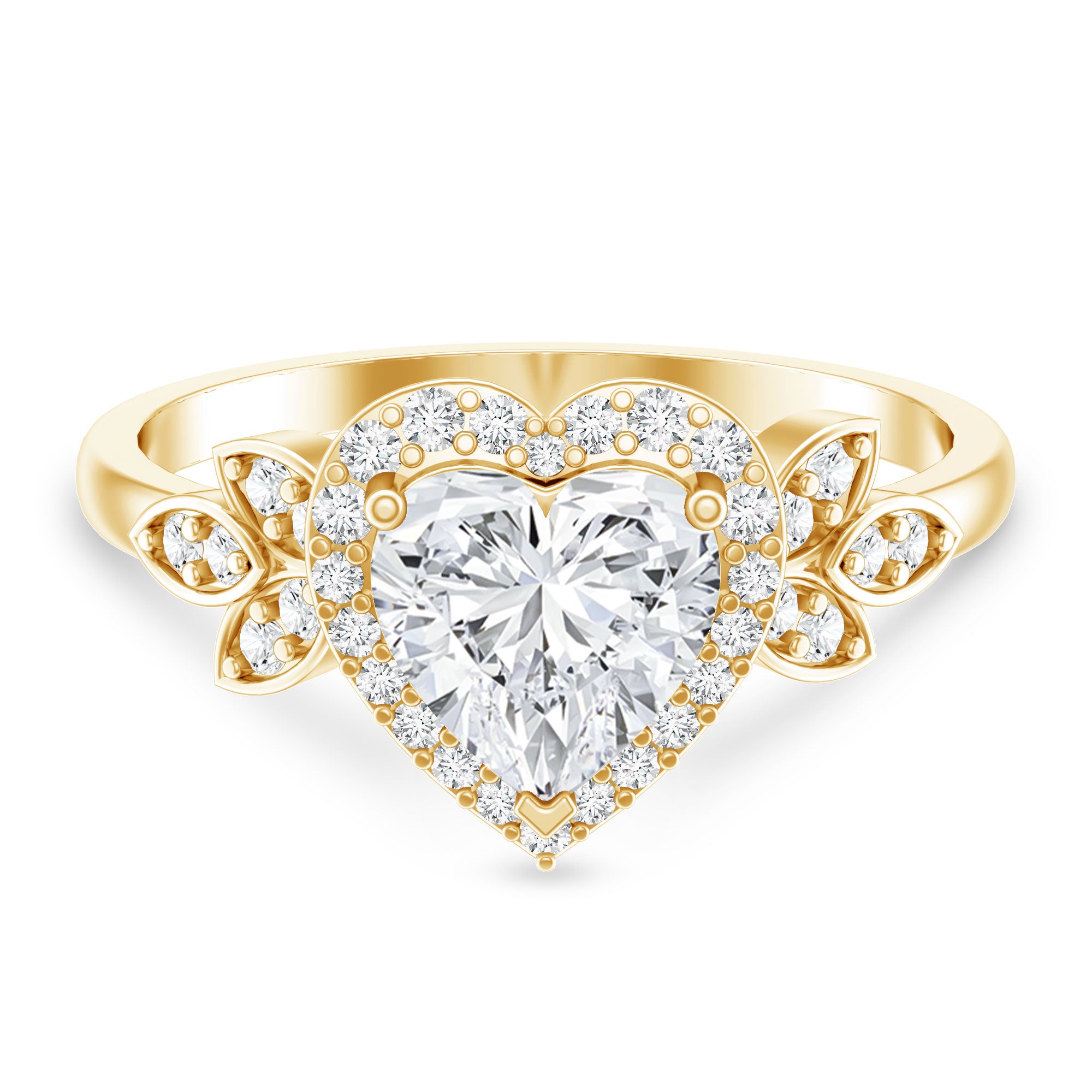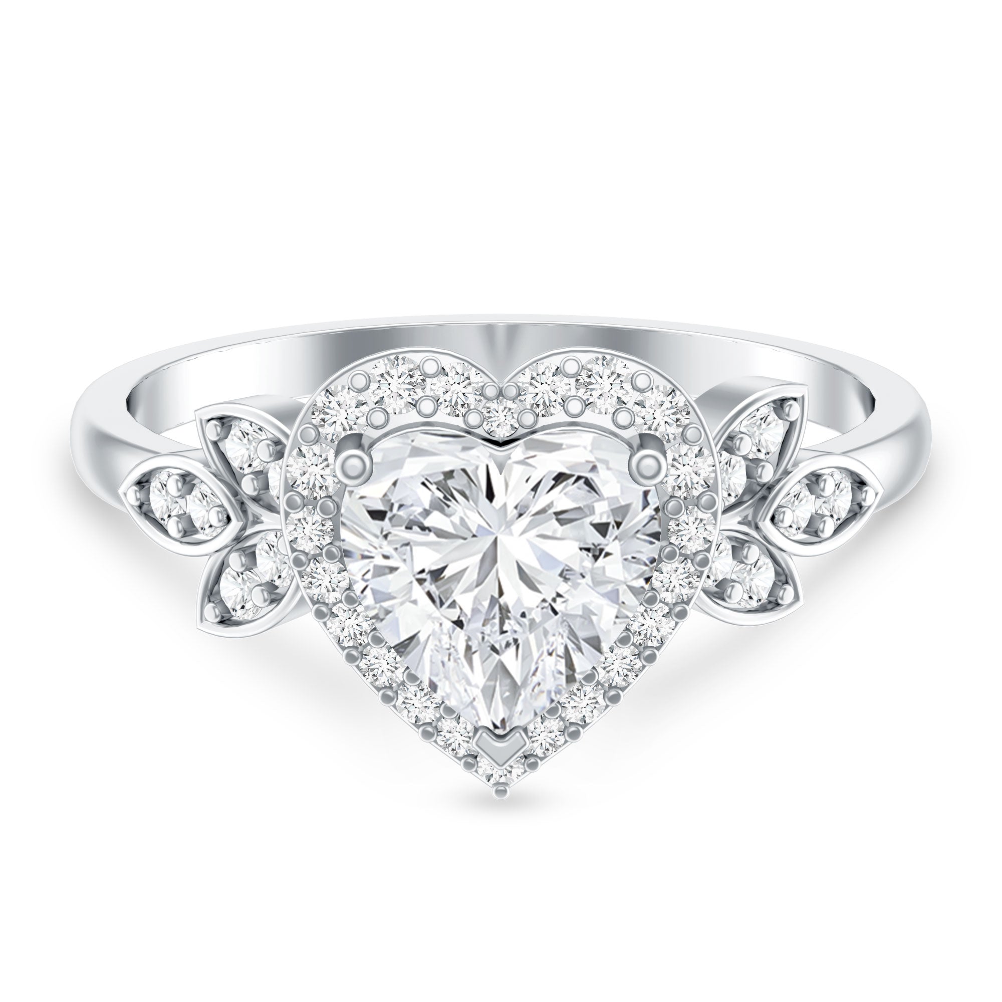 Make your love unforgettable with this beautiful Heart Engagement Ring, designed to express deep feelings and lasting commitment. At the center of the ring is a 7 MM heart shaped lab grown diamond that shines with EF color and VS clarity. The heart shape adds a romantic touch, making the Lab Grown Diamond Engagement Ring a meaningful symbol of love. Surrounding the center diamond is a delicate halo of small round cut lab diamonds. Along the band, more round lab diamonds are set inside marquise shaped frames, forming a graceful leaf-like pattern that adds beauty and fine detail to the design. This Heart Shape Diamond Ring blends classic style with a modern romantic look. Available in different sizes, the Halo Engagement Ring is designed to fit just right. Ideal for a proposal, anniversary, or special milestone, it is a meaningful promise of love and devotion. Elegant, romantic, and full of emotion, it is a ring she will treasure forever. Presented in a luxurious signature jewelry box, this Lab Grown Engagement Ring is ready to mark the beginning of your forever.