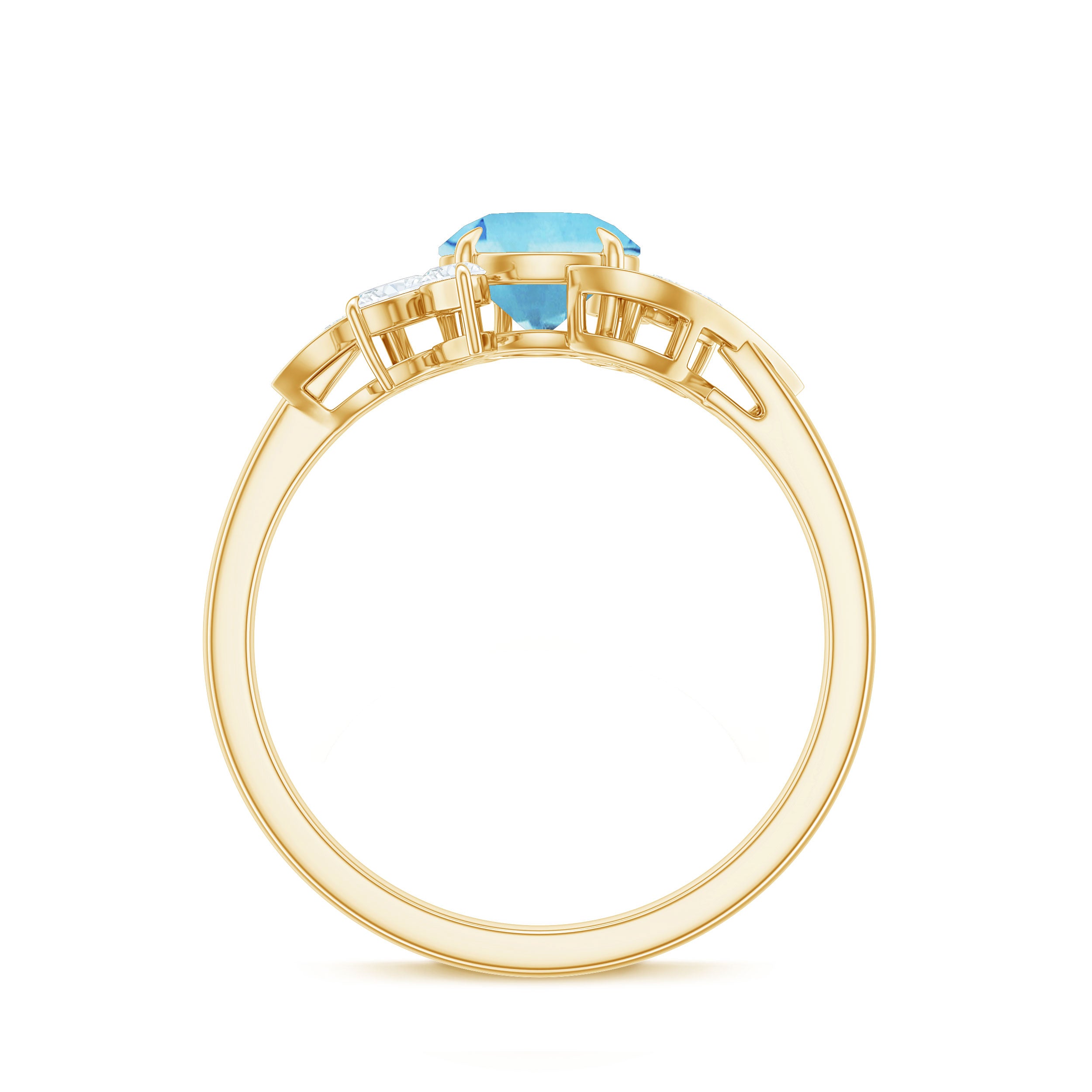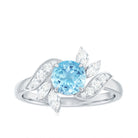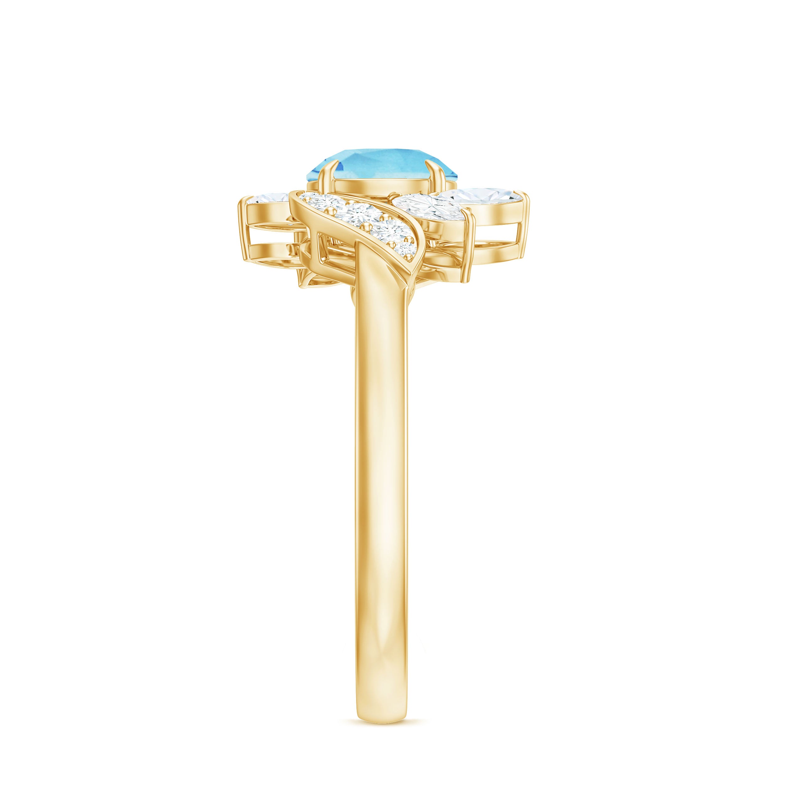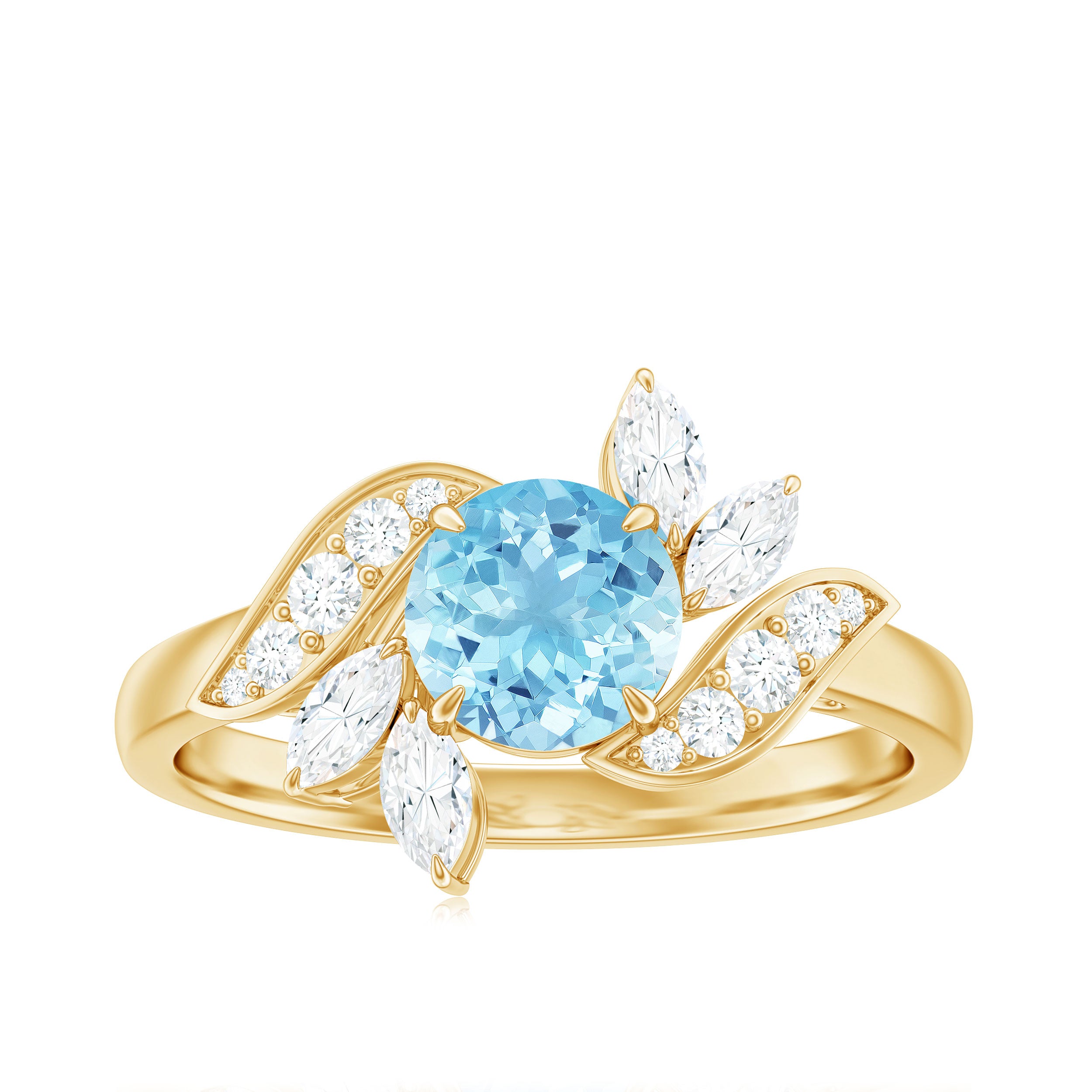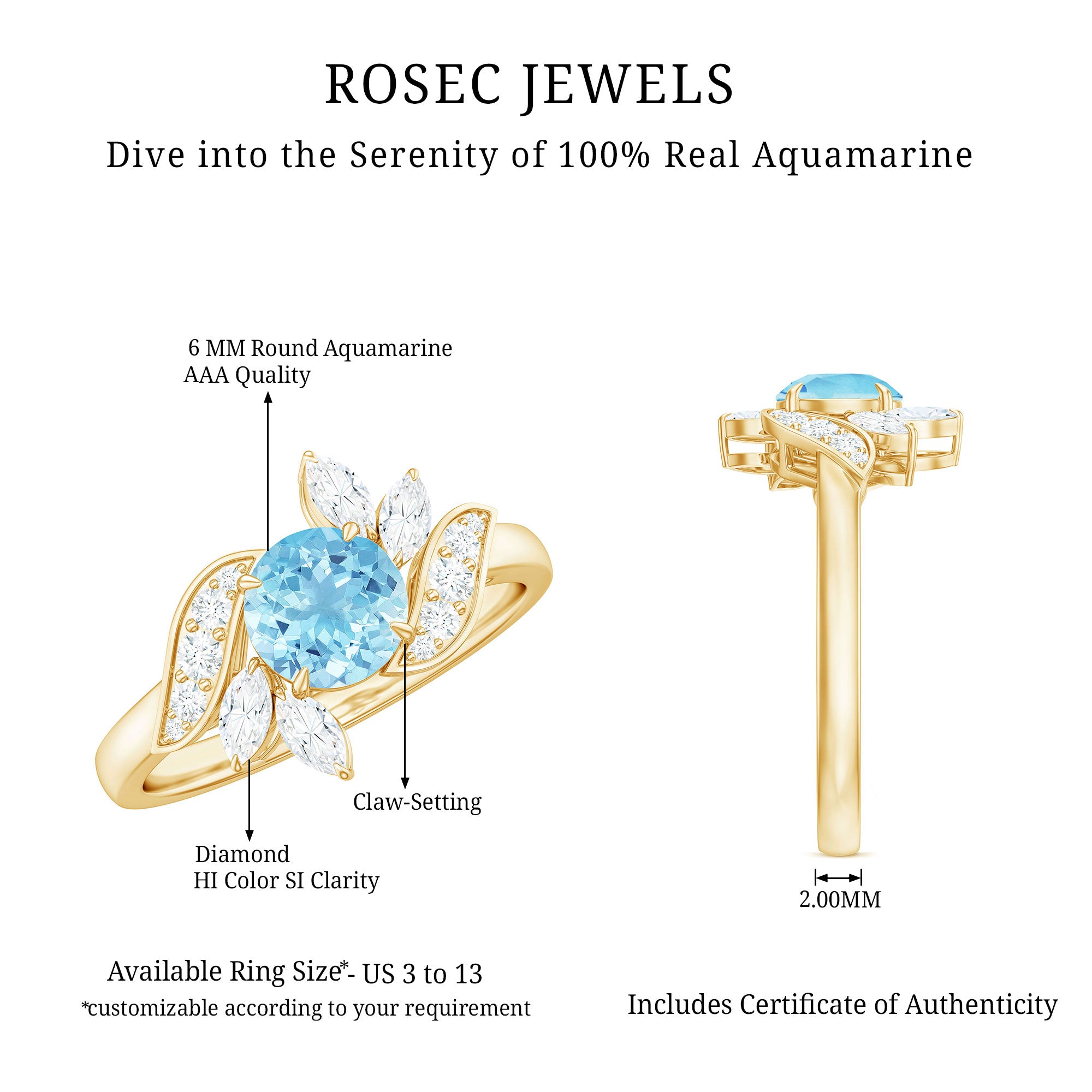 Celebrate your magical love with this enchanting flower engagement ring, perfect for the one who has brought magic into your life. This stunning ring features a captivating round-cut aquamarine gemstone, which takes center stage in a secure claw setting. The unique shank of the ring is adorned with a combination of marquise and round-cut Diamond gemstones, adding extra sparkle and brilliance to the already dazzling design. Crafted from solid gold, this engagement ring is both luxurious and durable, making it a perfect choice for your fiancé to wear on her happiest day. With its captivating beauty and unique design, this ring is a wonderful way to express your love and commitment to your partner.