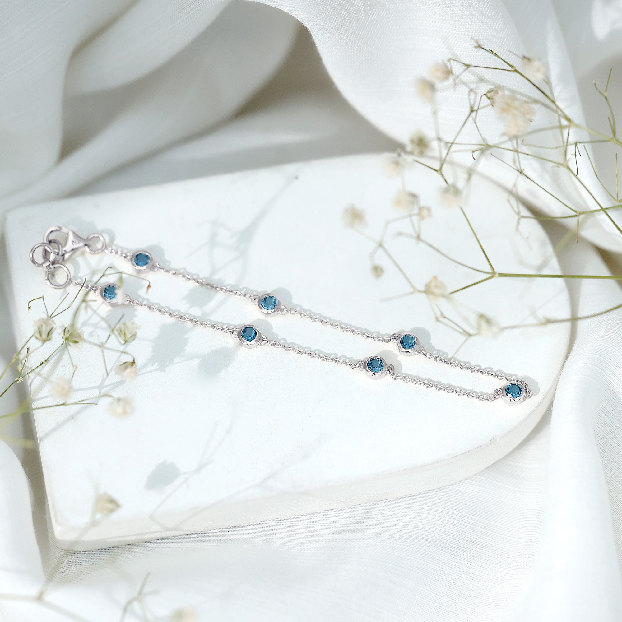 1.25 CT Bezel Set London Blue Topaz Seven Stone Station Chain Bracelet