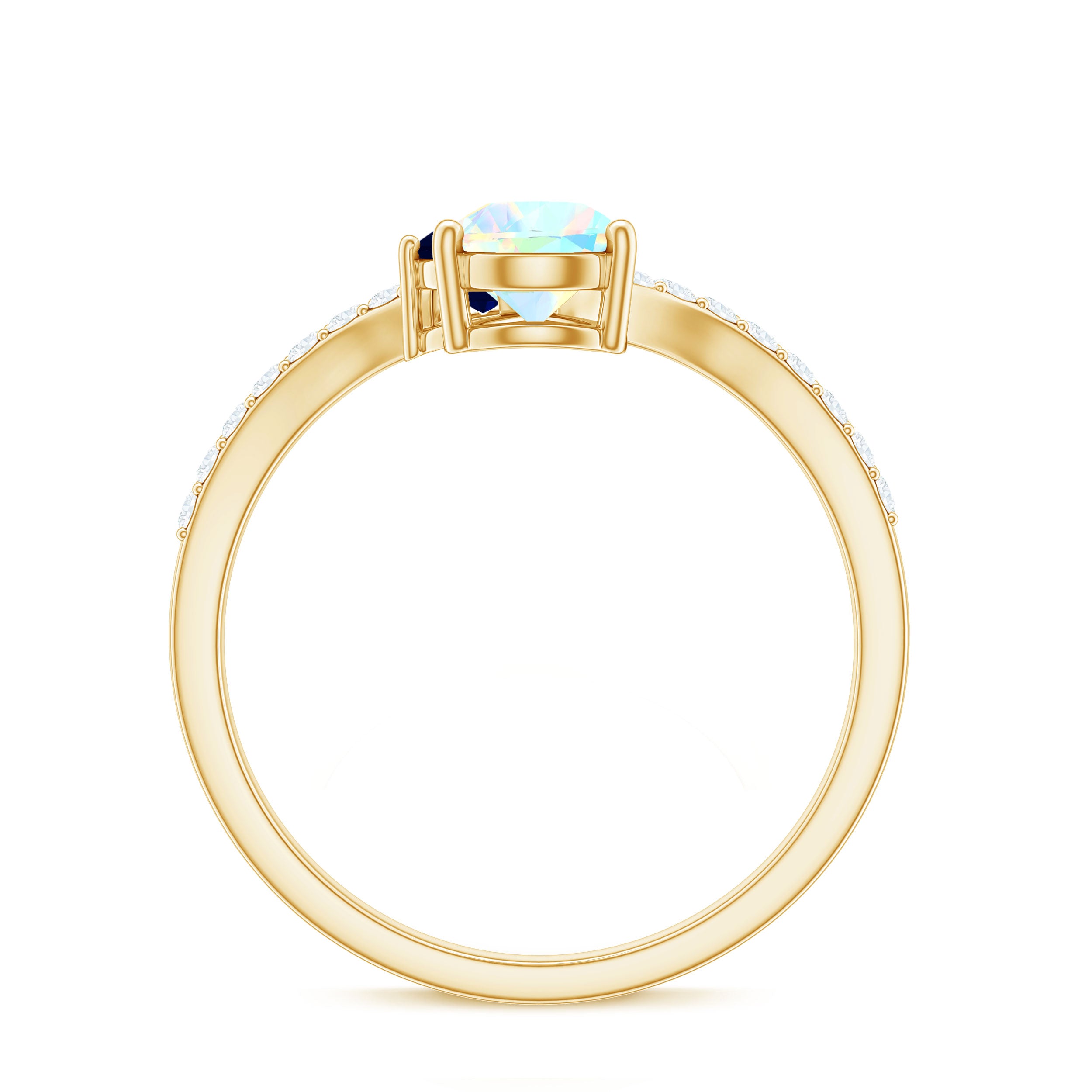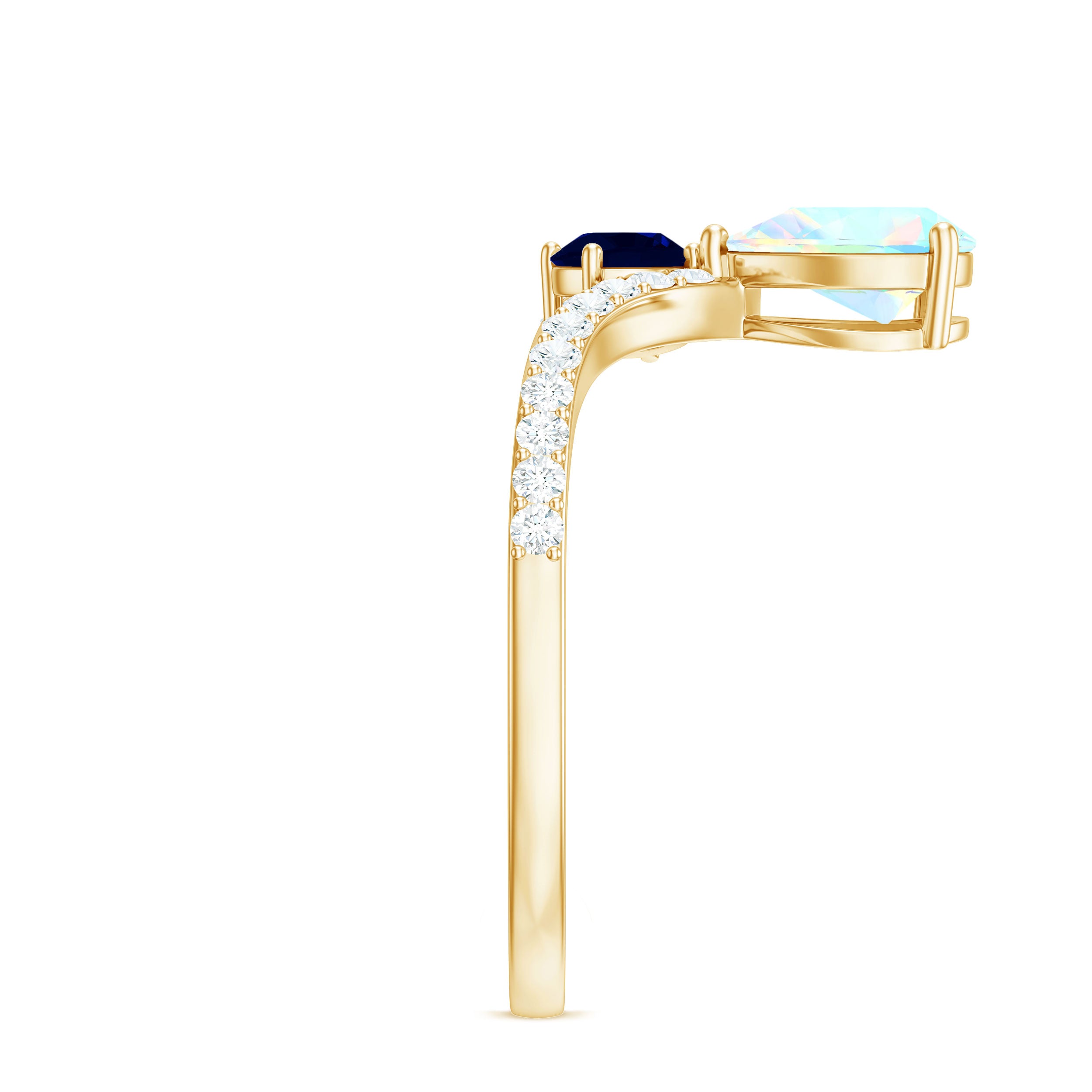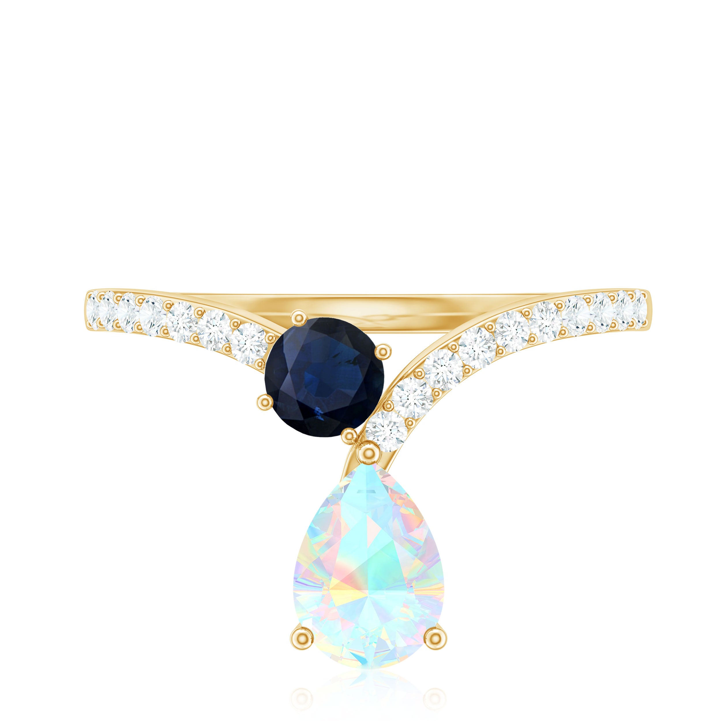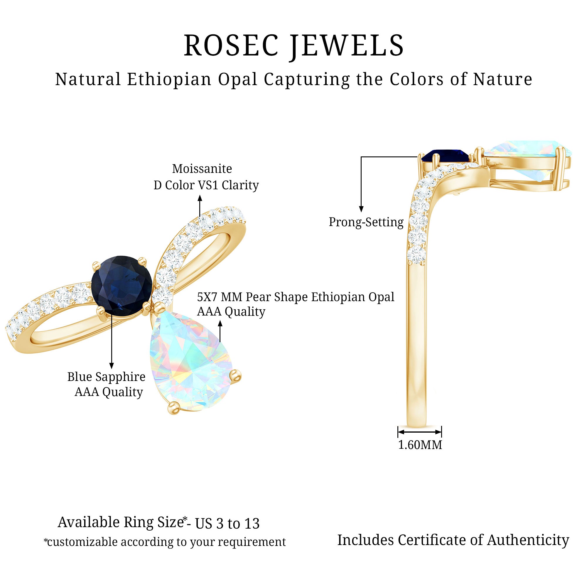 Make your good day even better with this stunning Ethiopian Opal and Blue Sapphire Ring. Surprise your beloved with this remarkable Sapphire and Opal Ring, which boasts a brilliant combination of round shape blue sapphire and pear cut Ethiopian opal, both carefully set in prong setting. The ring itself is crafted from solid gold, adding a touch of elegance and sophistication to the overall design. With its sparkling moissanite stones and captivating gemstones, this ring is sure to be a cherished keepsake for your blooming lady love.