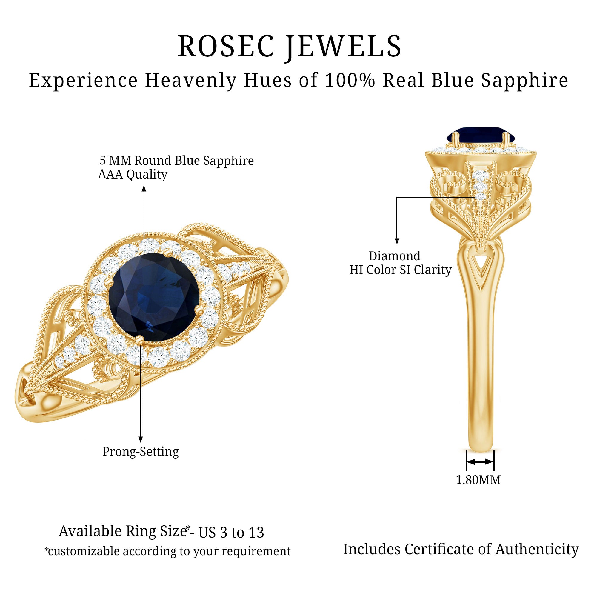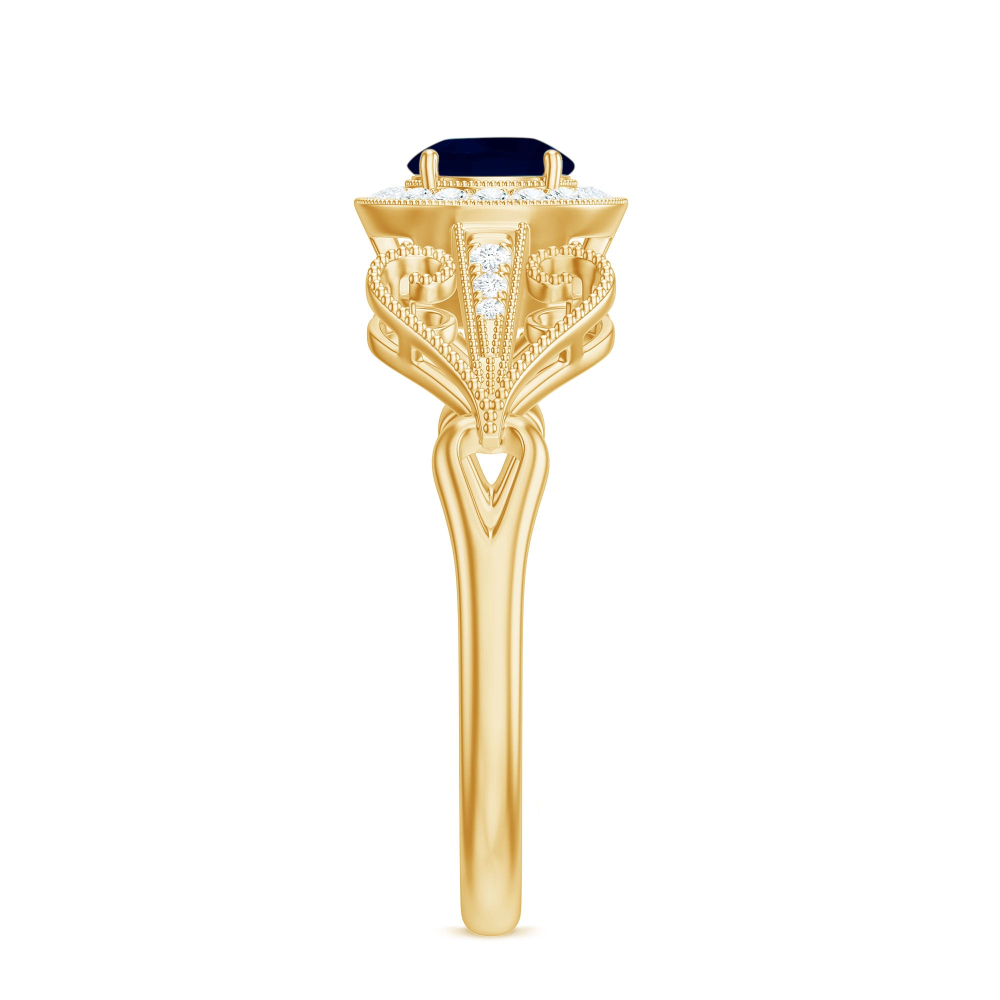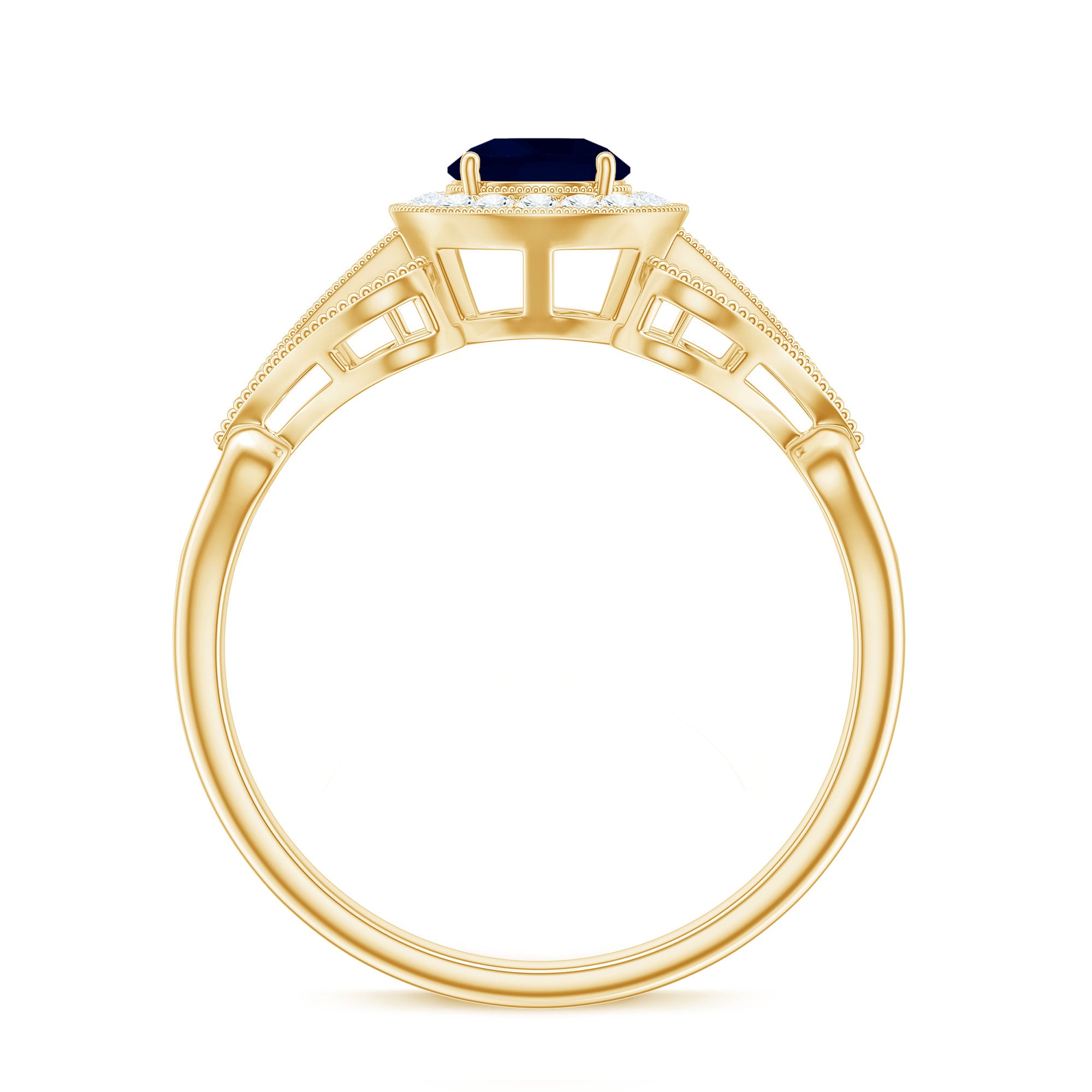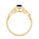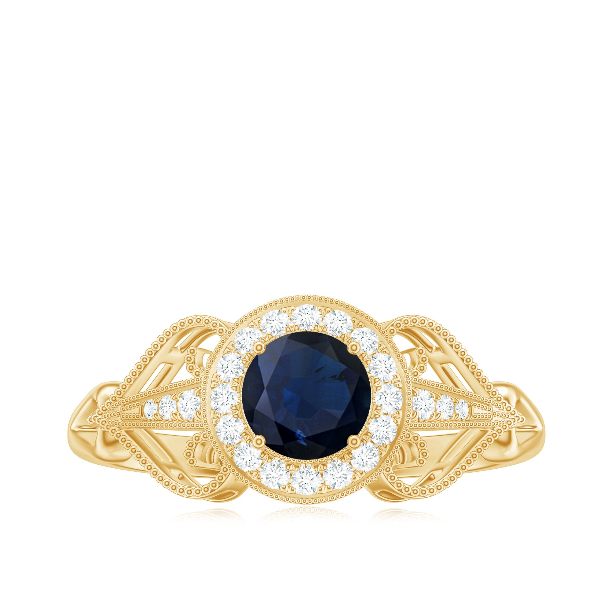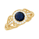 Antique Engagement Ring is set with precious Round Shape Blue Sapphire as the solitaire with small Diamond in halo. Unique Vintage Ring is adorned with beaded design. This Art Deco Ring is composed in Gold. This classic Blue Sapphire ring gives you a modern and classy look at the same time.