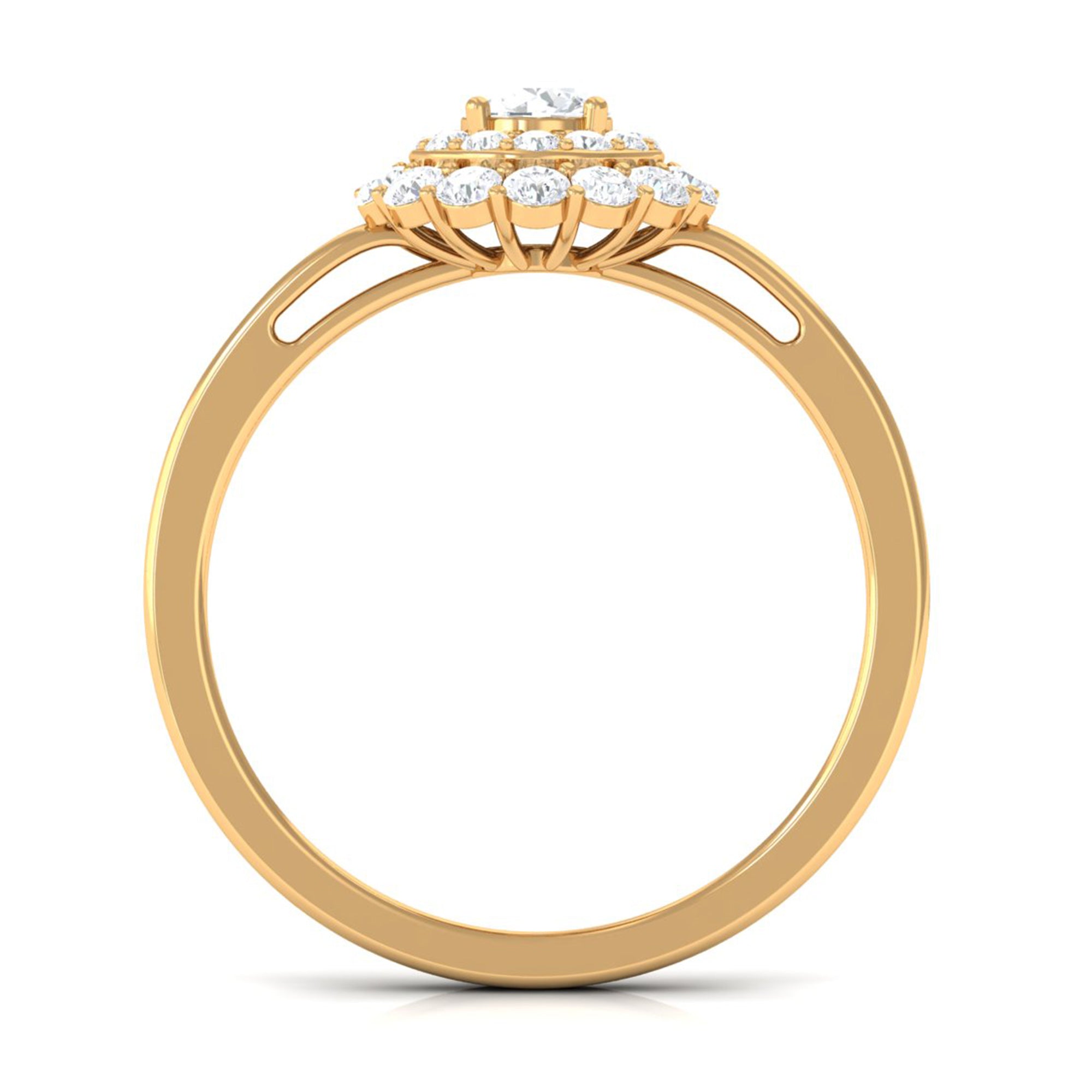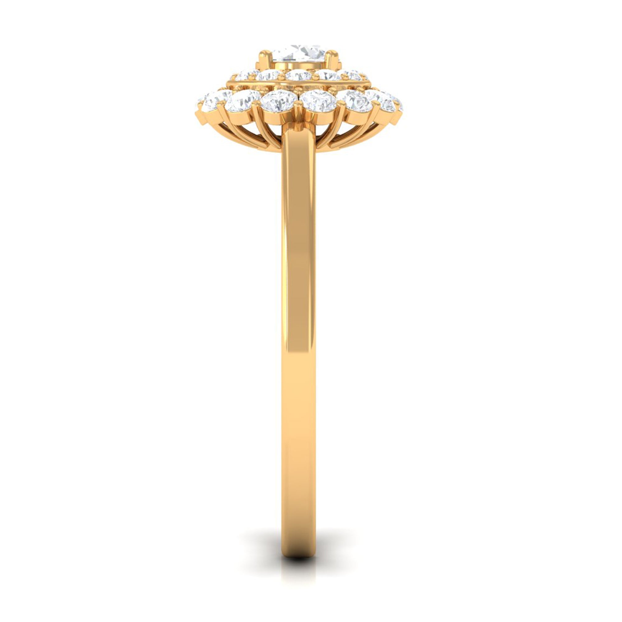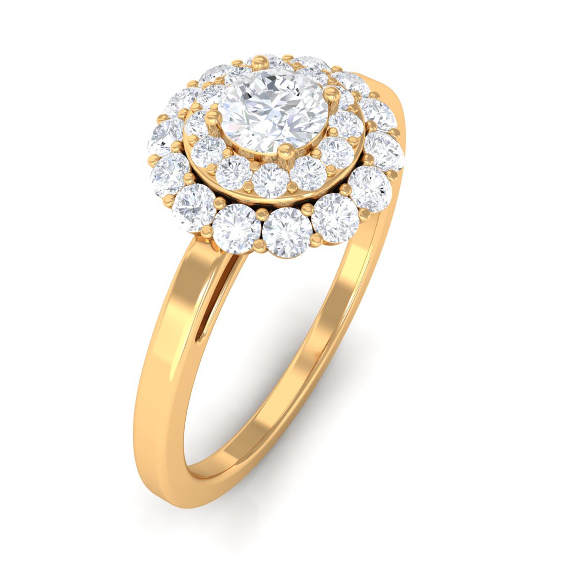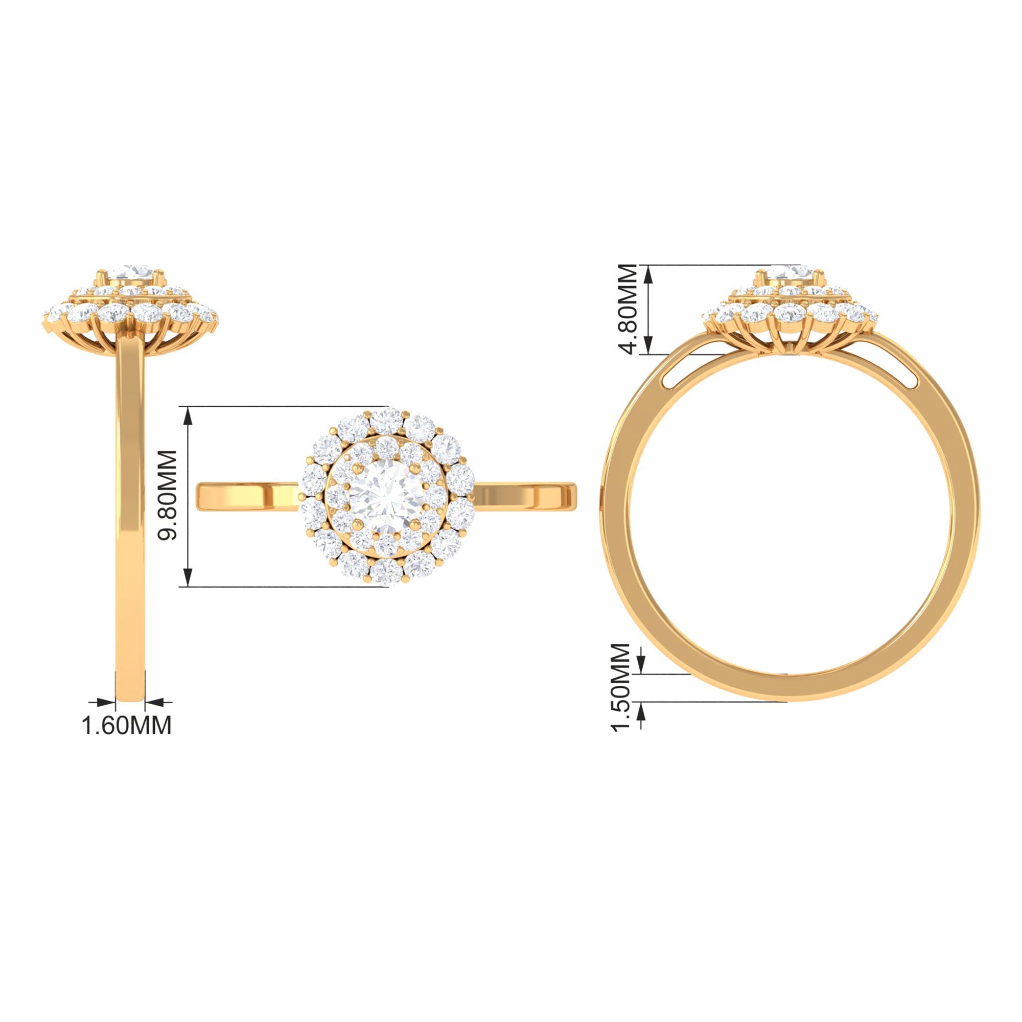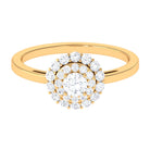 This Vintage Inspired Ring features Round Shape Zircon in Prong Setting encircled with Double Halo. The Cubic Zirconia Ring is crafted with gold metal and has a unique and luxurious design that adds a touch of elegance and sophistication to any outfit. The double halo design adds an extra level of sparkle and shine, making this CZ Ring a perfect statement piece for special occasions.