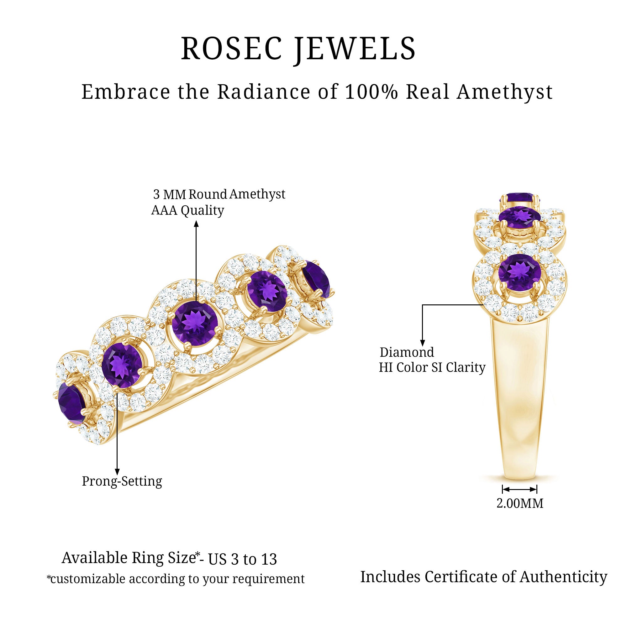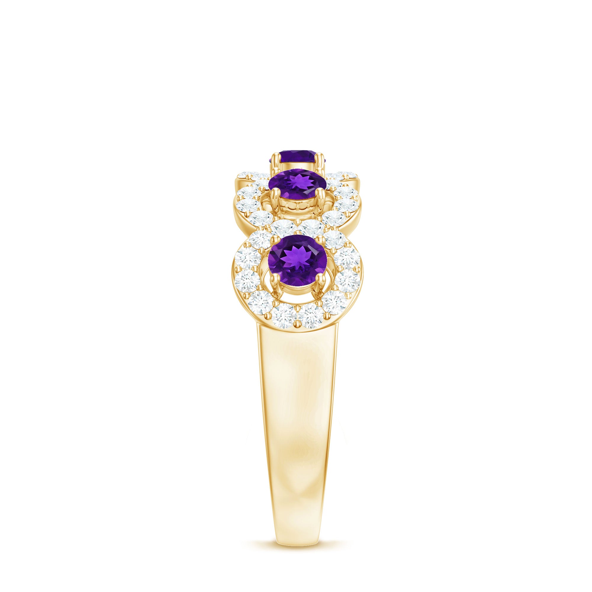 Celebrate your special day with style and elegance with this beautiful Classic Gold Band Ring. Adorned with a Round Shape Amethyst and surrounded by a halo of shimmering Diamond, this Amethyst Band Ring is the perfect choice for a woman who loves classic and timeless pieces of jewelry. Make your day even more memorable with this gorgeous ring.