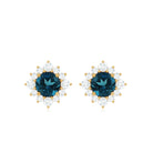 Look as stunning as ever while flaunting this pair of Halo Stud Earrings featuring a Round Shape London Blue Topaz Gemstone in the center set in prong setting encircled by a Halo of sparkling Round Shape Diamond. The Classic Stud Earrings beautifully crafted in Solid Gold will make you the center of attraction at all your parties.
