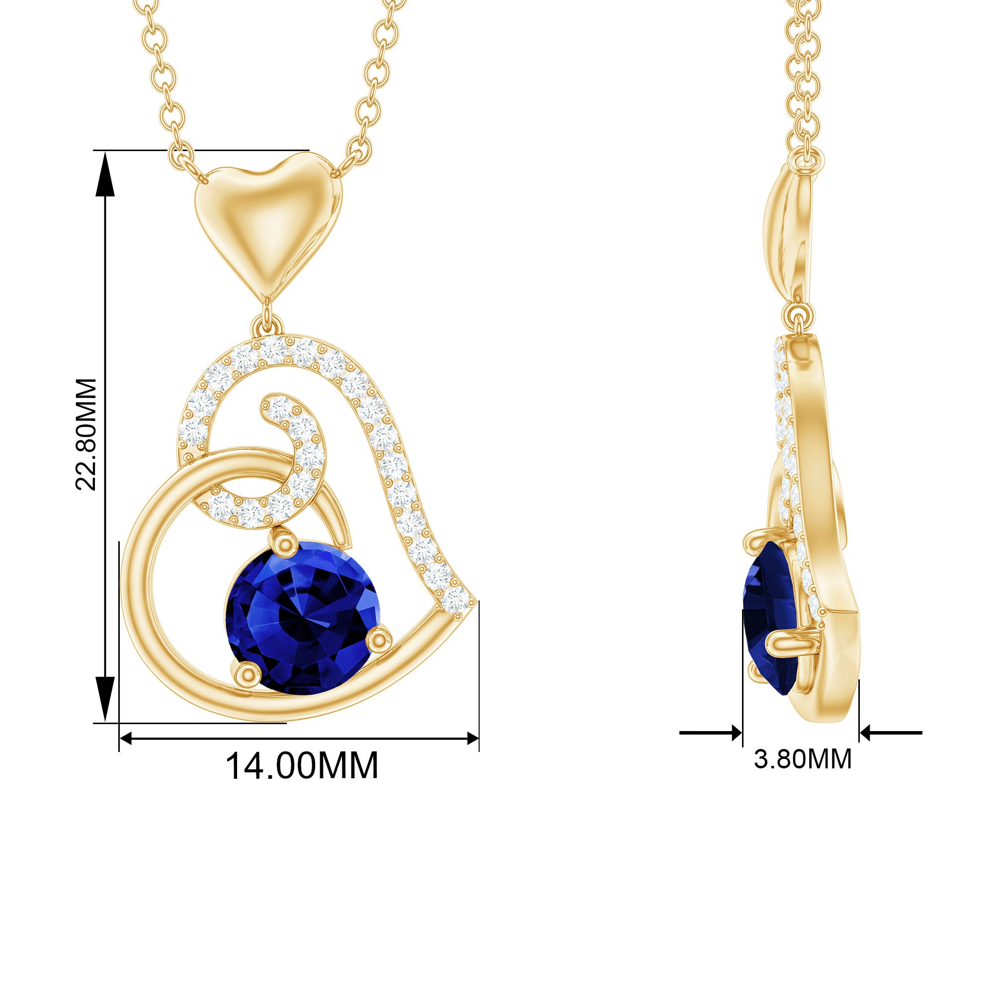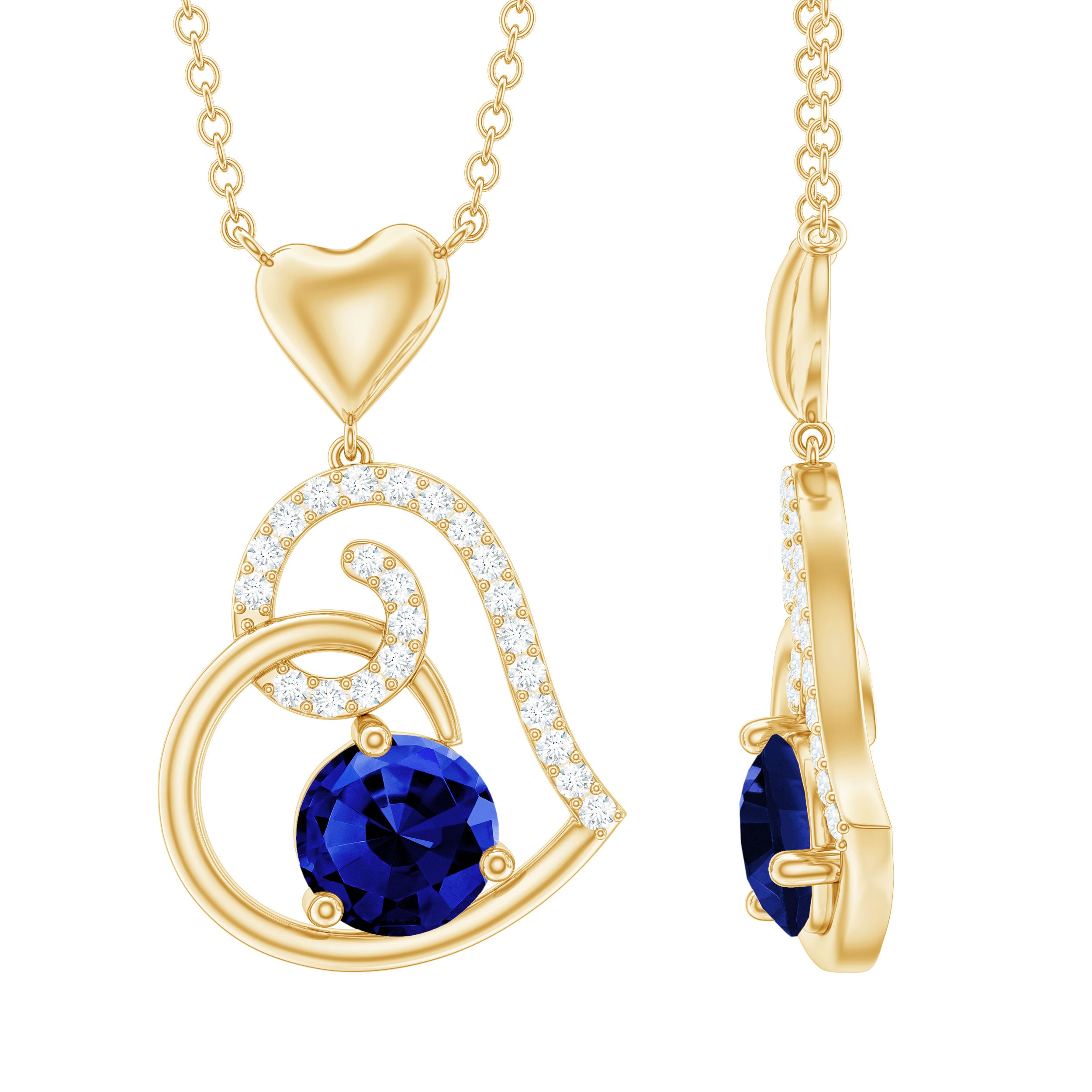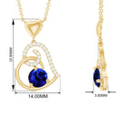 Be Dazzle with these beautiful Heart Drop Pendant embellished with Round Shape Created Blue Sapphire as Solitaire in 3 Prong Setting and Round Shape Diamond in Prong Setting, Crafted in Solid Gold.
